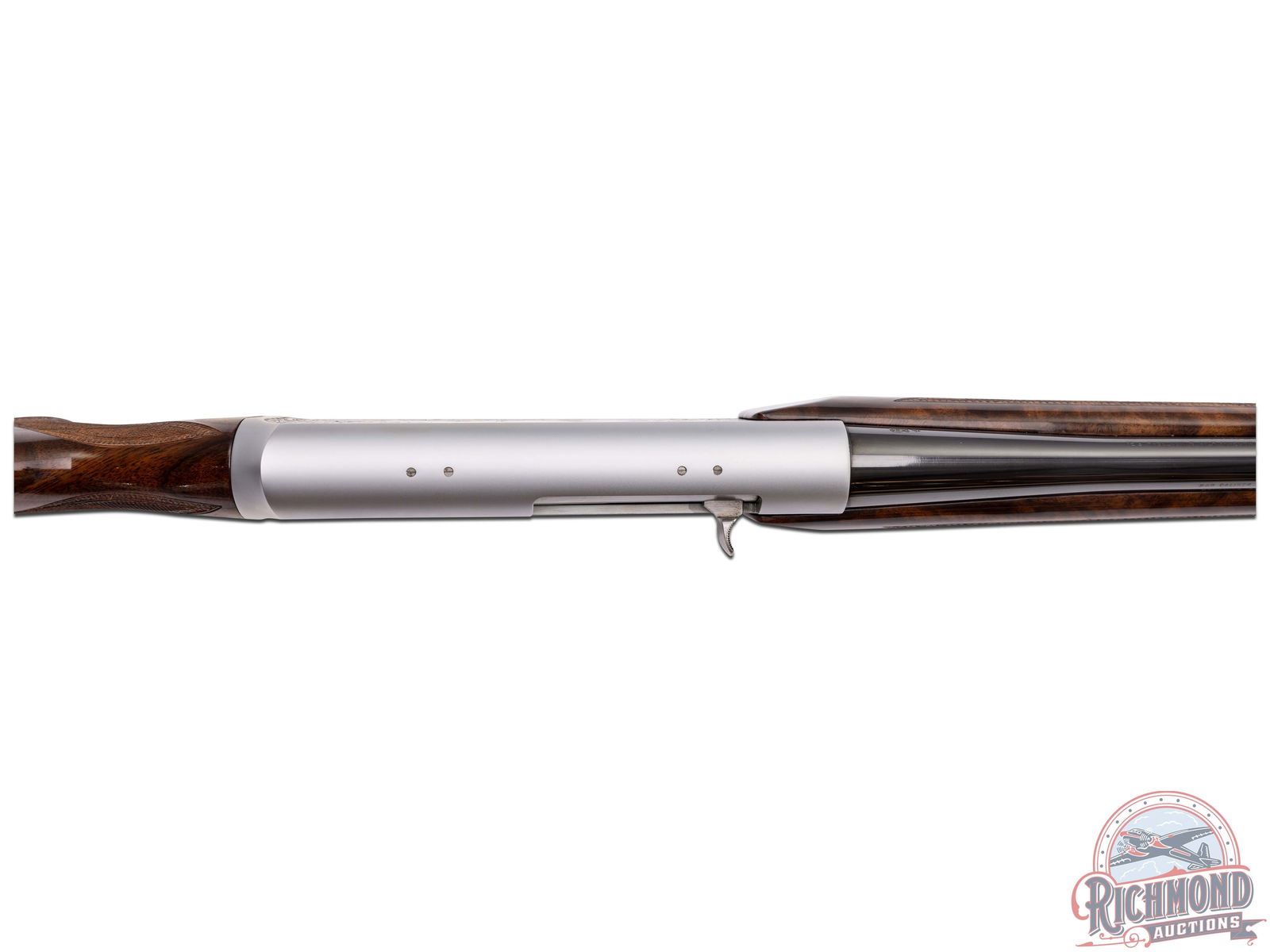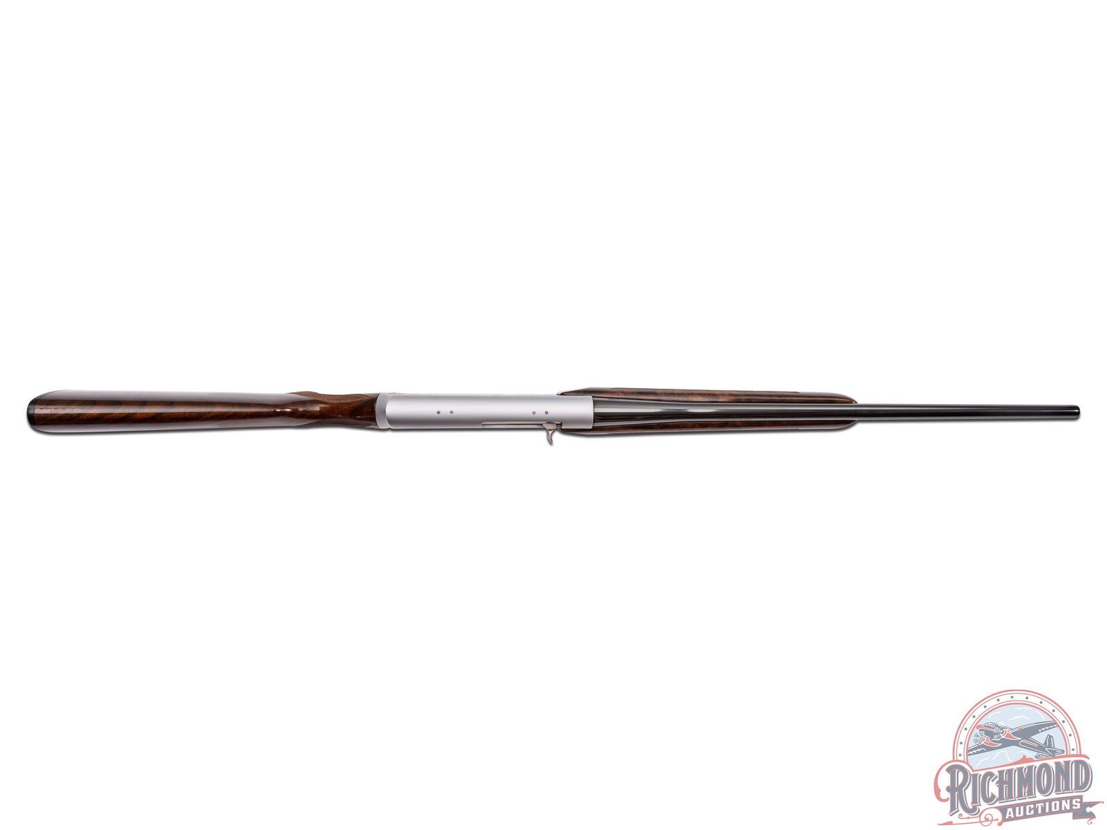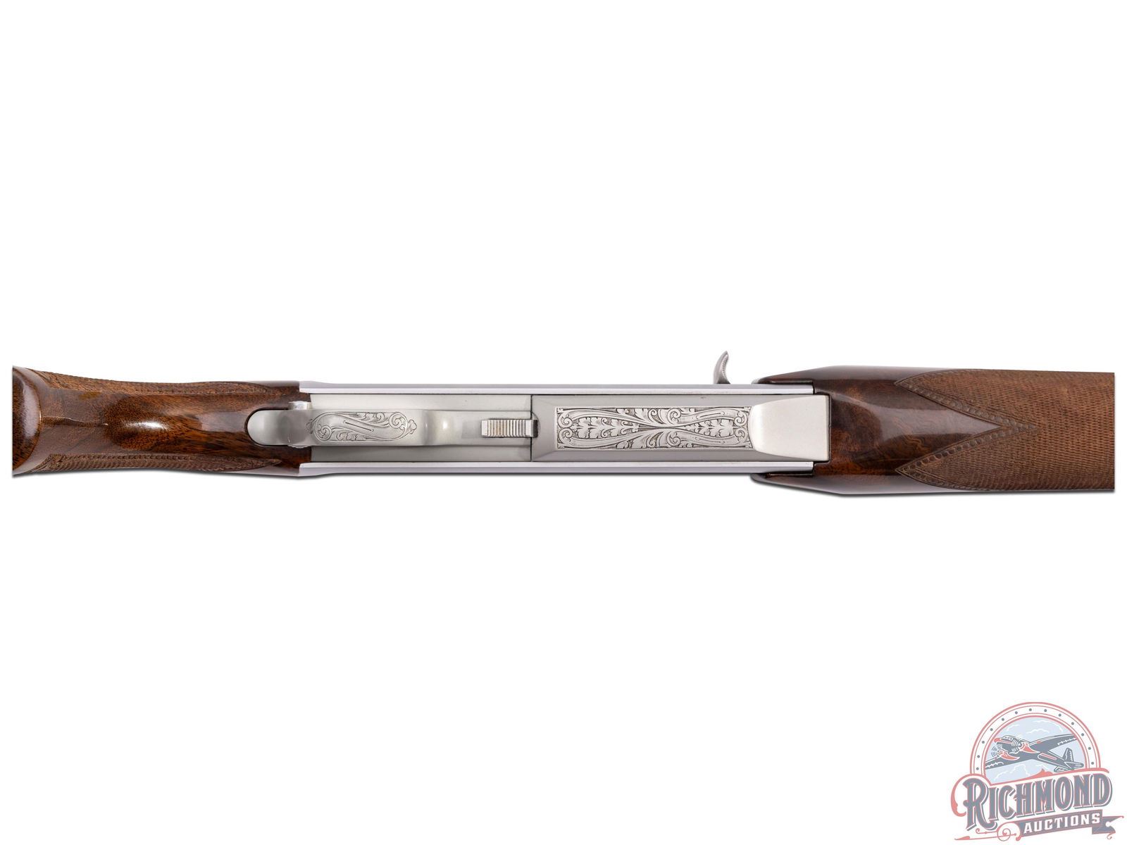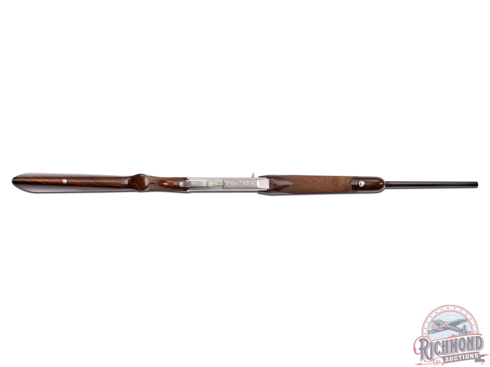 Made in Herstal, Belgium by Browning in 1980. 22" blued sightless round tapered barrel with Browning Utah and Montreal addresses on 270 Winchester caliber. Satin finish engraved receiver with antelope scene on right and deer scene on left and floral detachable magazine scene. Receiver is engraver signed on left with "J. Bague". Action is factory drilled and plugged with screws for scope mounting and has gold washed trigger and matching detachable magazine. Walnut checkered pistol grip stock with leaf and chain carved border with "Browning" hard rubber butt plate. Matching walnut checkered forearm with floral and chain carved border. Stock is fitted with satin finished quick detachable sling swivel studs. LOP: 13-5/8". DAC: 1-5/8". DAH: 2". CALIBER: 270 Winchester. S/N: 437PM02549. FFL STATUS: Modern.