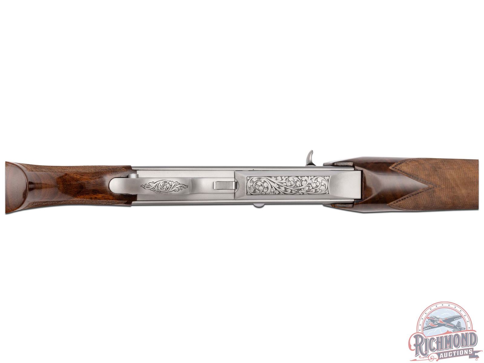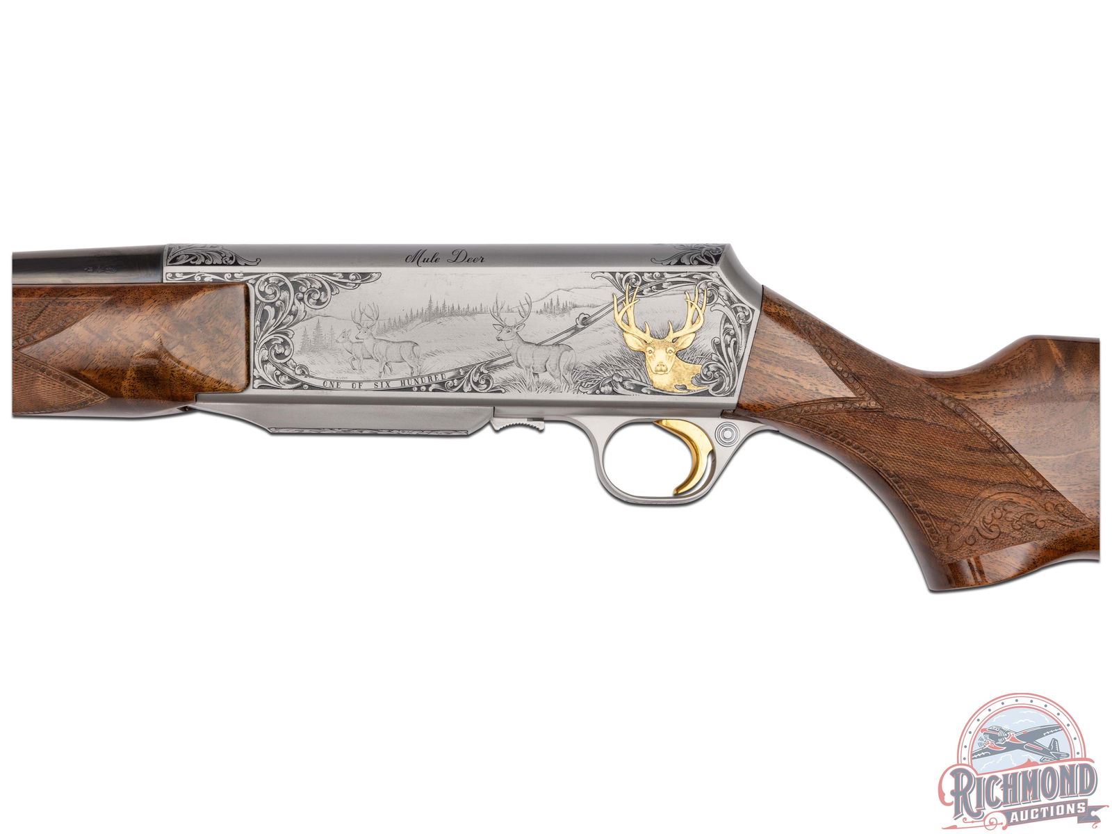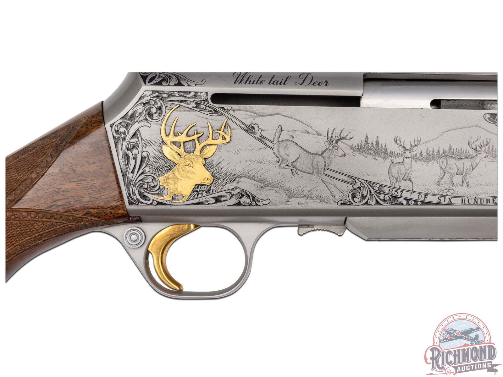 Manufactured in 1982 in Belgium by FN for Browning. Limited Edition North American Deer, numbered 237 of Six Hundred. Features a 22" blued tapered sightless barrel. Coin finished receiver with detachable magazine, cross bolt safety and gold washed trigger. Top of the receiver is factory drilled and tapped with floral scroll engraving at front and rear. Left side features three mule deer on a hillside scene with floral scroll design on each side and a gold embossed mule deer bust. Banner is stamped "ONE OF SIX HUNDRED". On the top of the left side its stamped "Mule Deer". Right side features three whitetail deer on a hillside scene with floral scroll design on each side and a gold embossed whitetail deer bust. Banner is stamped "257 OF SIX HUNDRED". On the top right side, its stamped "White tail Deer". Matching floral scroll engraving on the bottom of the trigger guard and factory magazine. Master engraver Ed Vos' signature "E.Vos" is on both sides of the receiver. Beautiful figured high gloss walnut stock and forearm. Checkered pistol grip and forearm with stunning dotted and floral scroll carved borders. Fitted with satin nickel swivel studs and factory Browning butt plate. Comes in a nice walnut, red velvet lined fitted display case. LOP: 13-1/2". CALIBER: 30-06 SRPG. S/N: 437PY00257. FFL STATUS: Modern.