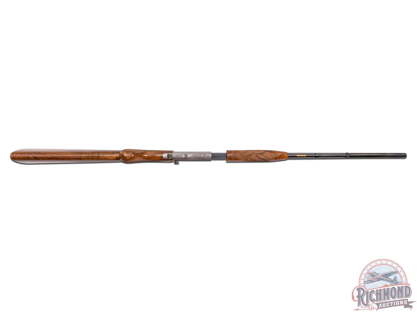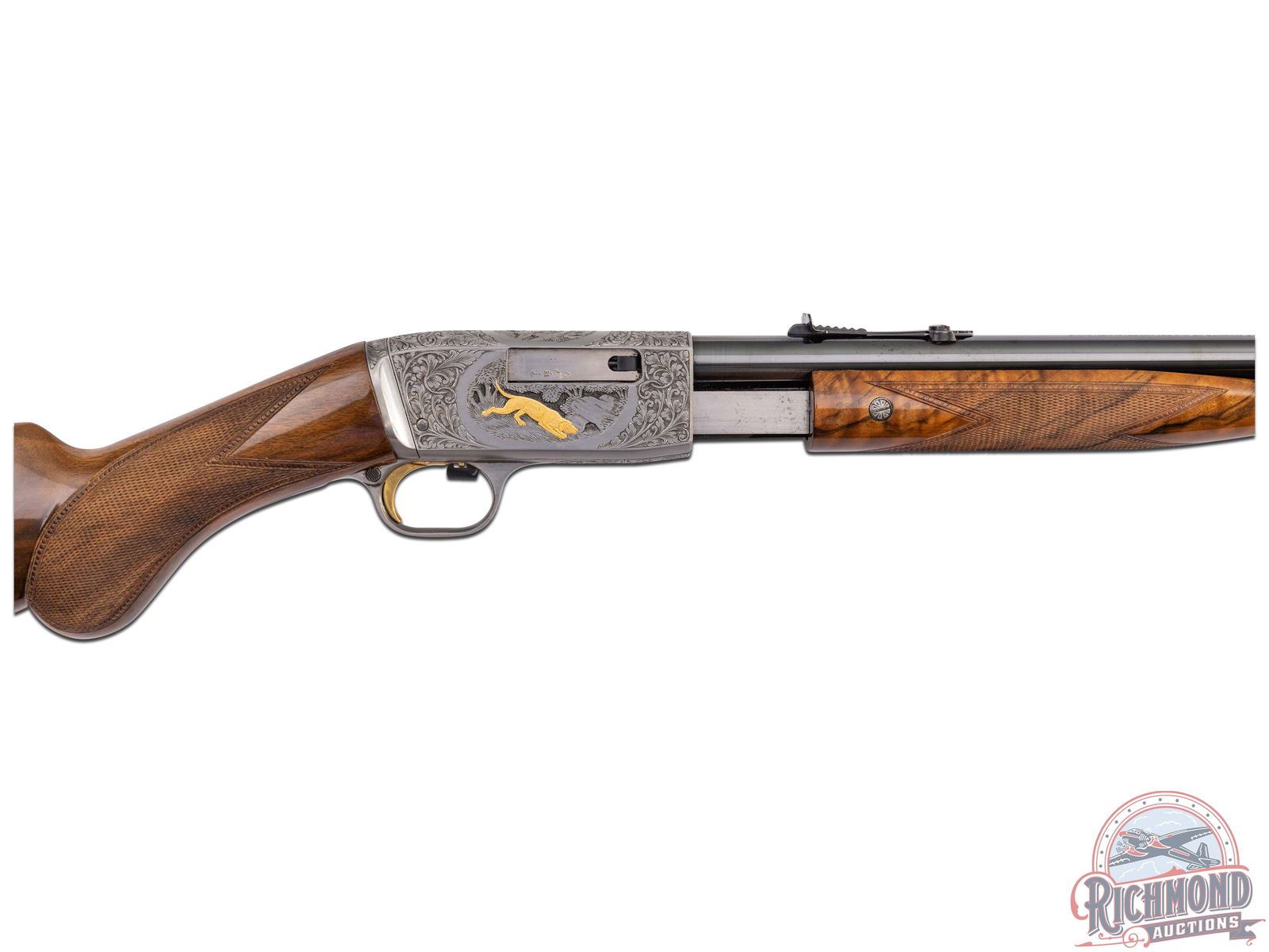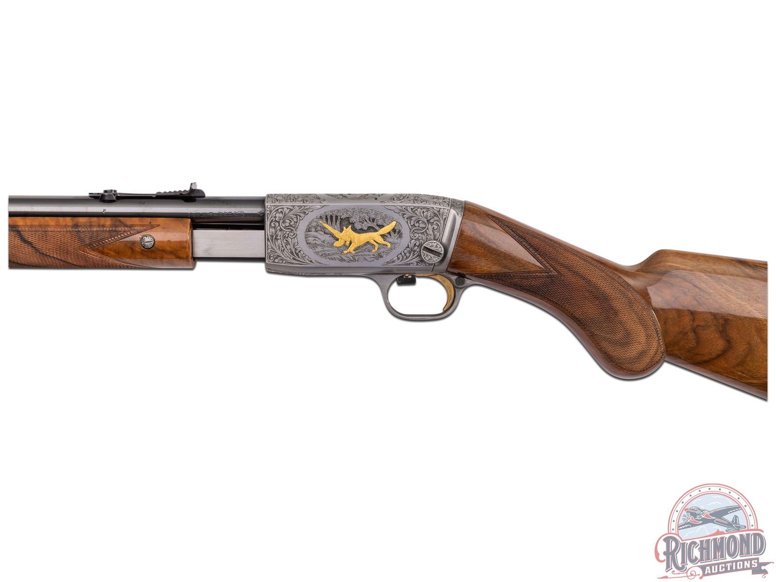 Made in Herstal, Belgium by browning in 1971. Most likely a custom shop rifle done by Master Gunsmith Angelo Bee. 22" blued round barrel with pedestal front sight and stamped metal notch adjustable rear sight with "Browning Patent-Depose" F.N. export address with Belgium Proofs in 22 Long caliber. Satin finish Grade III takedown frame with smooth top receiver, gold washed trigger and blued safety and slide release buttons. Receiver is floral engraved with gold dog examining under a log on right, a pheasant and floral scene on top and a floral scene with gold fox with pheasant in mouth scene. Light tone walnut round knob pistol grip stock with 18 line per inch checkering with carved chain border and checkered wood butt. Matching tapered walnut checkered slide handle with blued tubular magazines. Rare gun with few imported and will be pictured in the up and coming Angelo Bee Engraving Book. LOP: 13-1/2". DAC: 1-3/4". DAH: 2-3/4". CALIBER: 22L. S/N: 140345. FFL STATUS: Curio & Relic.
