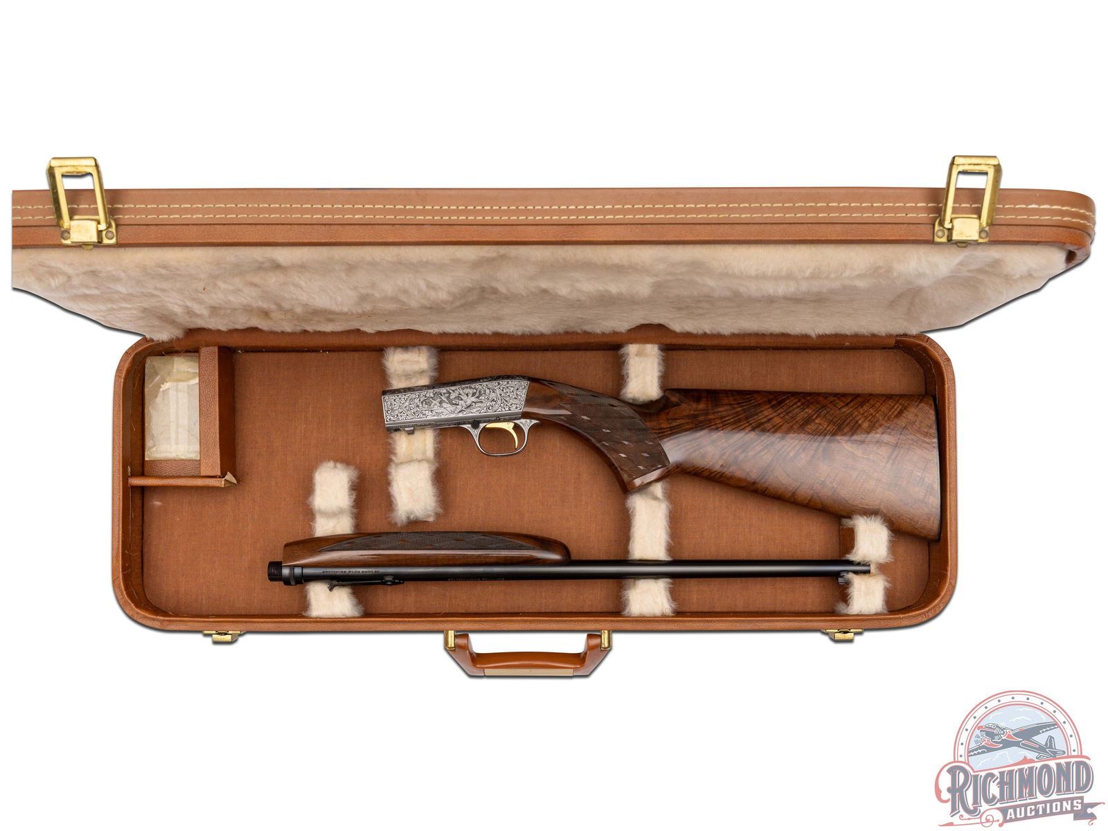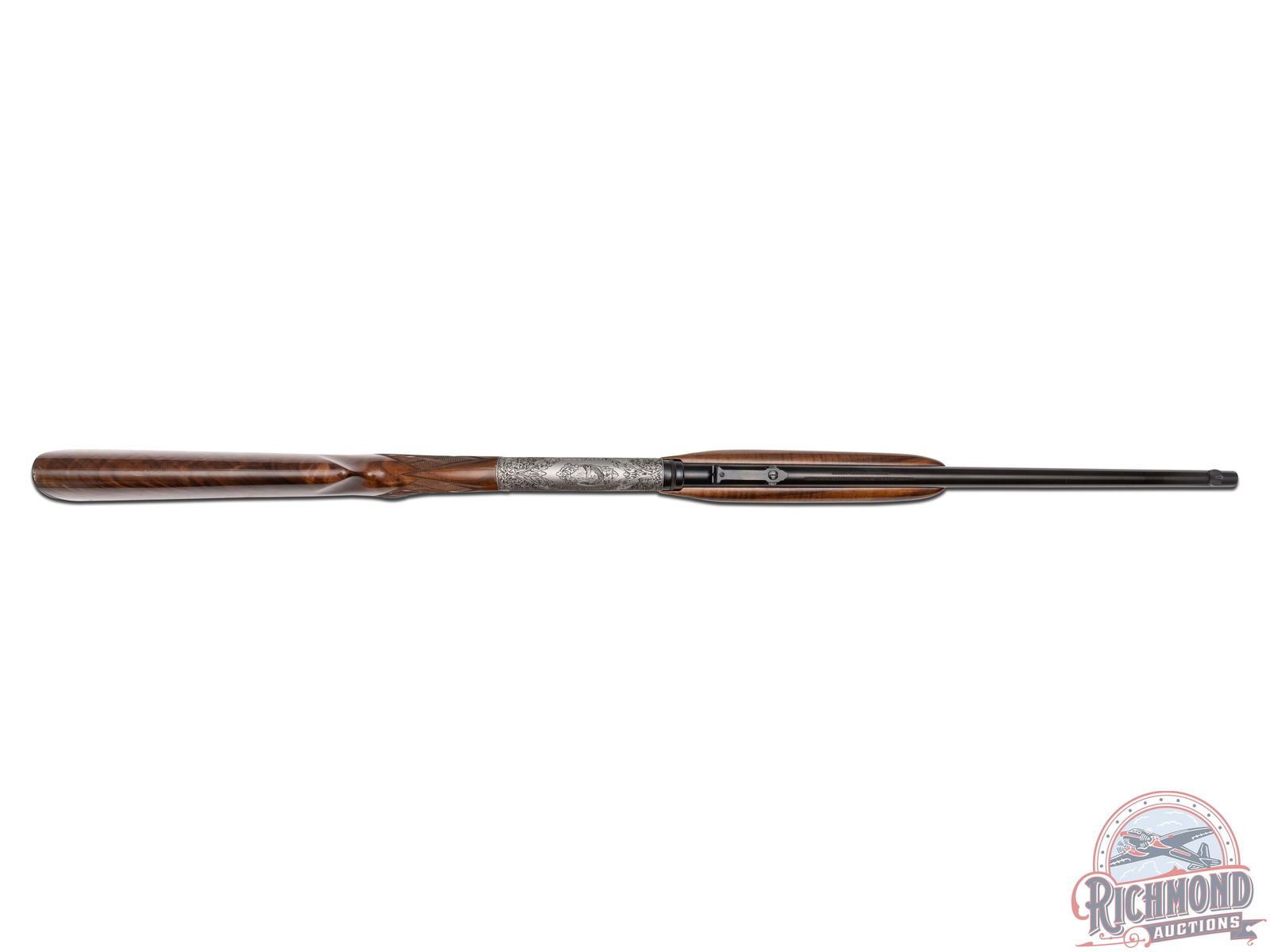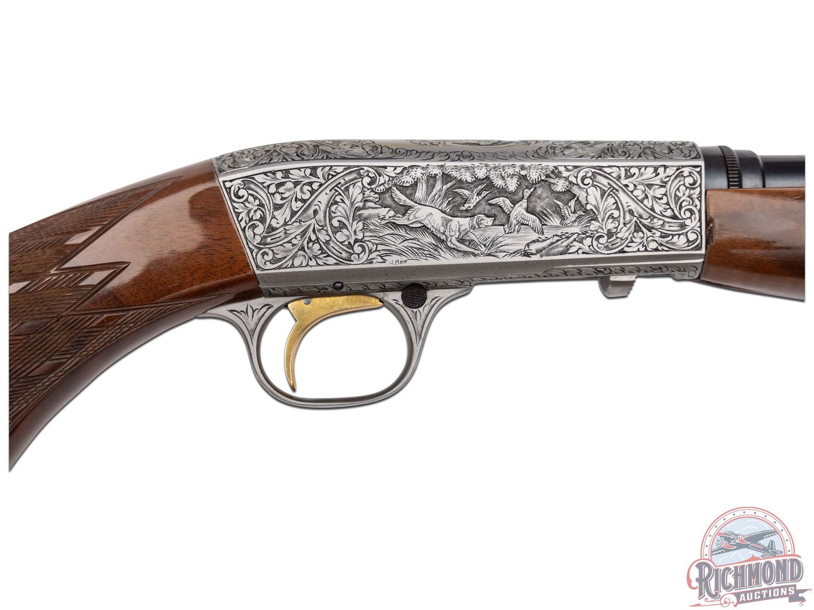 Manufactured in Belgium by FN, this unusual automatic does not have a letter pre or suffix in the serial number. Features a 19-1/4" blued barrel with rear notch sight and blade front sight. Coin finished receiver and trigger guard with 90% engraving. Left side features a setter flushing pheasants surrounded by a floral scroll design. Top features a retriever with a duck in its mouth framed by a floral scroll design. Right side features a setter flushing mallards in a pond scene surrounded by matching floral scroll design. Both sides of the receiver and the bottom of the barrel is signed "A.BEE". Gold washed trigger, crossbolt safety with floral design engraved on bottom of trigger guard. Grade III figured walnut stock with side loading magazine and matching forearm with skip-line checkering on the pistol grip and forearm. Fitted with a steel butt plate. Comes in a Browning factory case. This Angelo Bee design is featured on page 334 of the "Browning, Sporting Arms of Distinction" book by Matt Eastman. LOP: 13-3/4". CALIBER: 22 LR. S/N: 93332. FFL STATUS: Curio & Relic.