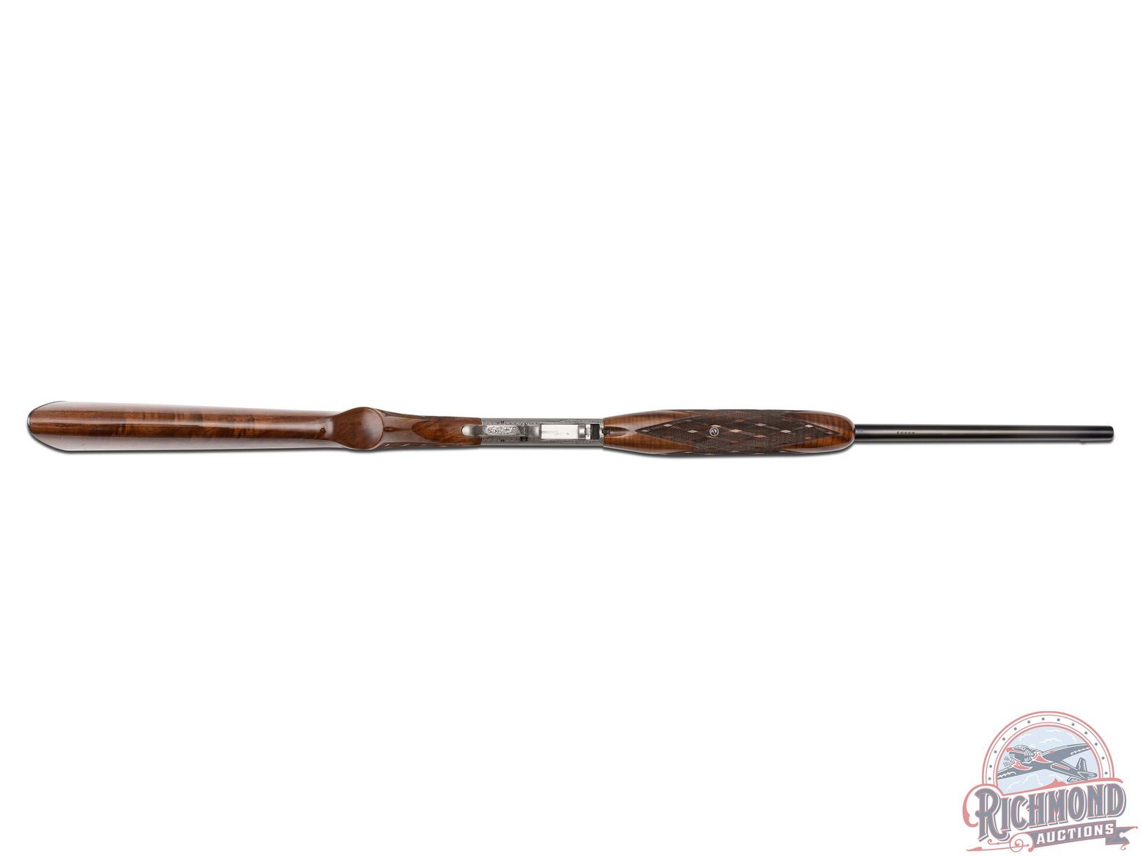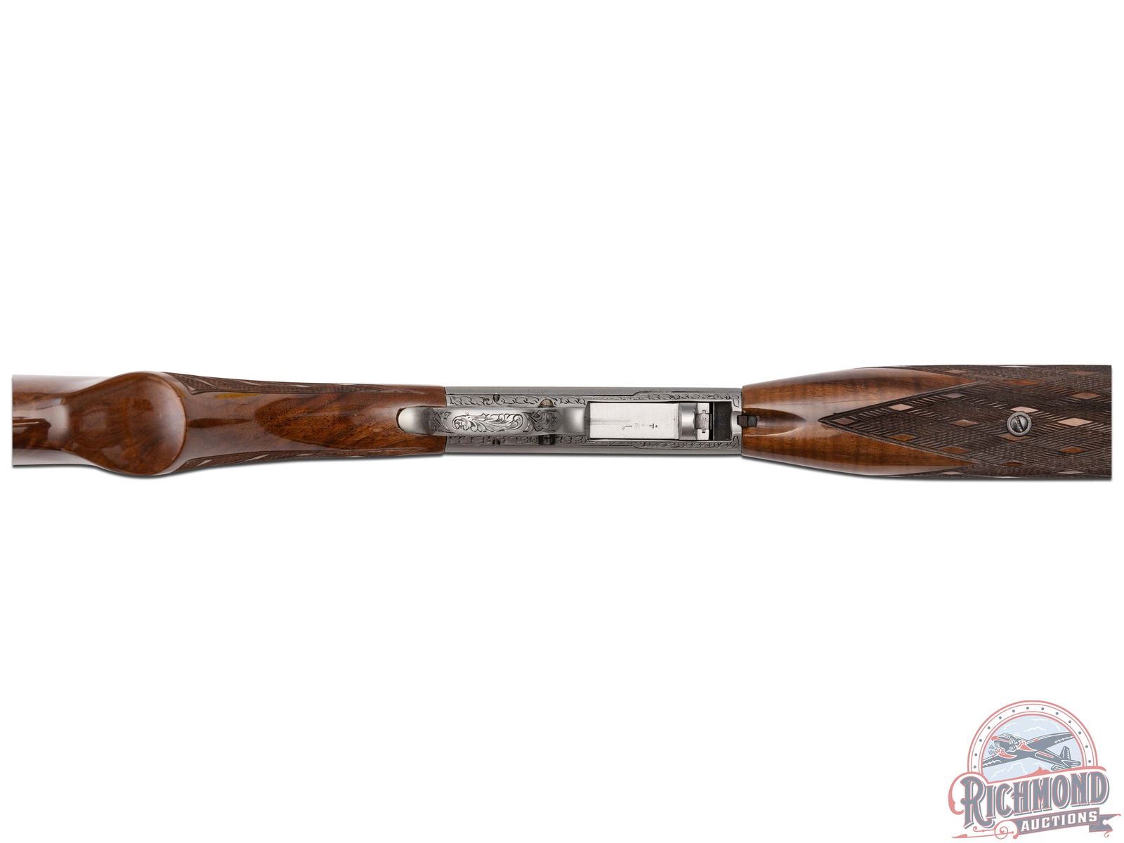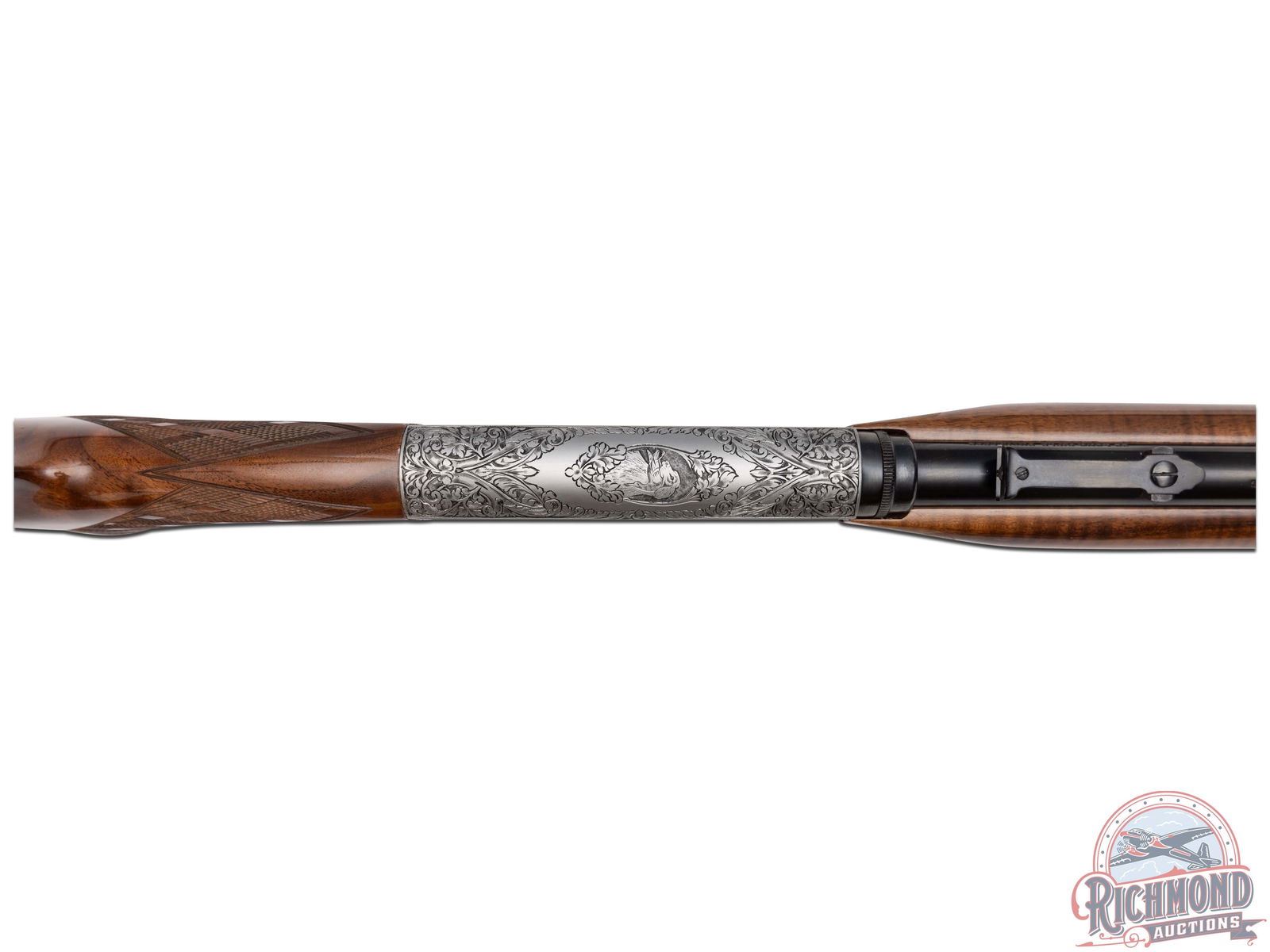 Manufactured in Belgium by FN, this unusual automatic does not have a letter pre or suffix in the serial number. Features a 19-1/4" blued barrel with rear notch sight and blade front sight. Coin finished receiver and trigger guard with 90% engraving. Left side features a setter flushing pheasants surrounded by a floral scroll design. Top features a retriever with a duck in its mouth framed by a floral scroll design. Right side features a setter flushing mallards in a pond scene surrounded by matching floral scroll design. Both sides of the receiver and the bottom of the barrel is signed "A.BEE". Gold washed trigger, crossbolt safety with floral design engraved on bottom of trigger guard. Grade III figured walnut stock with side loading magazine and matching forearm with skip-line checkering on the pistol grip and forearm. Fitted with a steel butt plate. Comes in a Browning factory case. This Angelo Bee design is featured on page 334 of the "Browning, Sporting Arms of Distinction" book by Matt Eastman. LOP: 13-3/4". CALIBER: 22 LR. S/N: 93332. FFL STATUS: Curio & Relic.