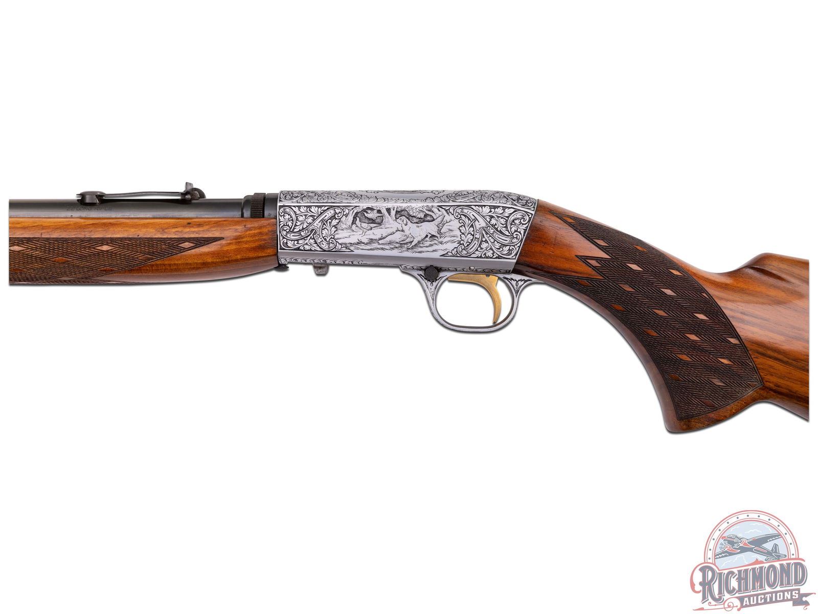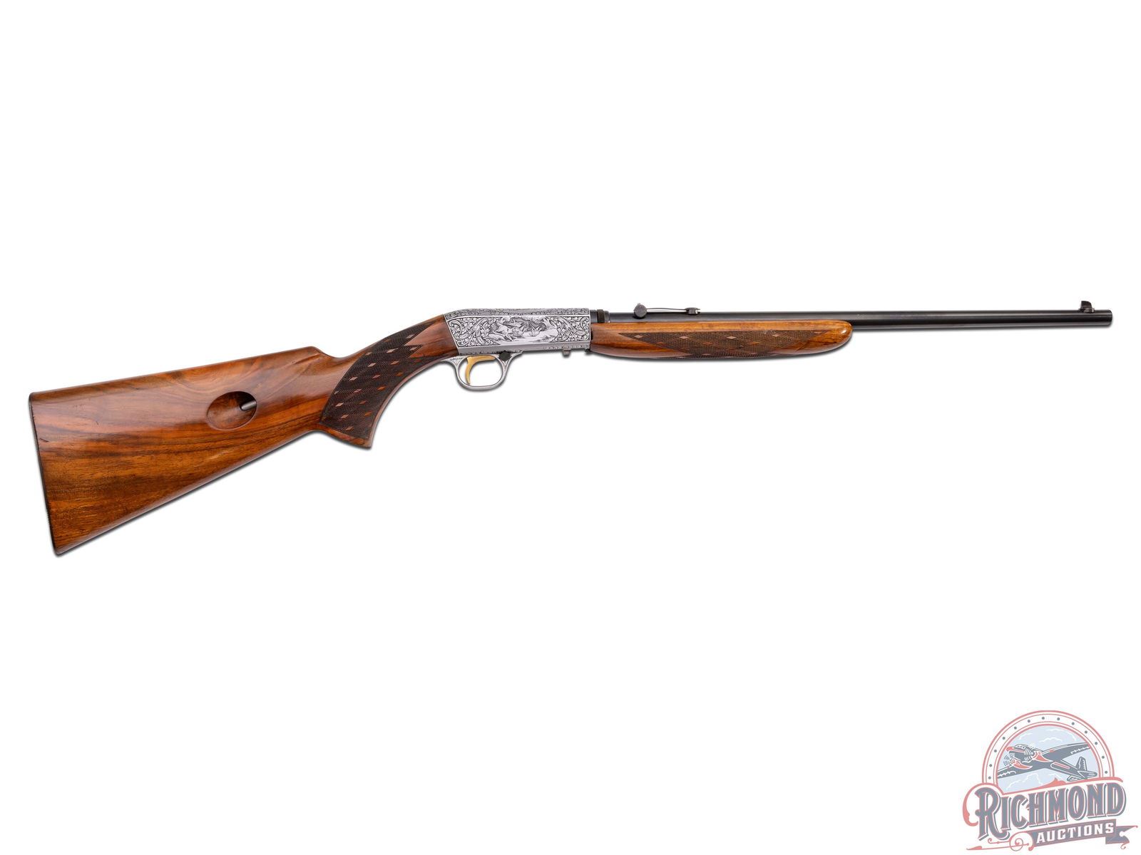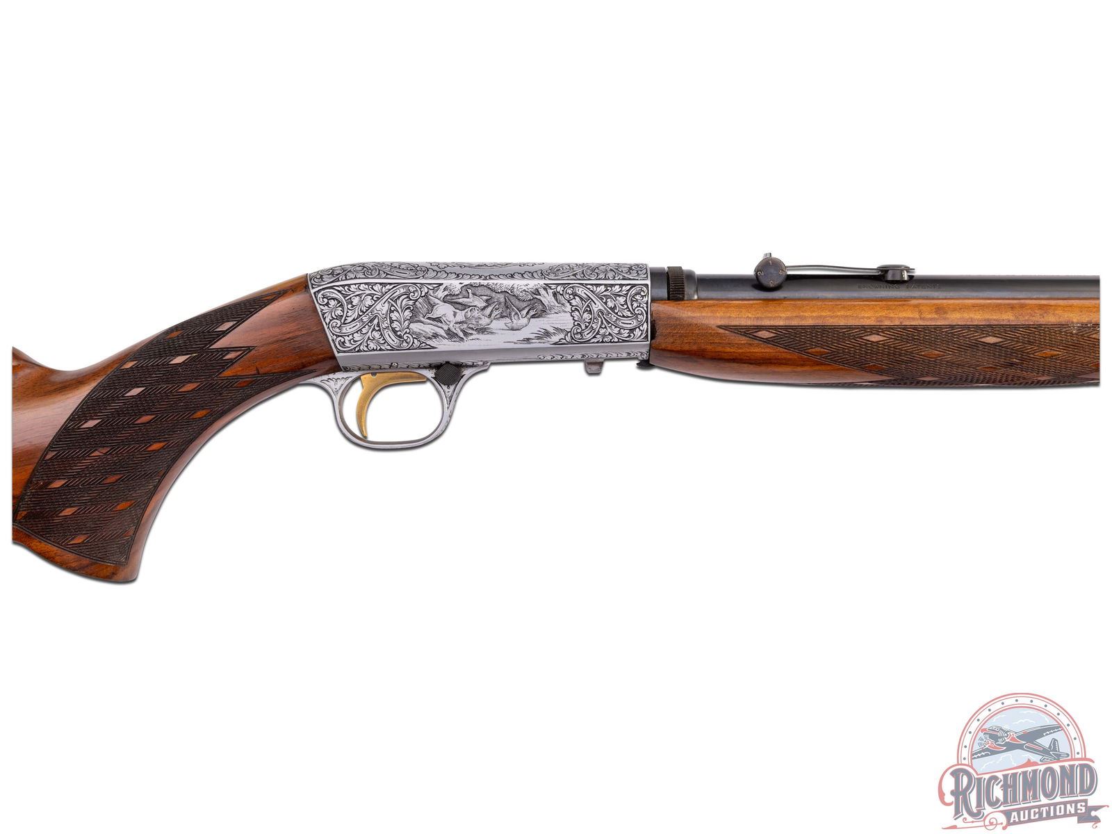 Made in Herstal, Belgium by Browning in 1956. Early 1st year importation of this model. 19-1/4" blued round barrel with bead pedestal front sight and desirable early "Wheel" rear sight in 22 Long Rifle caliber with Browning St. Louis, Missouri address. Satin finished Grade III style engraved takedown receiver with dog and bird scenes with no engraver signature. Early guns could possibly be engraved by Felix Funken. Light tone walnut skip-line checkered pistol grip stock with side loading and blued steel serrated butt plate. Matching walnut swelled skip-line checkered forearm. LOP: 13-3/4". DAC: 1-3/16". DAH: 2-5/8". CALIBER: 22LR. S/N: T7745. FFL STATUS: Curio & Relic.