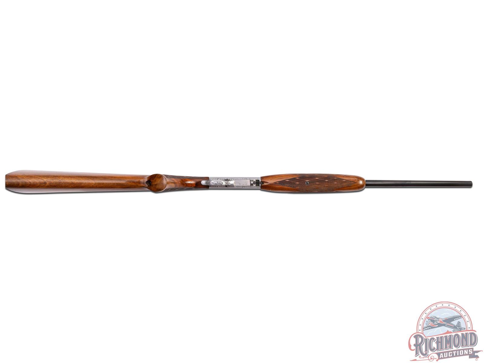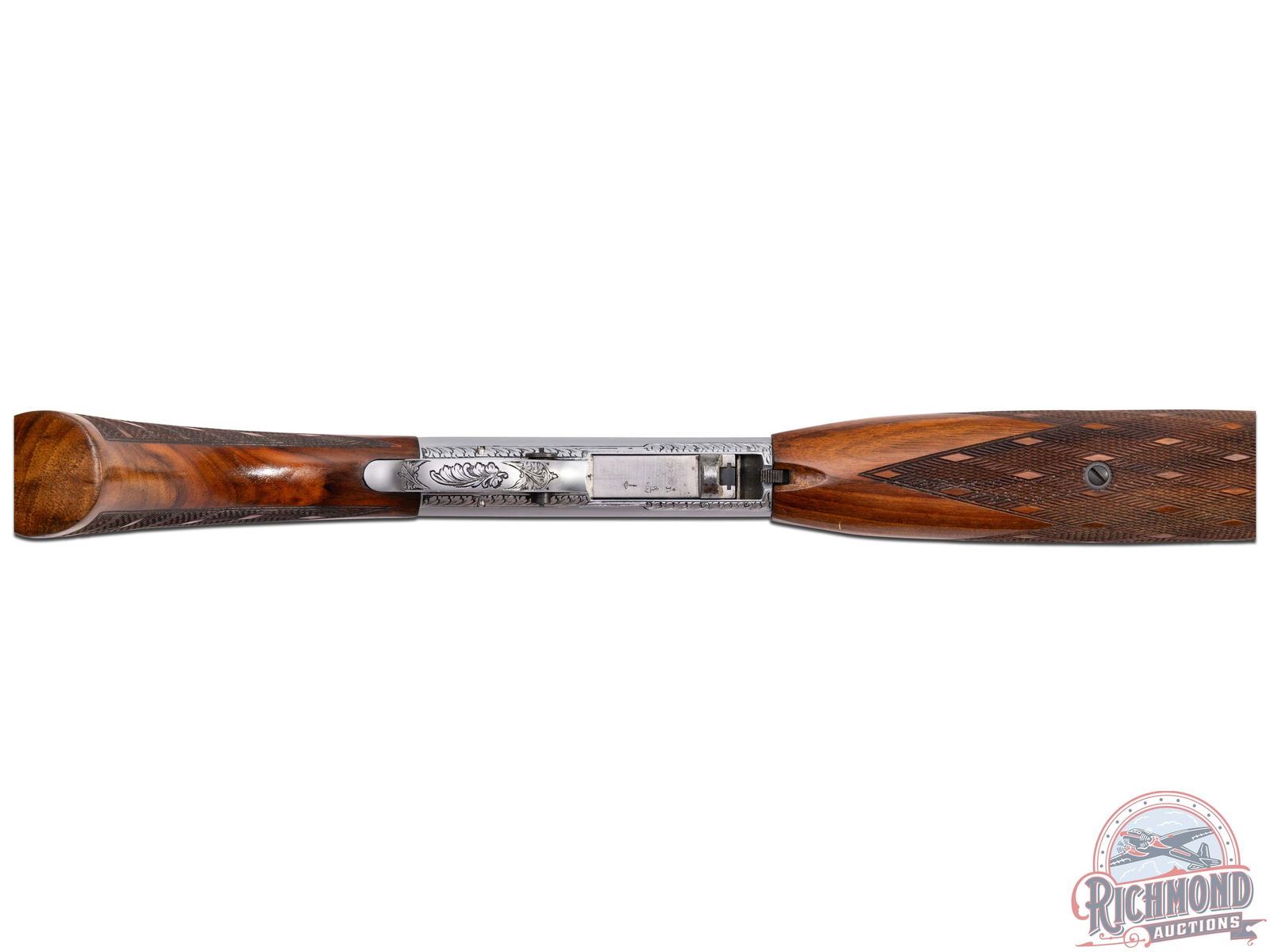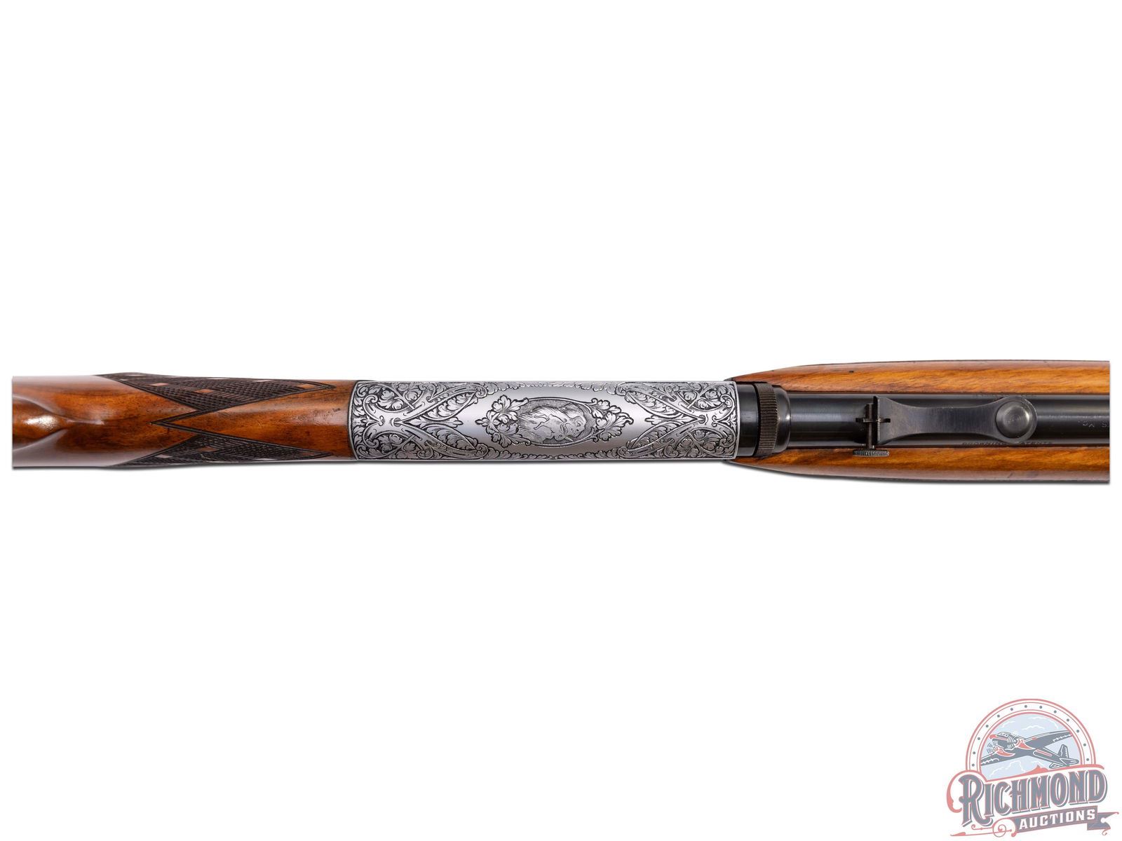 Made in Herstal, Belgium by Browning in 1956. Early 1st year importation of this model. 19-1/4" blued round barrel with bead pedestal front sight and desirable early "Wheel" rear sight in 22 Long Rifle caliber with Browning St. Louis, Missouri address. Satin finished Grade III style engraved takedown receiver with dog and bird scenes with no engraver signature. Early guns could possibly be engraved by Felix Funken. Light tone walnut skip-line checkered pistol grip stock with side loading and blued steel serrated butt plate. Matching walnut swelled skip-line checkered forearm. LOP: 13-3/4". DAC: 1-3/16". DAH: 2-5/8". CALIBER: 22LR. S/N: T7745. FFL STATUS: Curio & Relic.