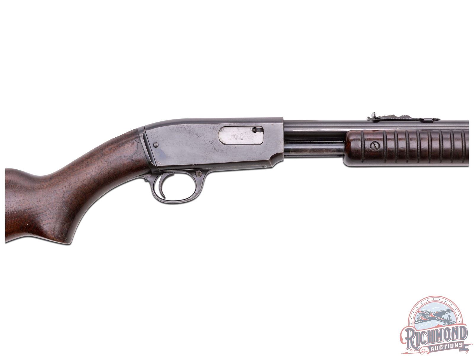Manufactured in 1950. Features a 24" blued round barrel with factory rear notch sight with elevator and blade front sight. Factory correct stampings and Winchester proof marks. Under barrel tubular magazine and side ejecting port. Blued receiver with the iconic model 61 take-down screw. Smooth walnut wood butt stock with pistol grip and 17-line ribbed forearm. Fitted with a metal checkered butt plate. LOP: 13-1/4". CALIBER: 22 S/L/LR. S/N: 143814. FFL STATUS: Curio & Relic.