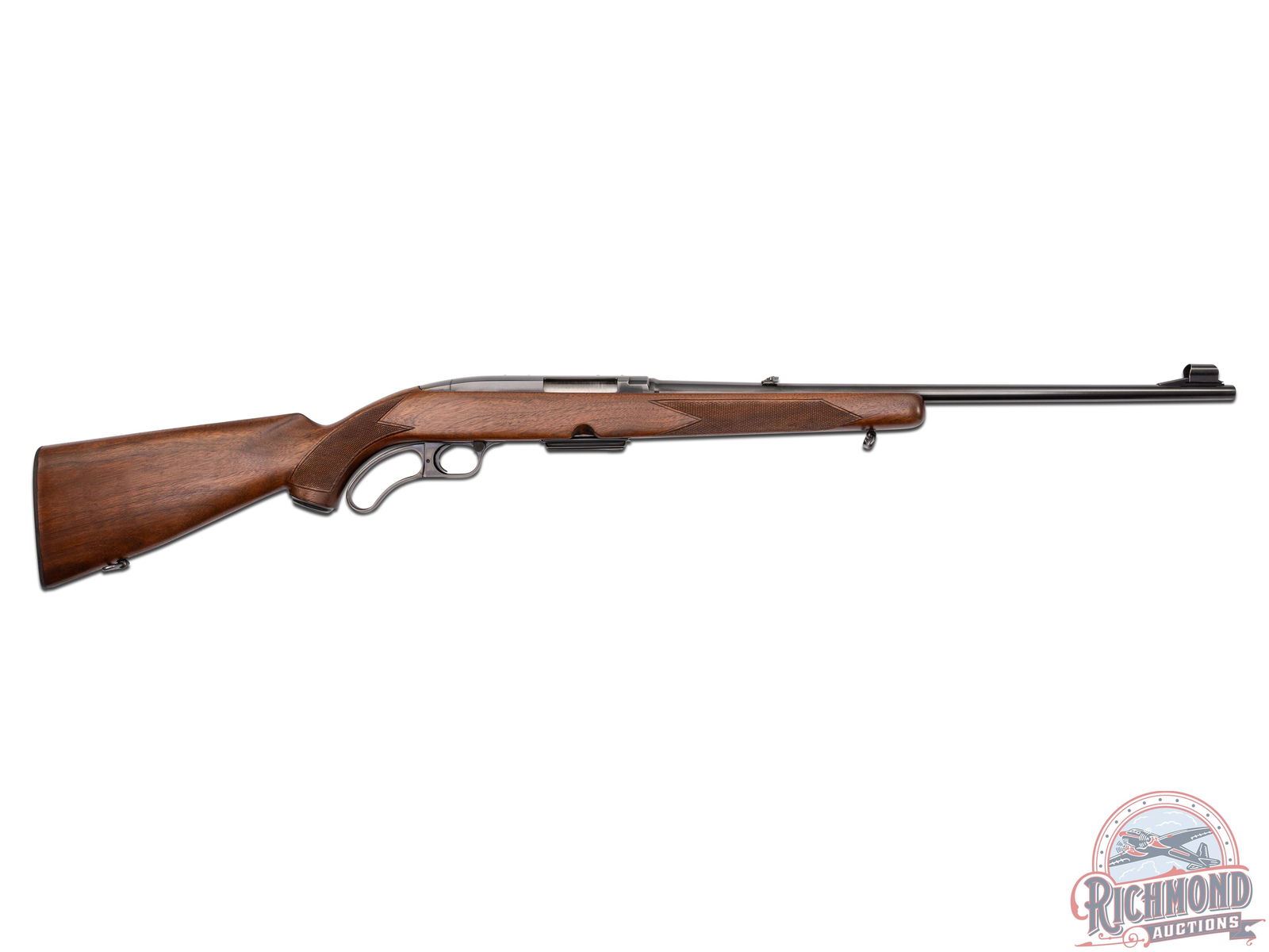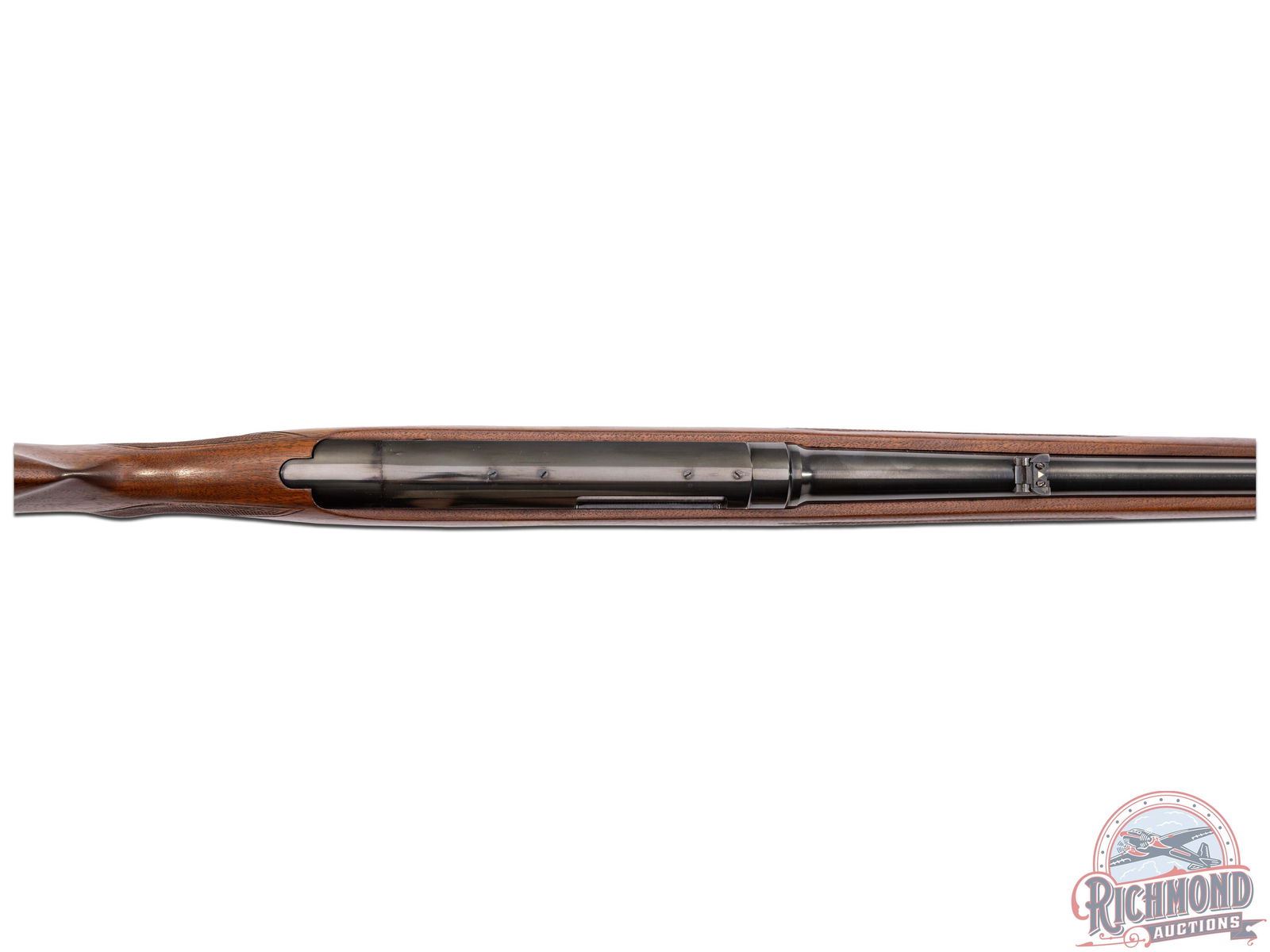 This model 88 was manufactured in 1958. Features a 22" blued tapered Winchester Proof Steel barrel with all standard factory roll marks and proof marks. Chambered in the rare 358 WIN caliber. Hooded front ramp sight and rear flip-up notch sight with white diamond insert. Blued receiver drilled and tapped for scope mount. Unique lever that actions with the trigger and crossbolt safety. Includes original factory detachable magazine. Satin walnut stock with hand checkered pistol grip, metal pistol grip cap, and matching checkered forearm. Fitted with a factory synthetic butt plate and swivel sling rings. Includes the original factory box with hanging tag. LOP: 13-3/4". CALIBER: 358 WIN. S/N: 72520. FFL STATUS: Curio & Relic.