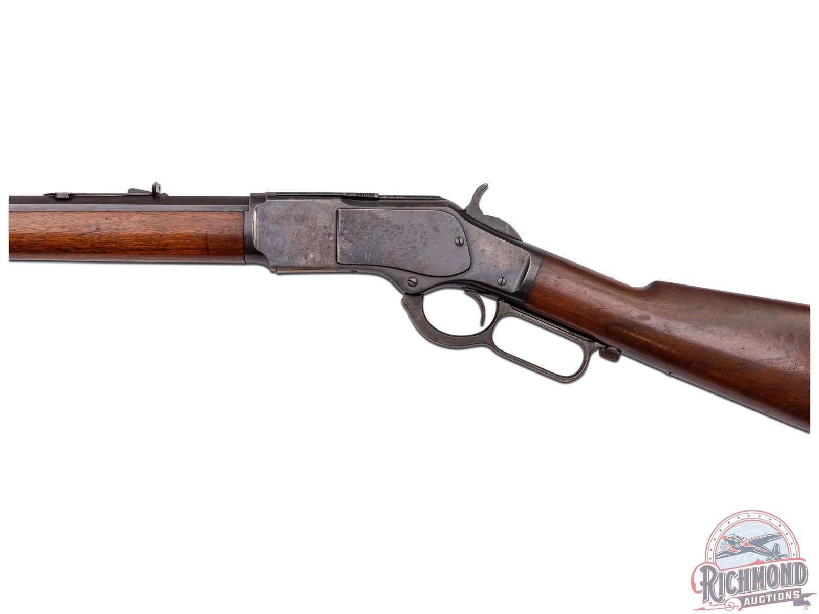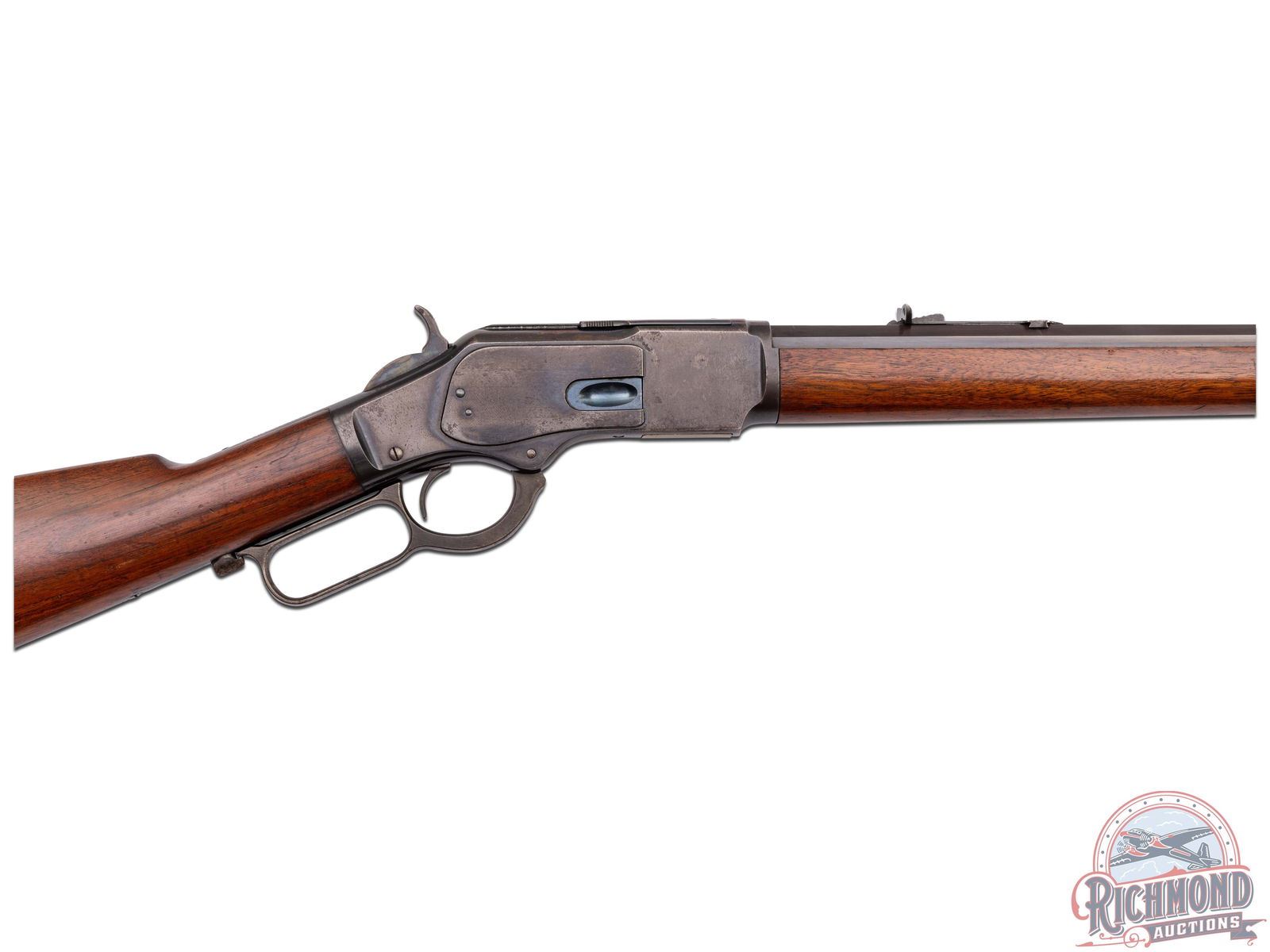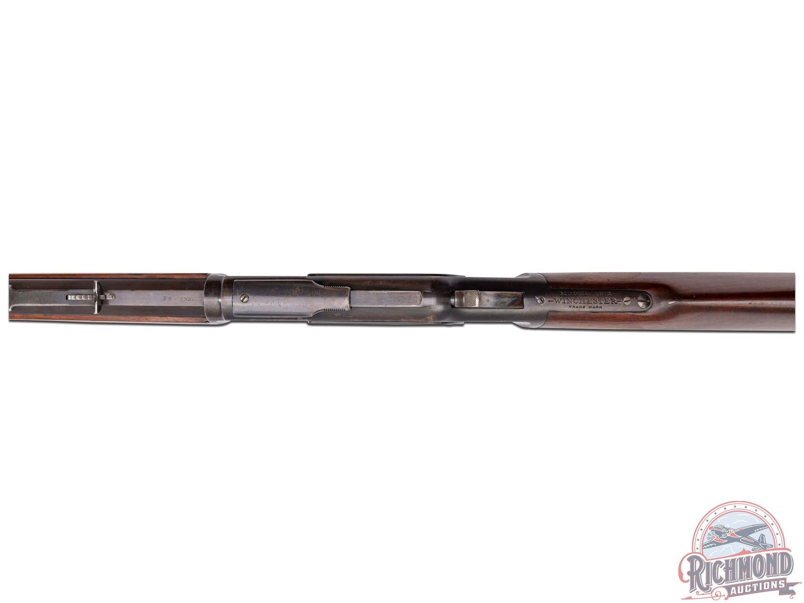Manufactured in 1905. Features a 26" octagon barrel with button magazine tube, rear elevator notch sight and brass blade front sight. The top of the barrel flat is stamped "WINCHESTER'S REPEATING ARMS, NEW HAVEN, CT / KING'S-IMPROVEMENT-PATENTED-MARCH 29, 1866. OCTOBER 16, 1860". case-hardened receiver with dust cover, side loading gate, lever lock and the iconic brass follower. Tang is stamped "MODEL 1873 / -WINCHESTER- / TRADE MARK". Walnut straight stock and matching forearm with blued end cap. Fitted with a steel butt plate with brass gate for field cleaning storage. Includes factory quick check letter. LOP: 12-1/2". CALIBER: 38 CAL. S/N: 591209. FFL STATUS: Curio & Relic.