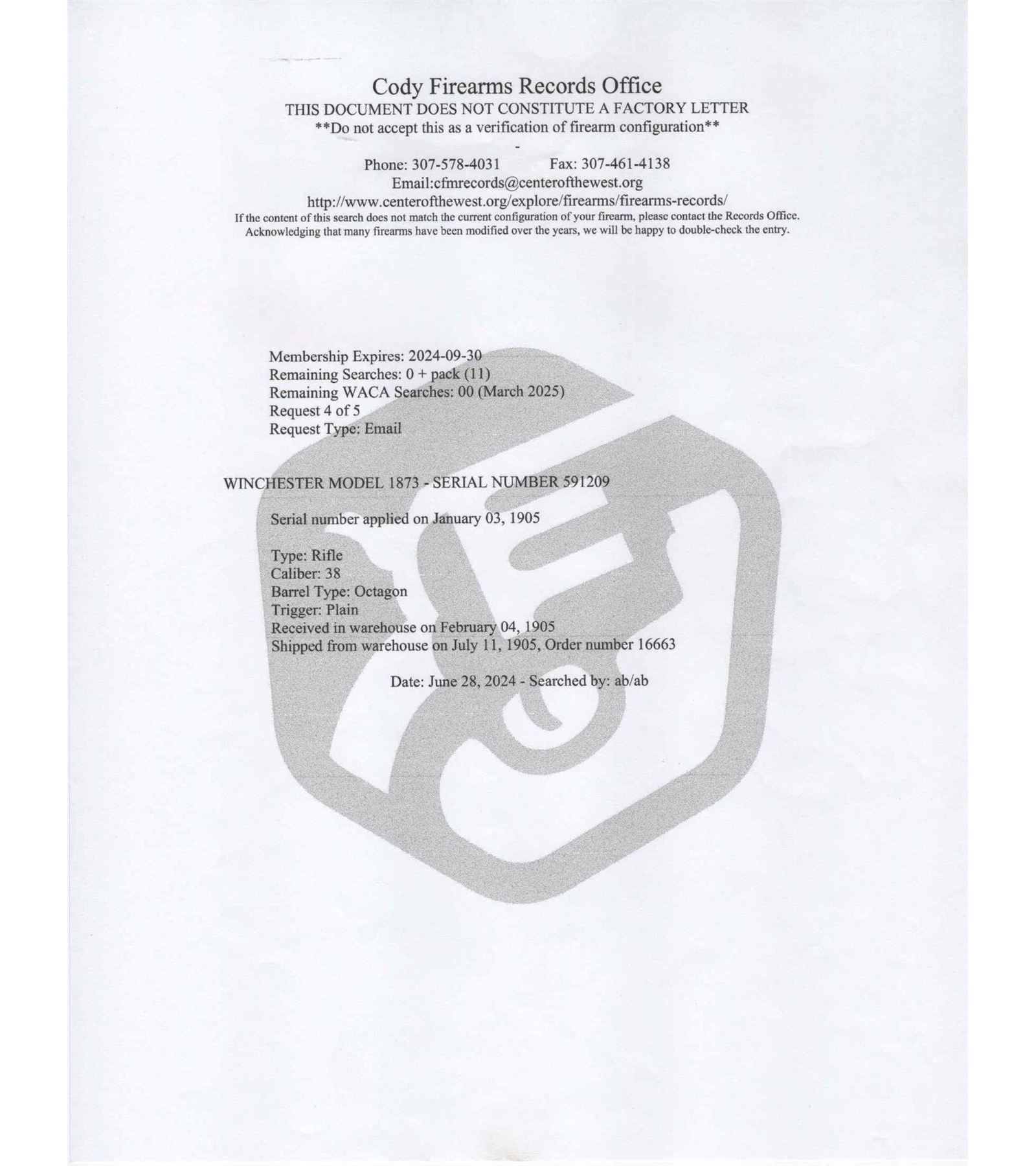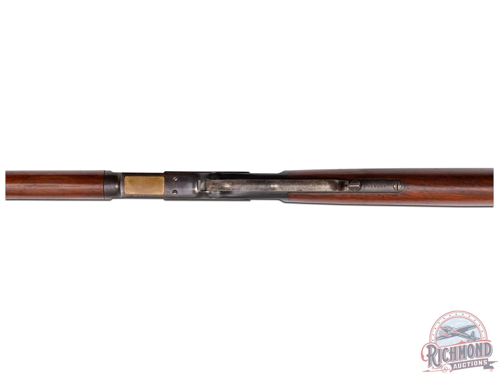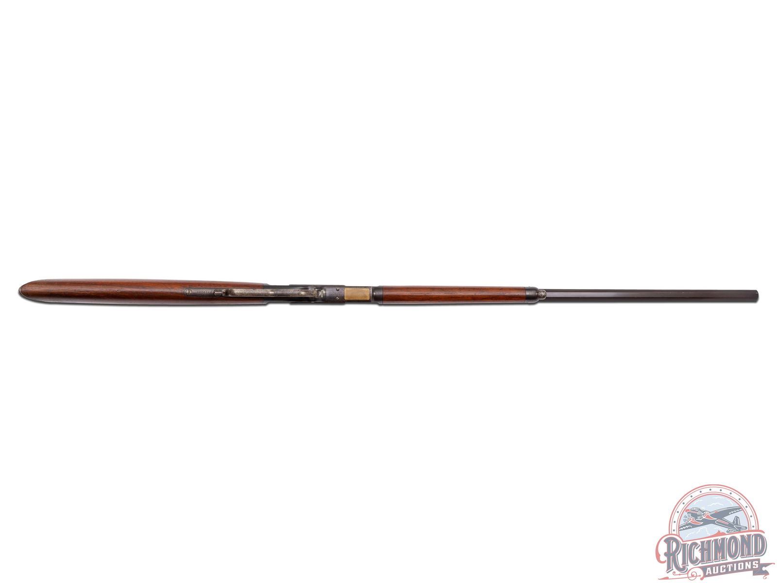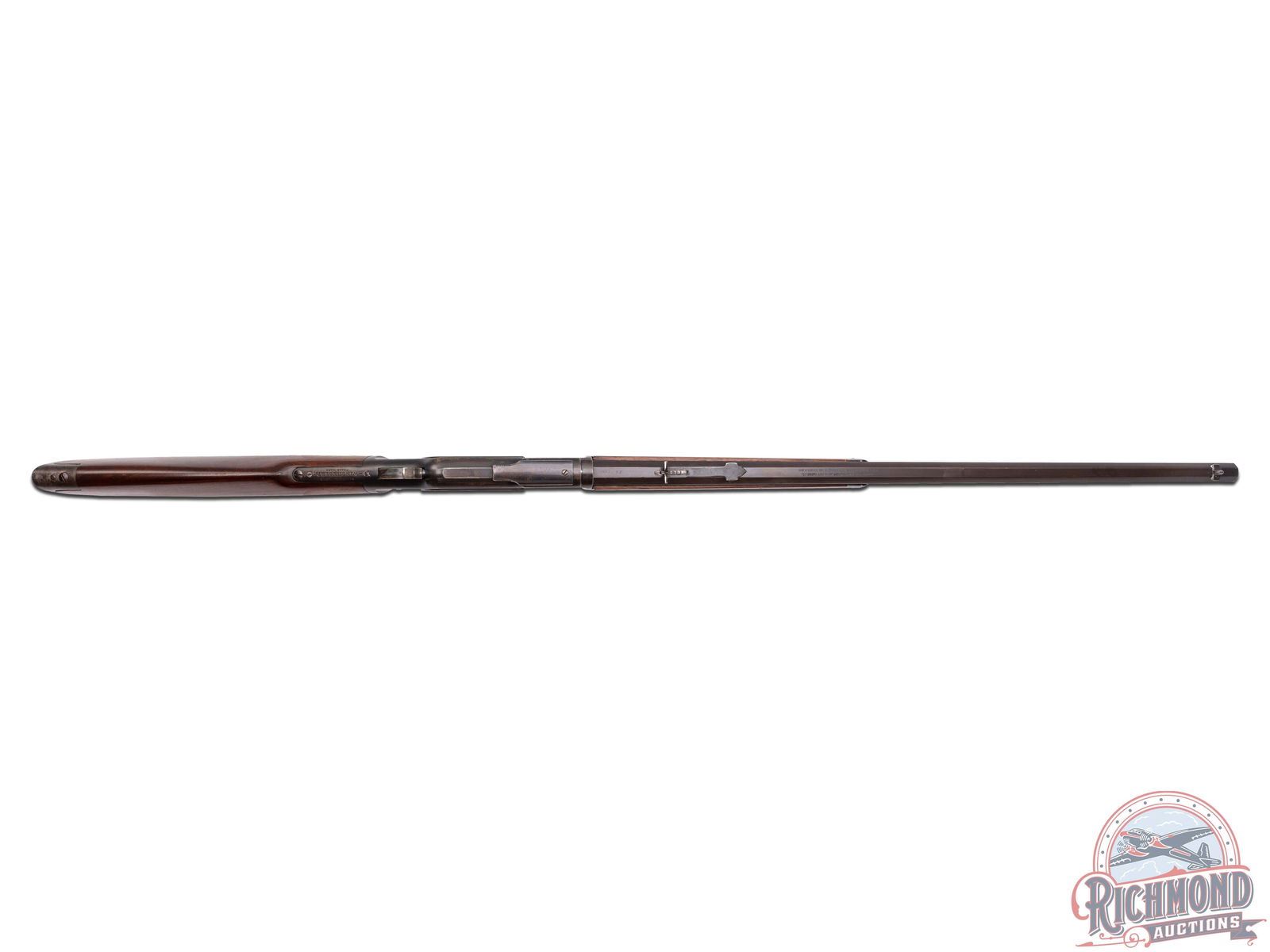 Manufactured in 1905. Features a 26" octagon barrel with button magazine tube, rear elevator notch sight and brass blade front sight. The top of the barrel flat is stamped "WINCHESTER'S REPEATING ARMS, NEW HAVEN, CT / KING'S-IMPROVEMENT-PATENTED-MARCH 29, 1866. OCTOBER 16, 1860". case-hardened receiver with dust cover, side loading gate, lever lock and the iconic brass follower. Tang is stamped "MODEL 1873 / -WINCHESTER- / TRADE MARK". Walnut straight stock and matching forearm with blued end cap. Fitted with a steel butt plate with brass gate for field cleaning storage. Includes factory quick check letter. LOP: 12-1/2". CALIBER: 38 CAL. S/N: 591209. FFL STATUS: Curio & Relic.