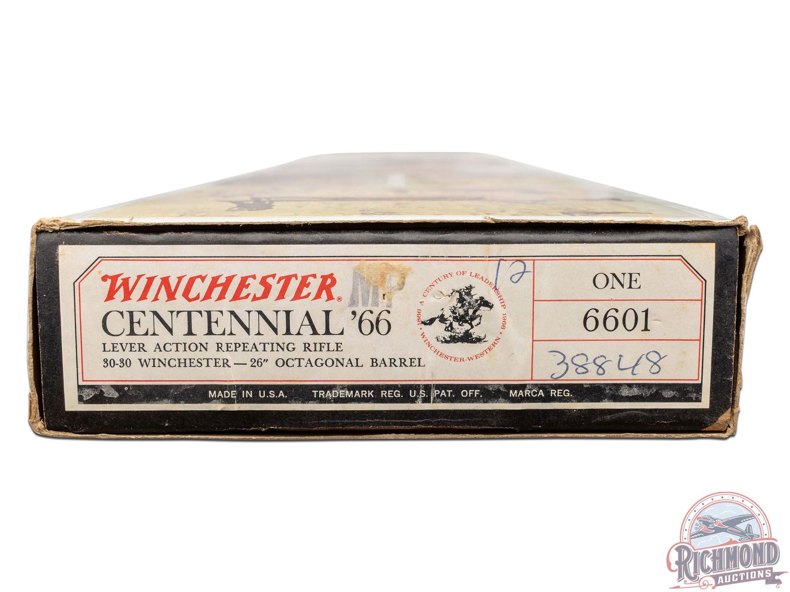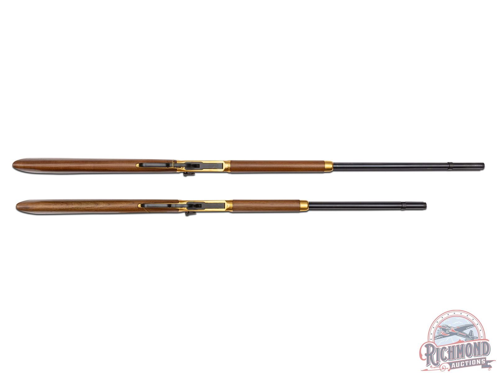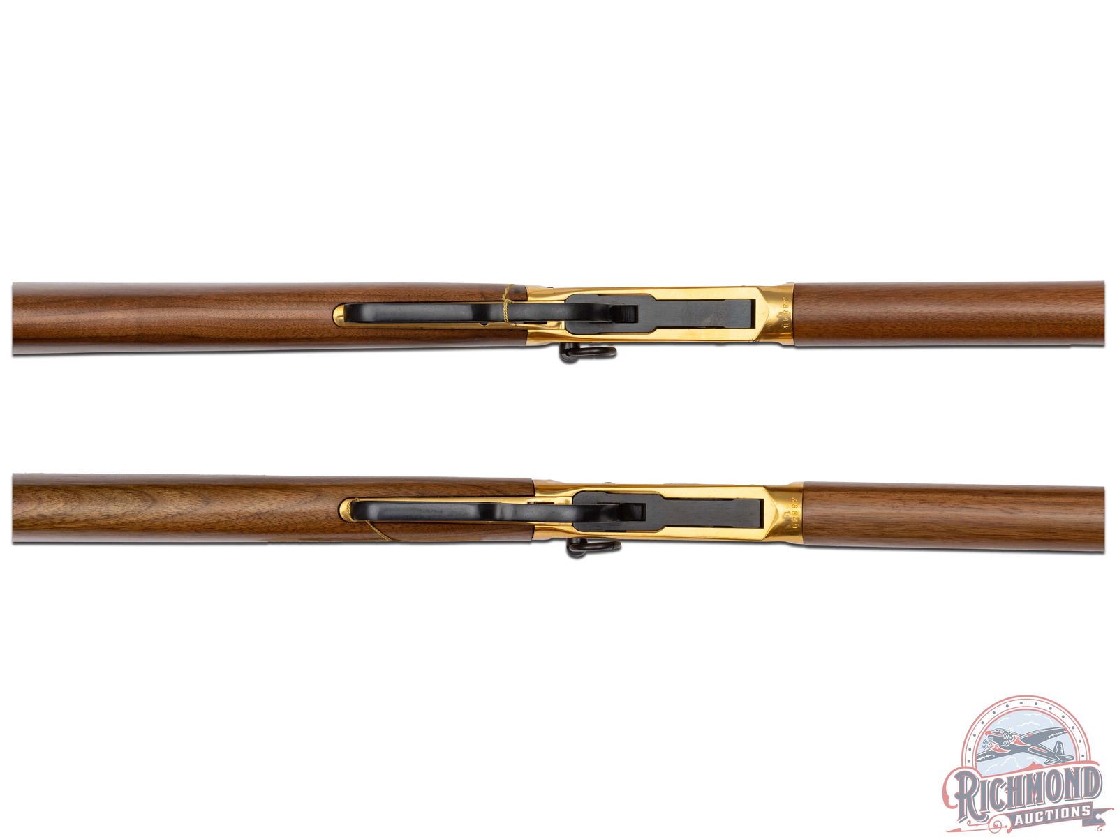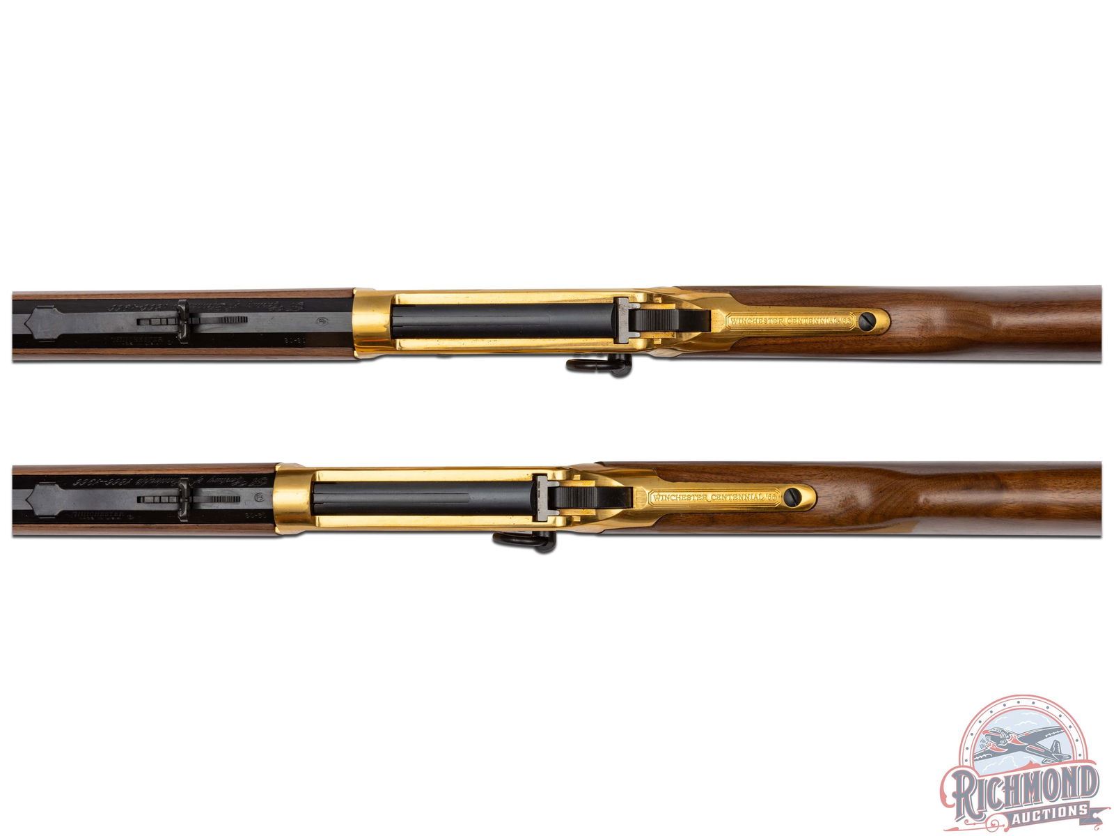 Manufactured in 1966, the Centennial '66 rifles were made in both the 26" barrel and the 20" carbine. One of each is included with this consecutive serial number set. Produced to commemorative the 100th anniversary of Winchester's first rifle, the model 1866. Both feature blued octagonal barrels, full length magazine tubes, flat-top semi-buckhorn rear sights and blade front. Right side of the barrel is stamped "A Century of Leadership 1866-1966" in script lettering. Brass plated receiver with saddle ring and top ejection. Smooth straight walnut stock and forearm with a brass plated forearm tip. Fitted with a brass crescent butt plate. Both rifles come in the original factory boxes with sleeves and a single Winchester shipping box to hold both. Factory paperwork and hanging tags are included. CALIBER: 30-30 WIN. S/N: 38848 / 38849. FFL STATUS: Curio & Relic.