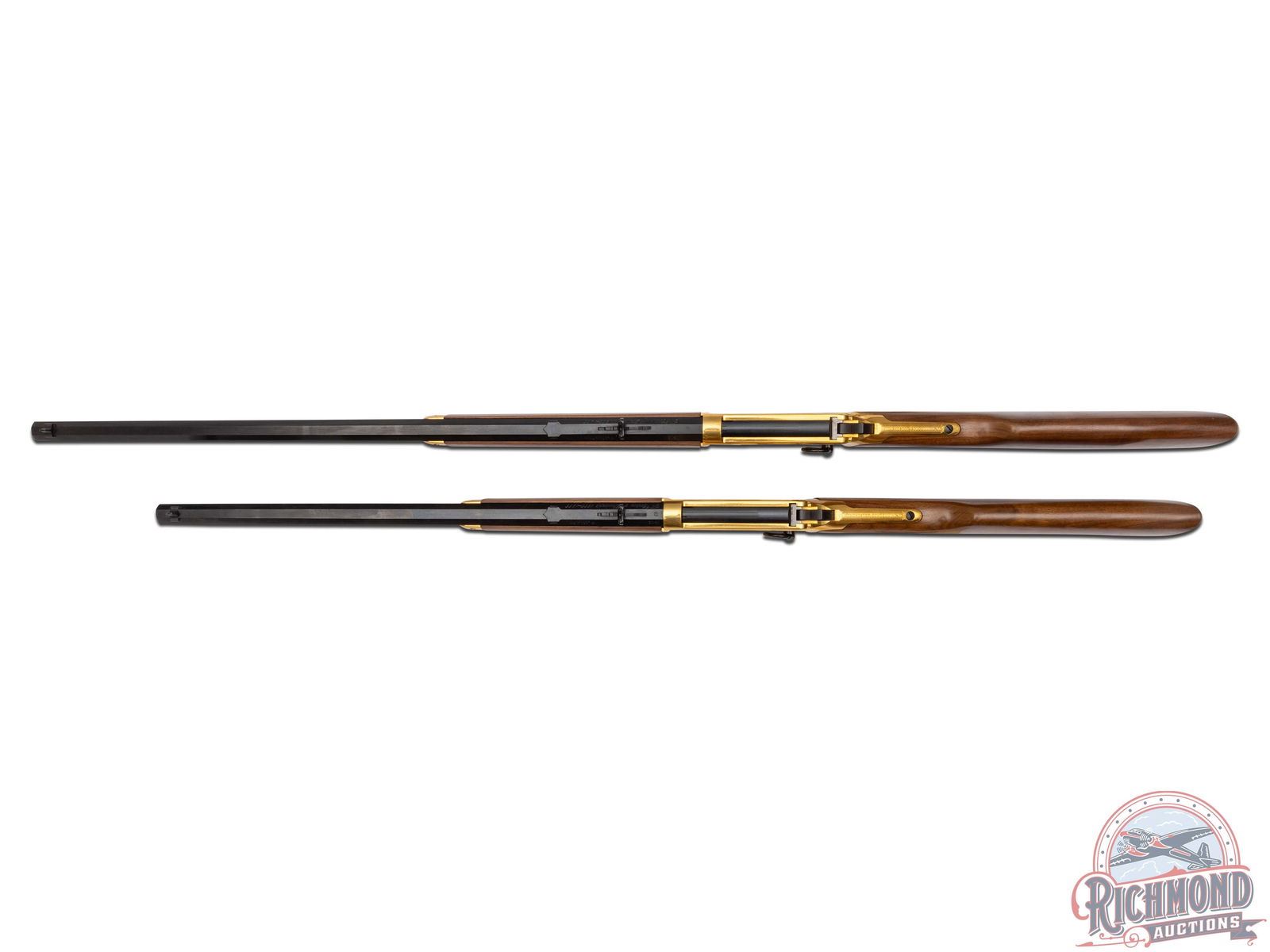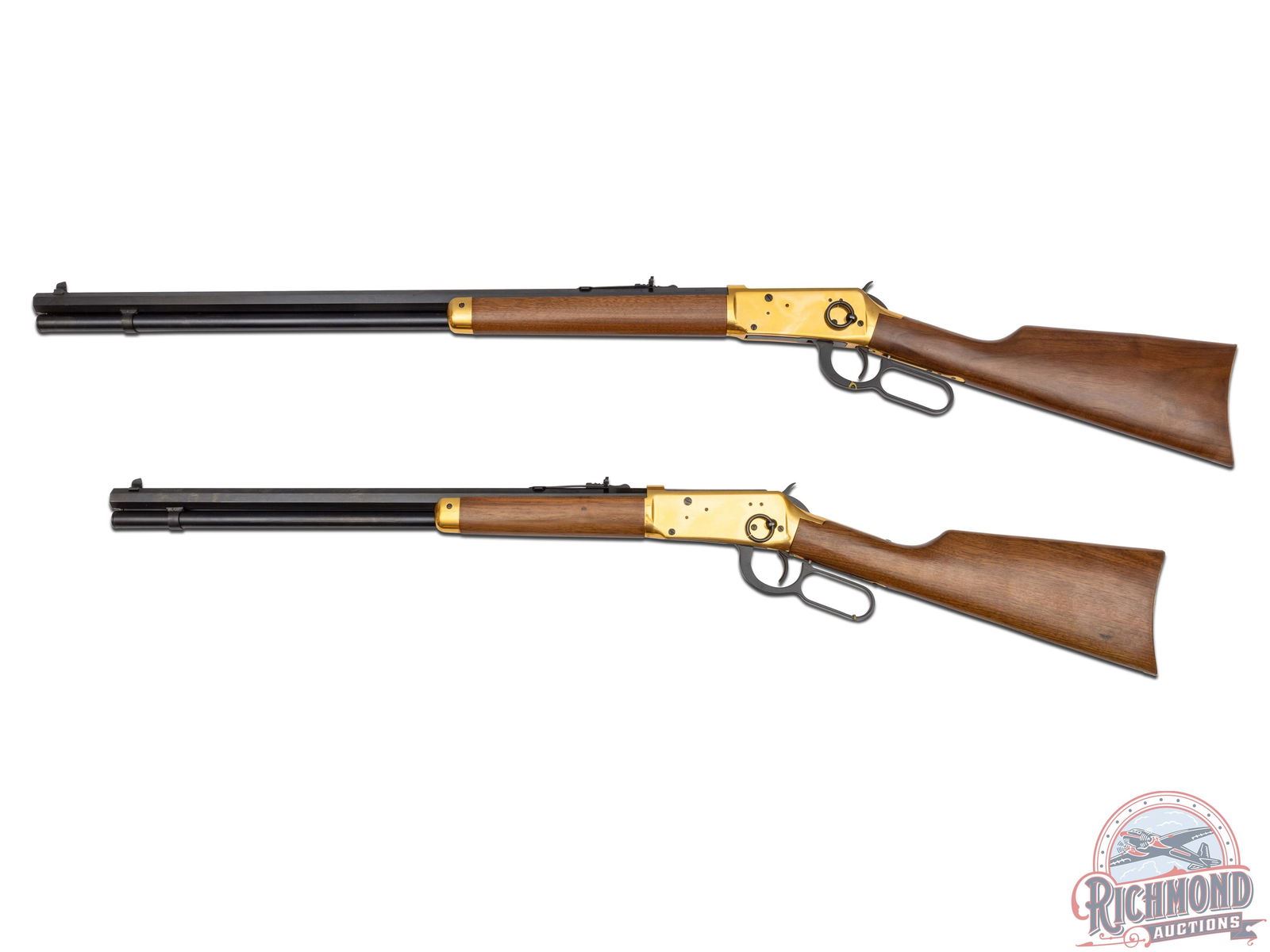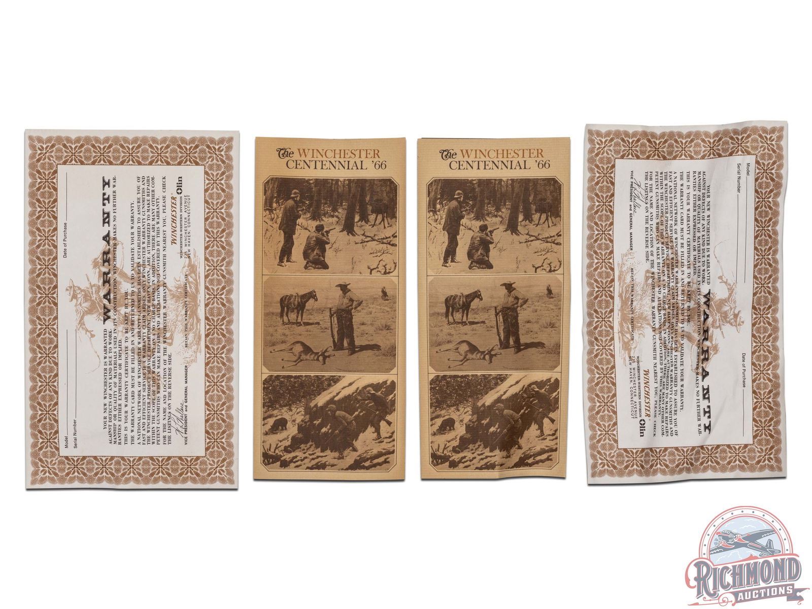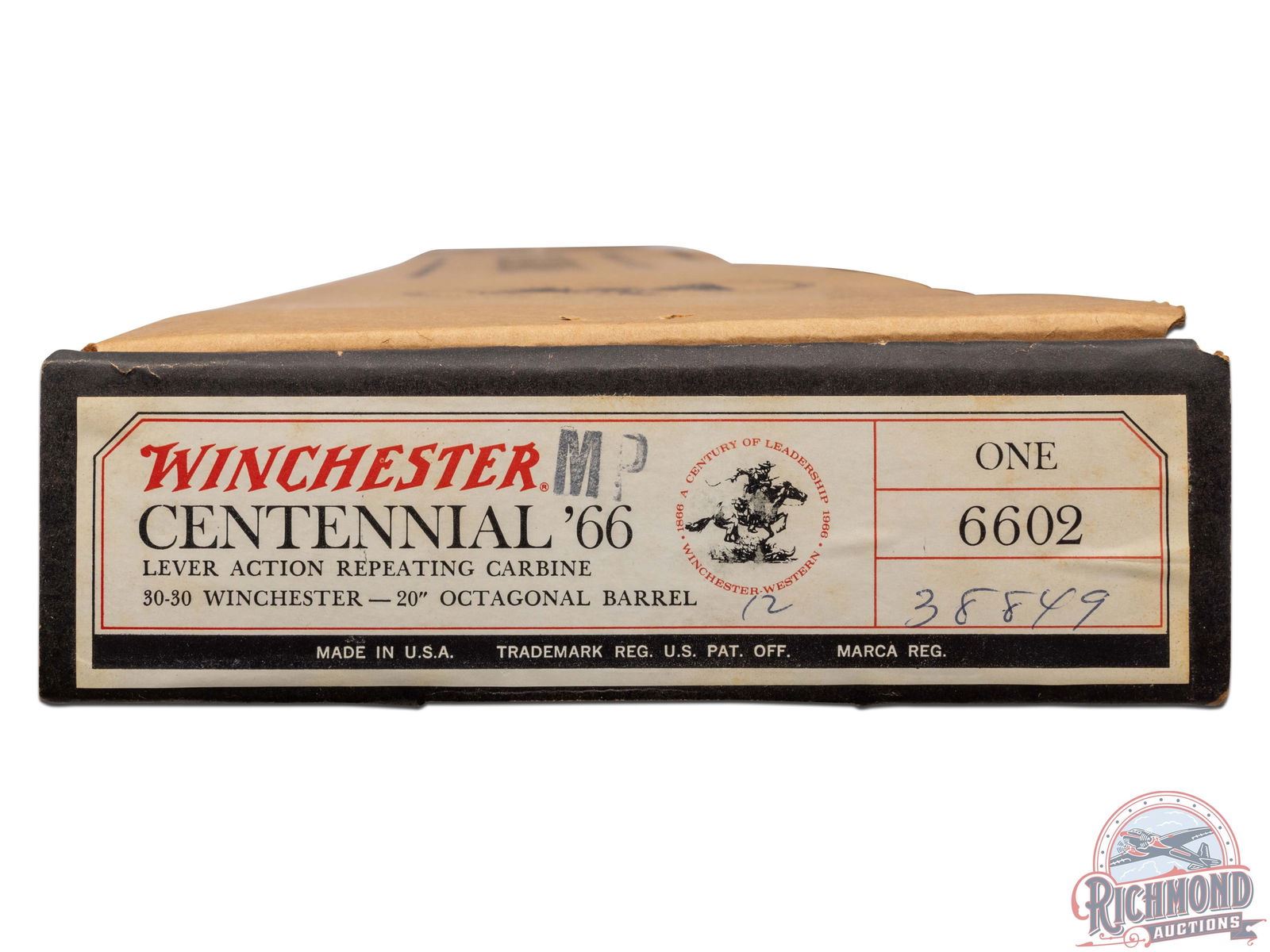 Manufactured in 1966, the Centennial '66 rifles were made in both the 26" barrel and the 20" carbine. One of each is included with this consecutive serial number set. Produced to commemorative the 100th anniversary of Winchester's first rifle, the model 1866. Both feature blued octagonal barrels, full length magazine tubes, flat-top semi-buckhorn rear sights and blade front. Right side of the barrel is stamped "A Century of Leadership 1866-1966" in script lettering. Brass plated receiver with saddle ring and top ejection. Smooth straight walnut stock and forearm with a brass plated forearm tip. Fitted with a brass crescent butt plate. Both rifles come in the original factory boxes with sleeves and a single Winchester shipping box to hold both. Factory paperwork and hanging tags are included. CALIBER: 30-30 WIN. S/N: 38848 / 38849. FFL STATUS: Curio & Relic.