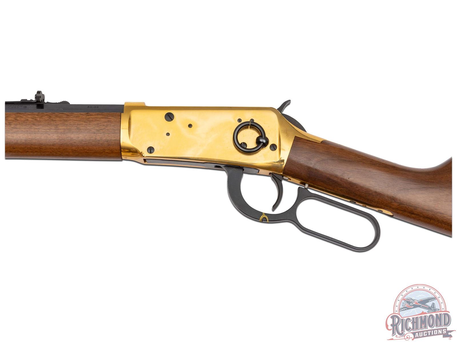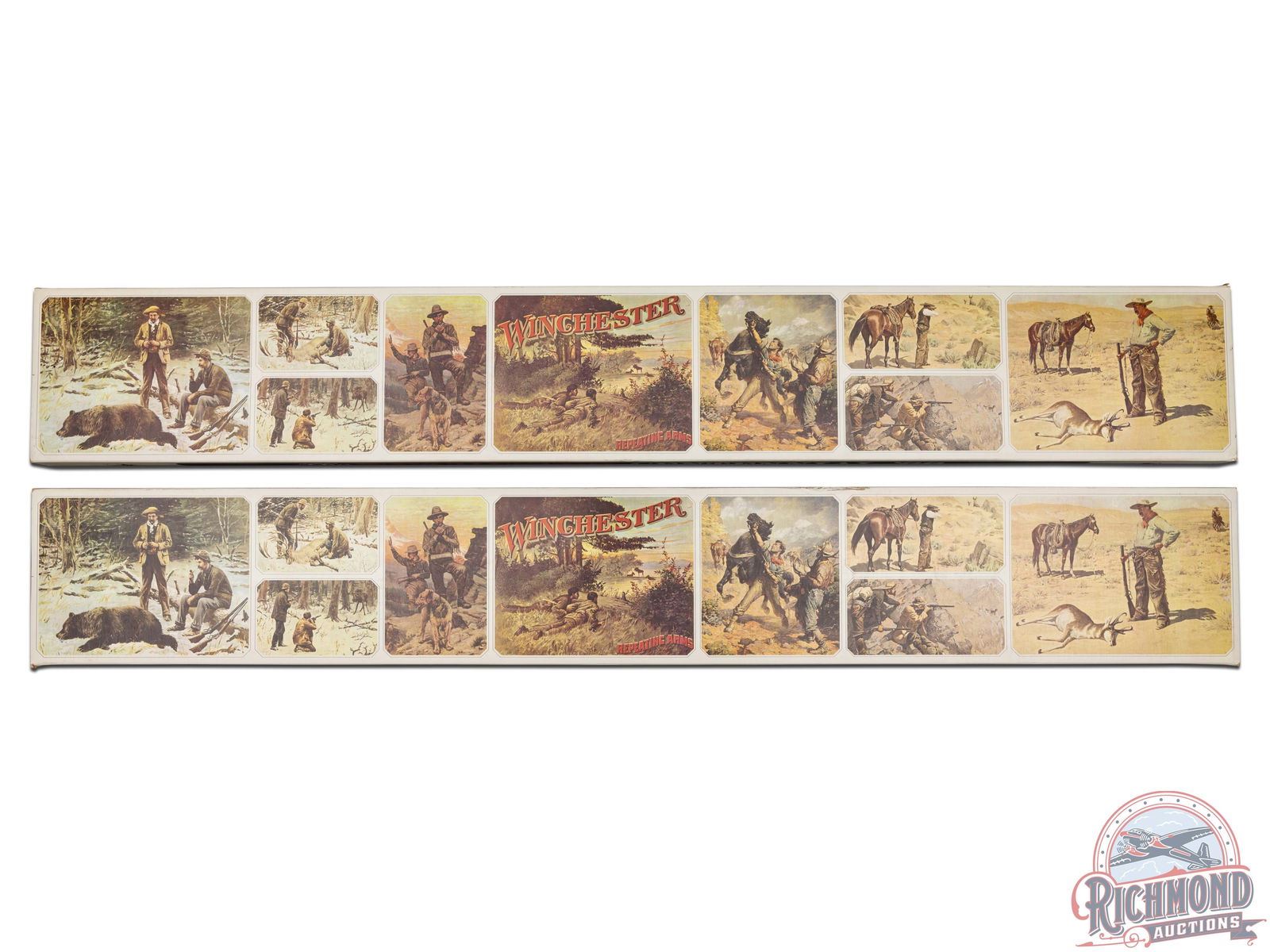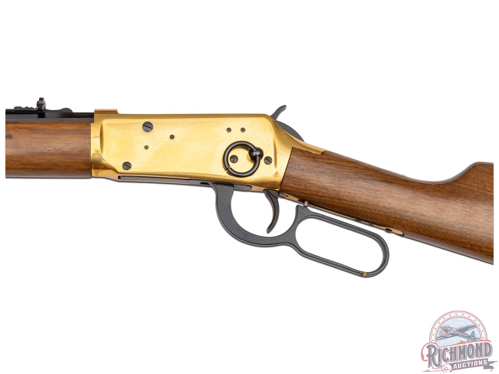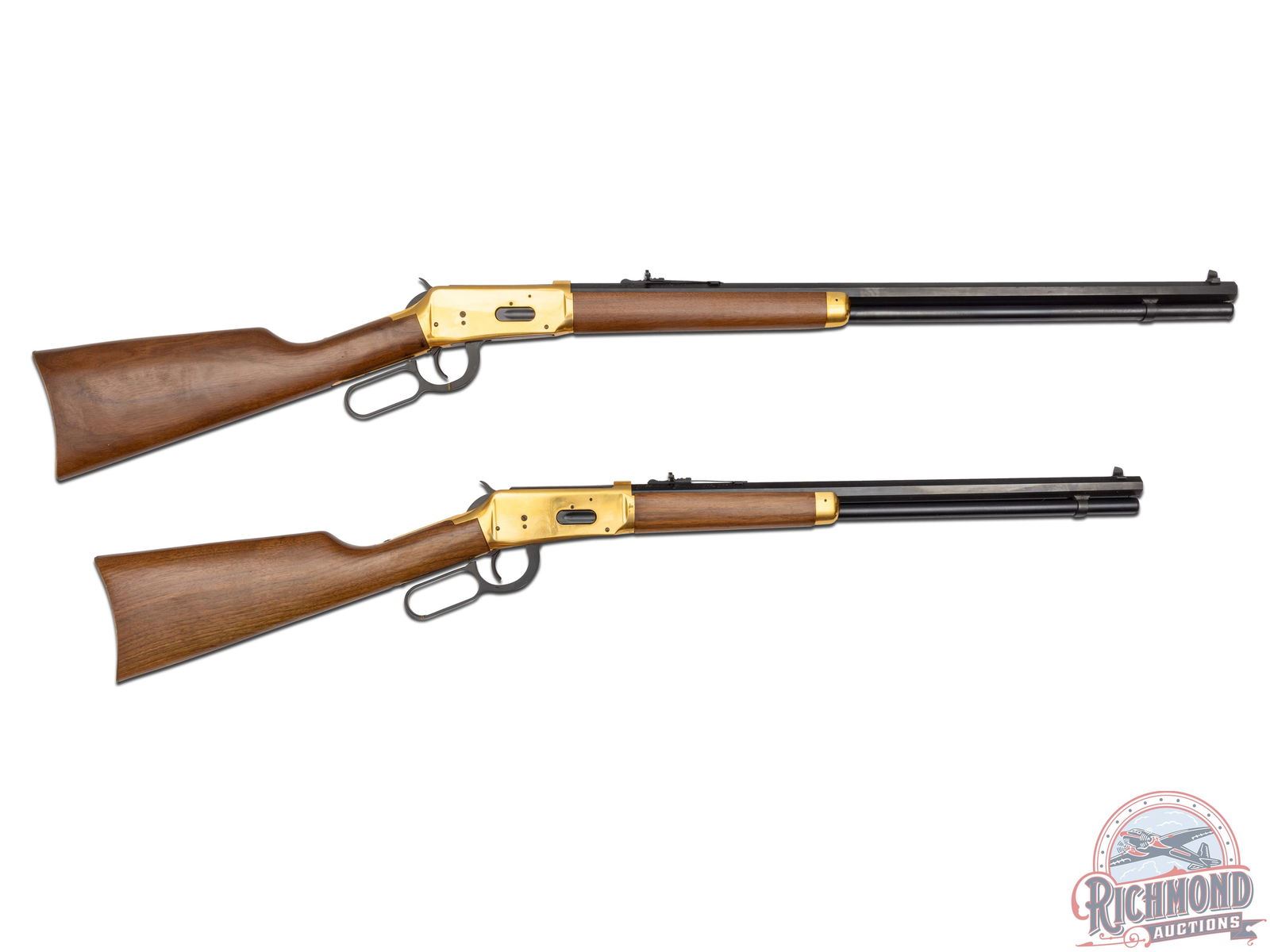 Manufactured in 1966, the Centennial '66 rifles were made in both the 26" barrel and the 20" carbine. One of each is included with this consecutive serial number set. Produced to commemorative the 100th anniversary of Winchester's first rifle, the model 1866. Both feature blued octagonal barrels, full length magazine tubes, flat-top semi-buckhorn rear sights and blade front. Right side of the barrel is stamped "A Century of Leadership 1866-1966" in script lettering. Brass plated receiver with saddle ring and top ejection. Smooth straight walnut stock and forearm with a brass plated forearm tip. Fitted with a brass crescent butt plate. Both rifles come in the original factory boxes with sleeves and a single Winchester shipping box to hold both. Factory paperwork and hanging tags are included. CALIBER: 30-30 WIN. S/N: 38848 / 38849. FFL STATUS: Curio & Relic.