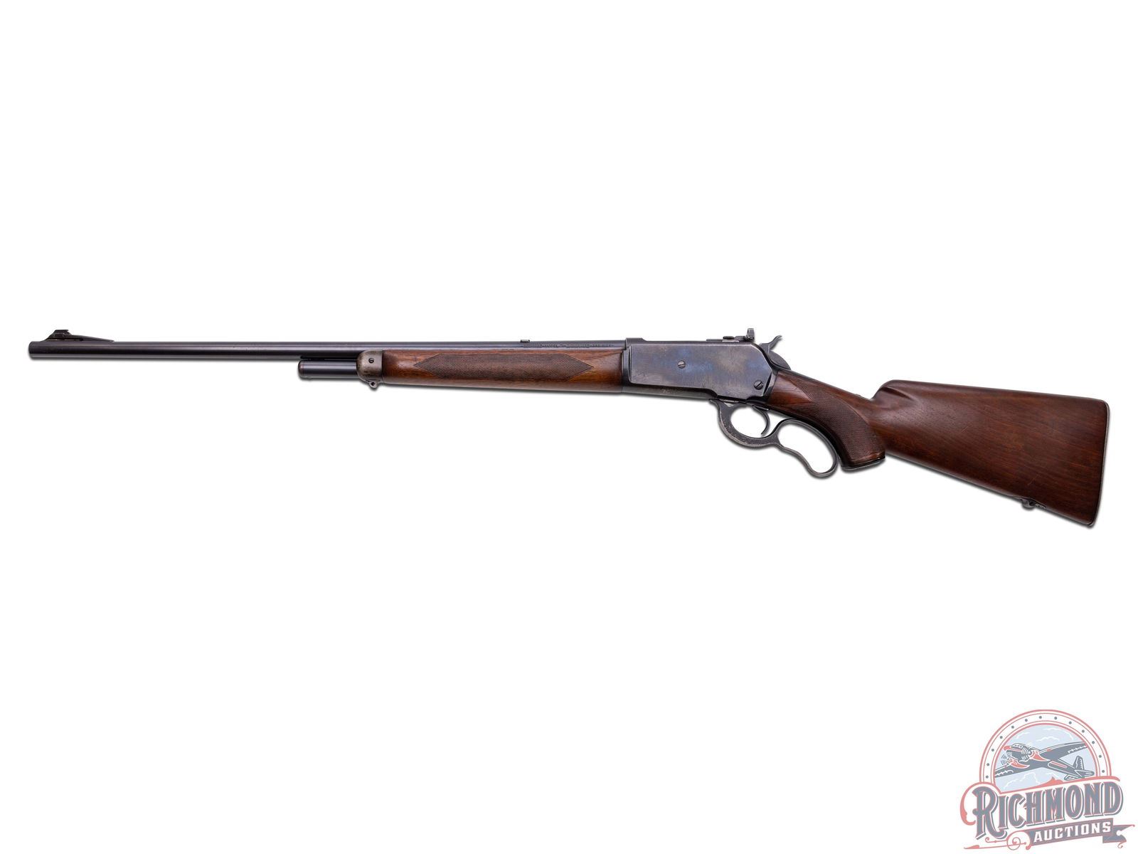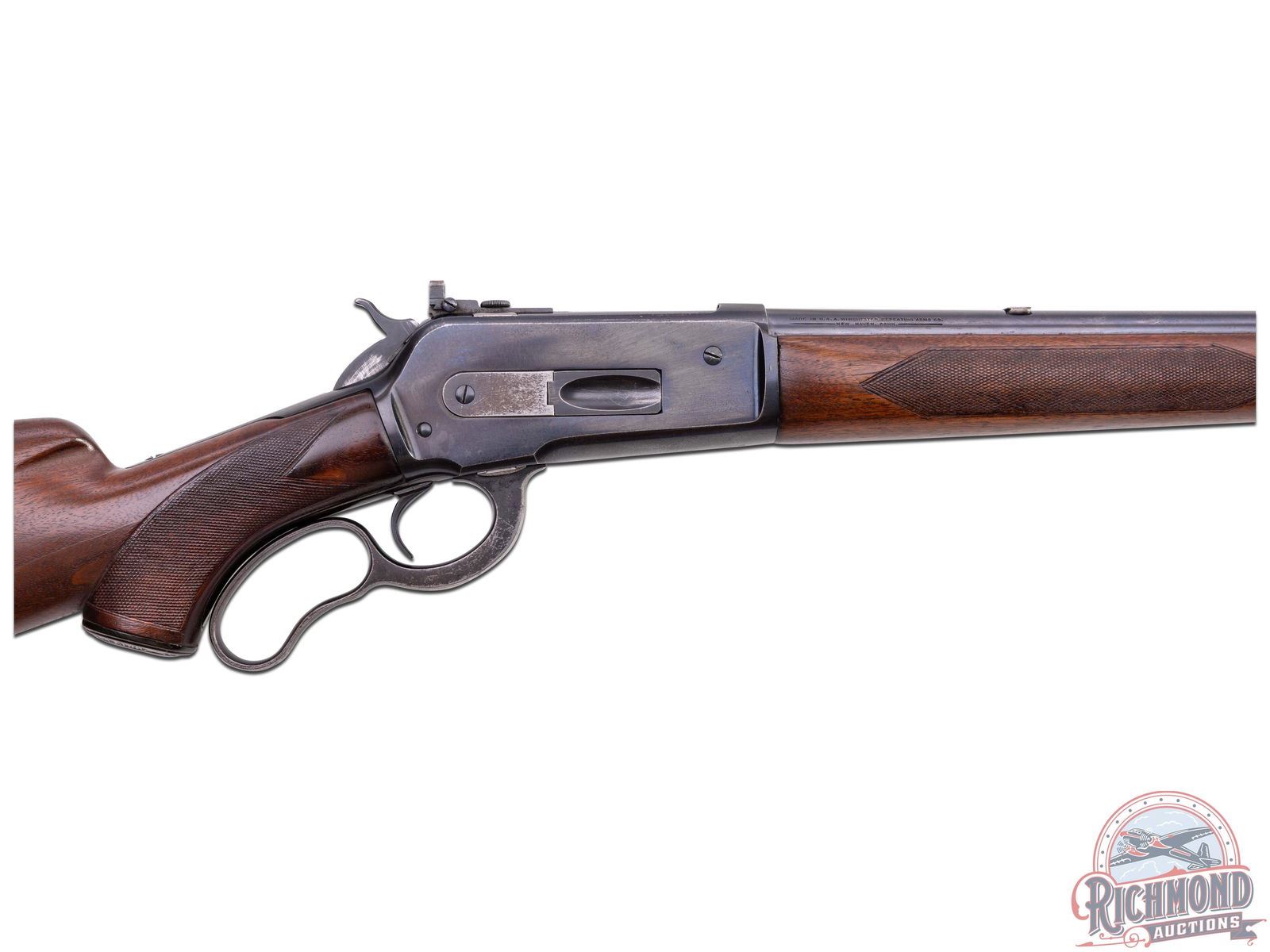 Made by Winchester Repeating Arms in 1936. 24" blued round Winchester Proof Steel barrel with hooded ramp front sight (missing hood), correctly plugged rear sight dovetail and action has desirable bolt peep sight. Barrel is marked with Winchester model and caliber on left and Winchester two line address on right with rifle in 348 caliber. Blued solid frame action with blued 2/3 magazine and plain trigger. Standard checkered walnut stocks with checkered steel butt plate and steel butt plate and sling swivel provisions (missing swivels). CALIBER: 348 W.C.F. S/N: 4890. FFL STATUS: Curio & Relic.