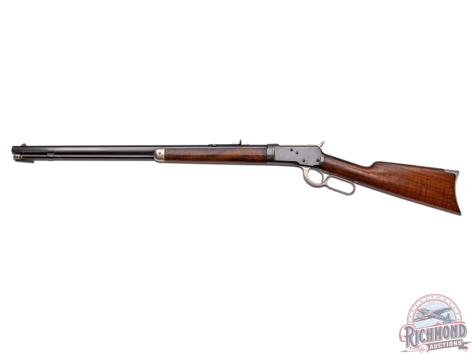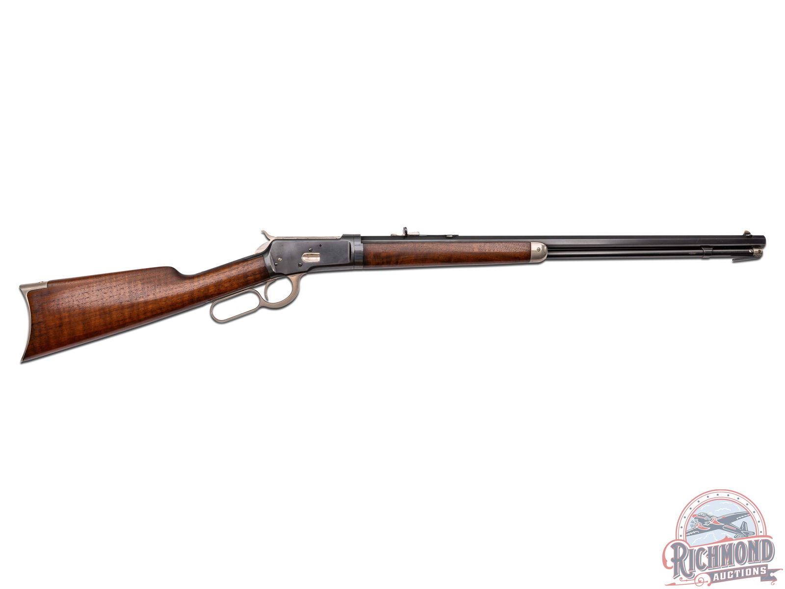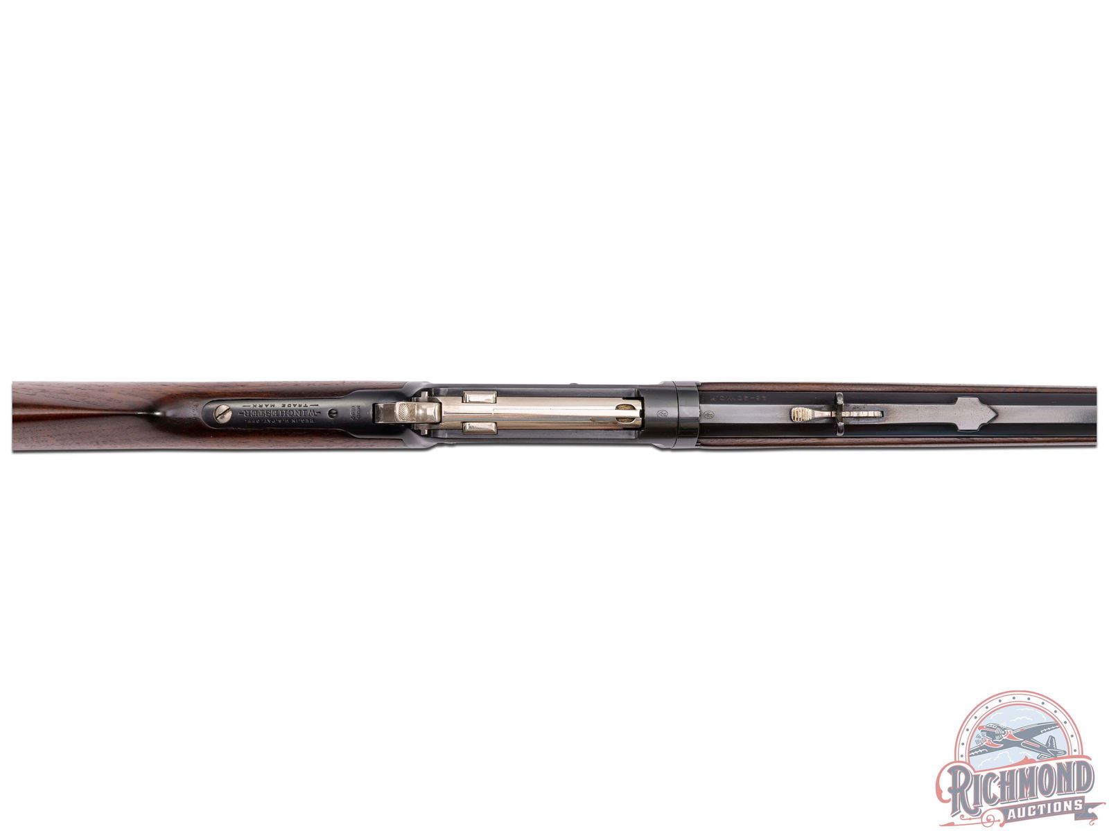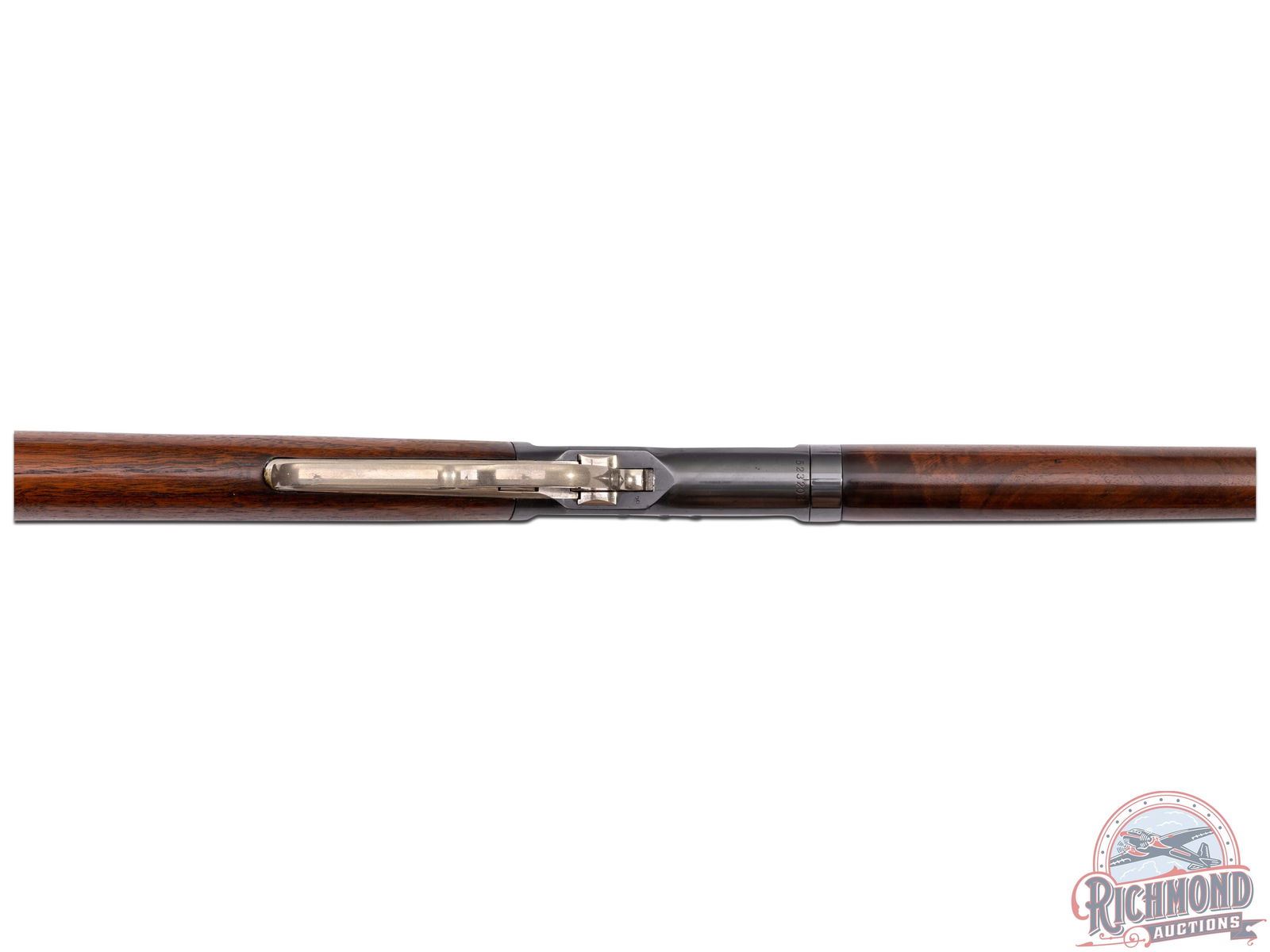 Manufactured in 1910. This beautiful unique model 1892 features a 24" blued octagon barrel with rear buckhorn sight and blade front sight. Full length magazine tube. Two-line Winchester address on the left side barrel flat. Rear of the barrel is stamped "25-20 W.C.F." with the dual Winchester Proof marks. Blued receiver with nickel plated bolt, follower, loading gate, hammer, lever, trigger, sight elevator, tube cap, forearm cap and butt plate. Tang is stamped "MOD 1892" just behind the hammer with the Winchester Trademark proof along the grip. Walnut wood straight stock with crescent metal butt plate and matching forearm. LOP: 13". CALIBER: 25-20 WCF. S/N: 523203. FFL STATUS: Curio & Relic.