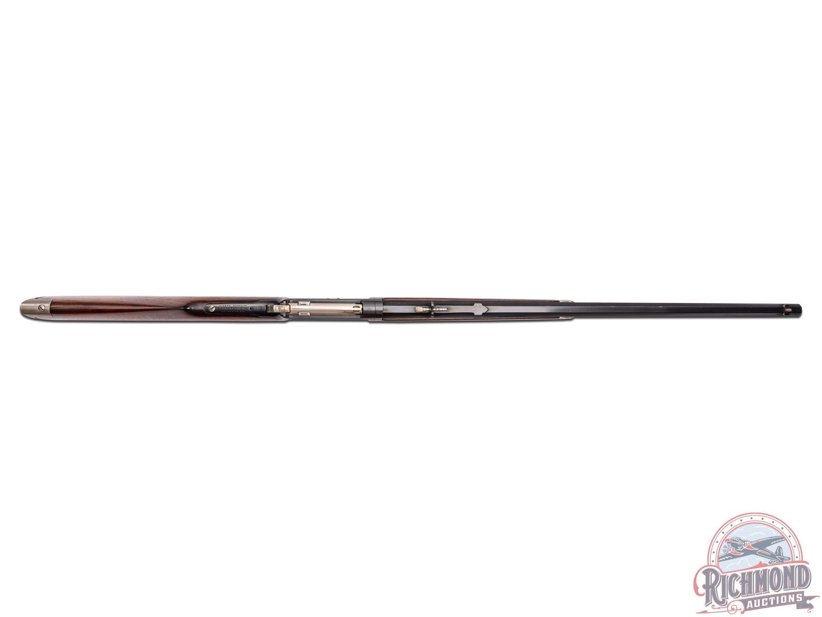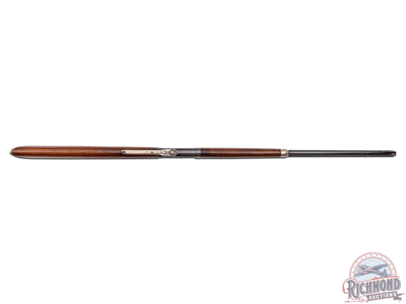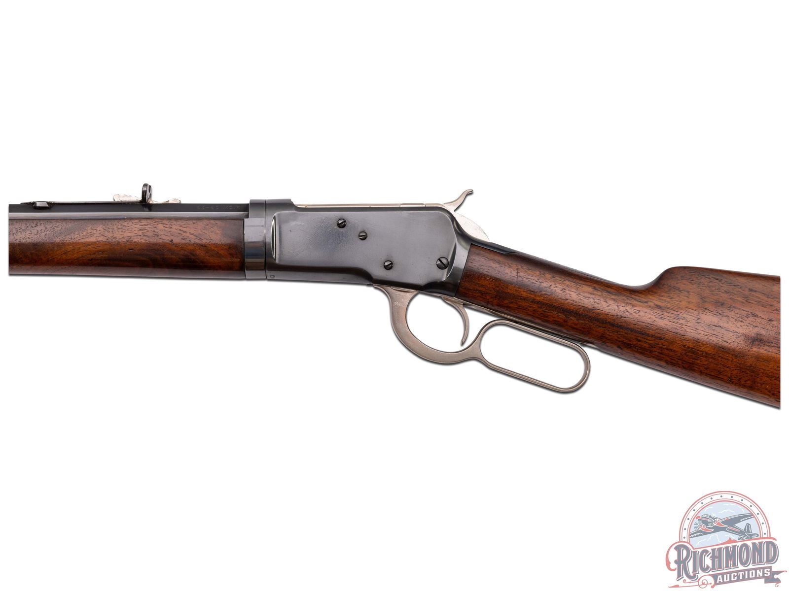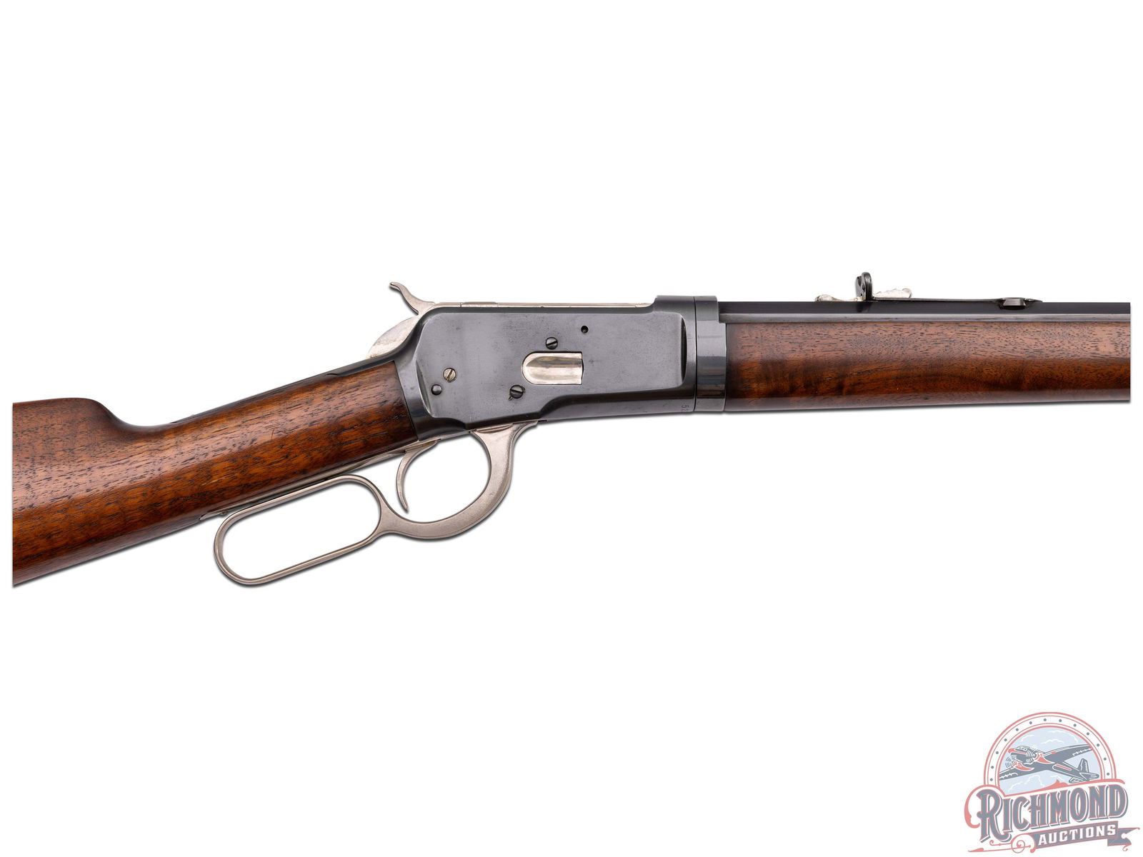Manufactured in 1910. This beautiful unique model 1892 features a 24" blued octagon barrel with rear buckhorn sight and blade front sight. Full length magazine tube. Two-line Winchester address on the left side barrel flat. Rear of the barrel is stamped "25-20 W.C.F." with the dual Winchester Proof marks. Blued receiver with nickel plated bolt, follower, loading gate, hammer, lever, trigger, sight elevator, tube cap, forearm cap and butt plate. Tang is stamped "MOD 1892" just behind the hammer with the Winchester Trademark proof along the grip. Walnut wood straight stock with crescent metal butt plate and matching forearm. LOP: 13". CALIBER: 25-20 WCF. S/N: 523203. FFL STATUS: Curio & Relic.