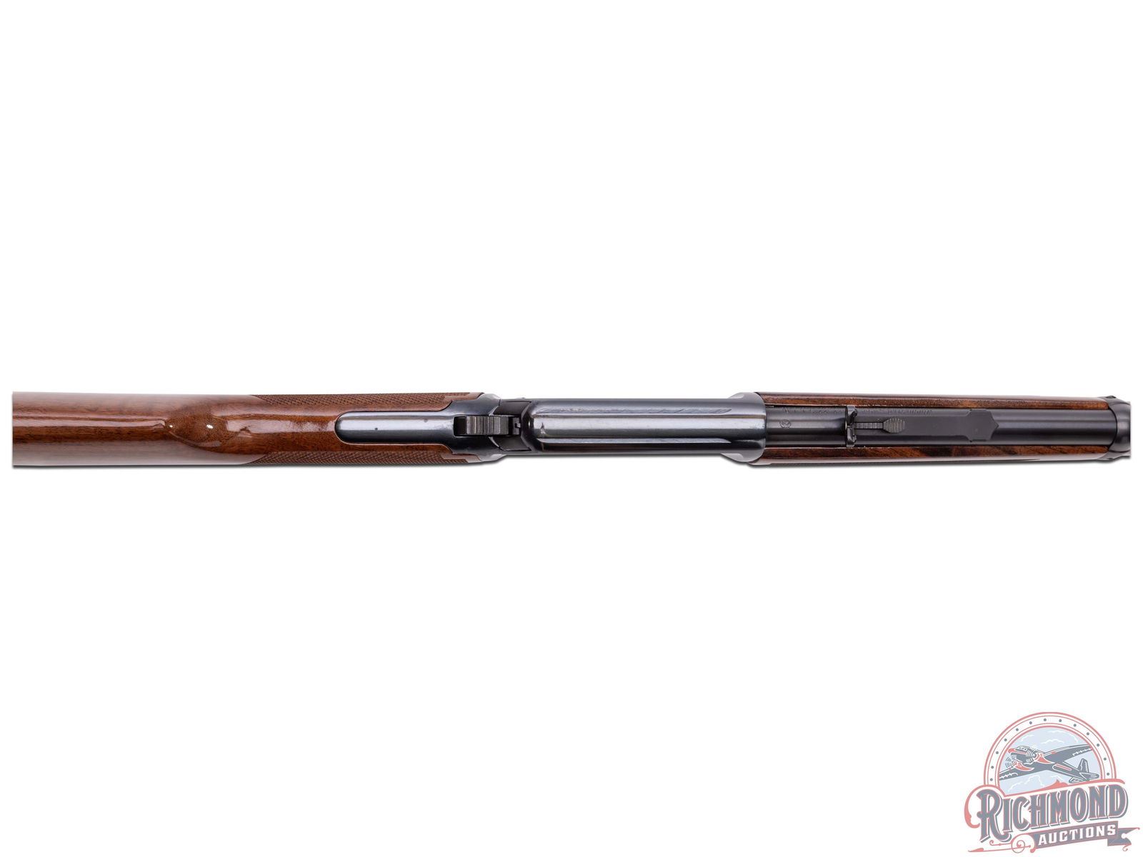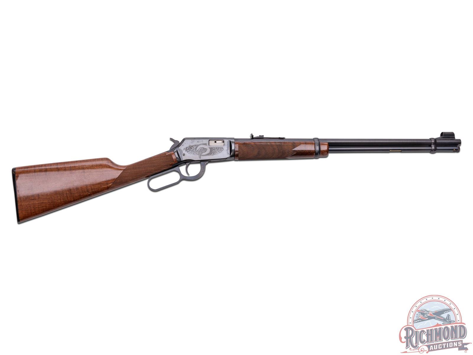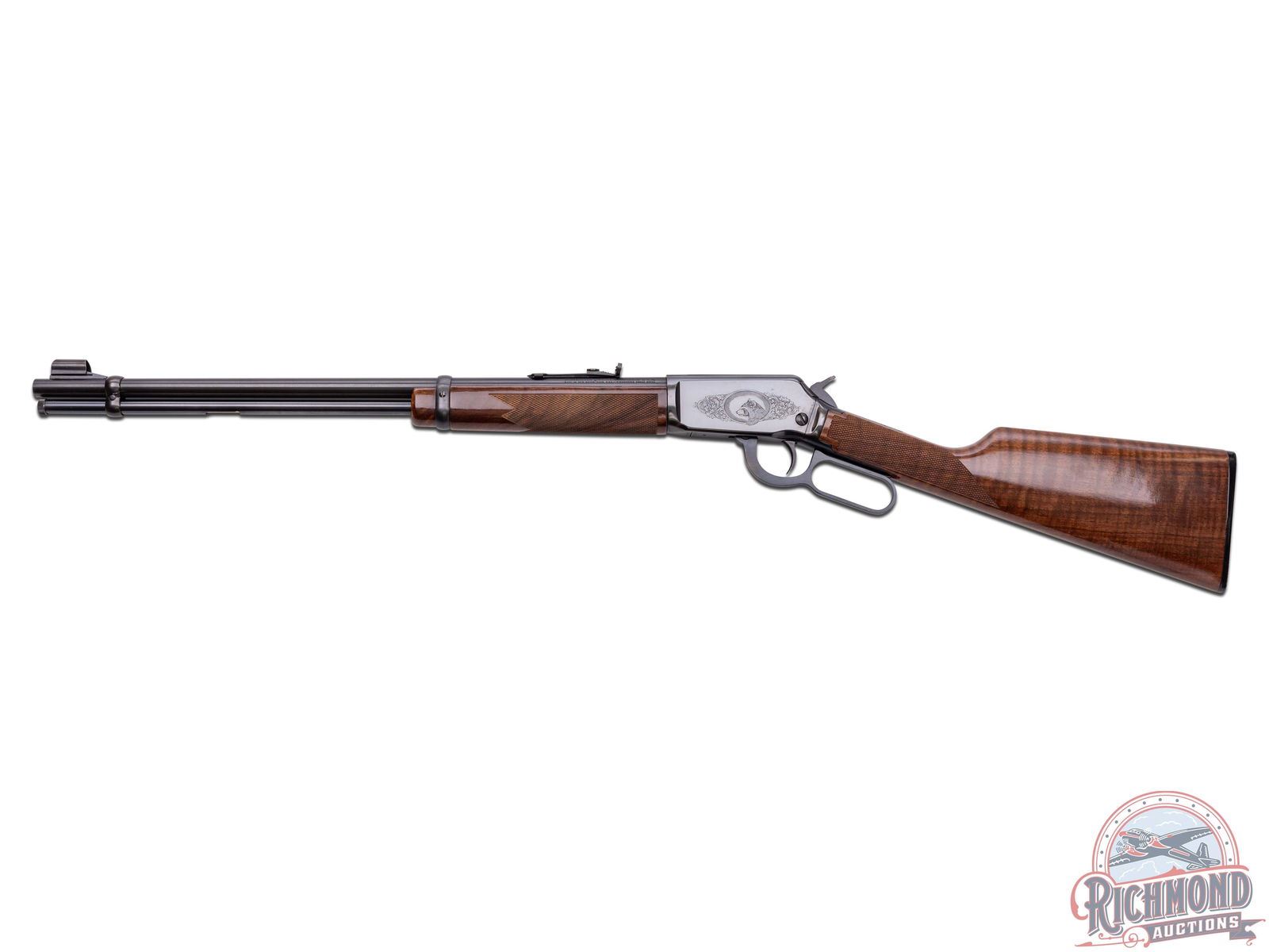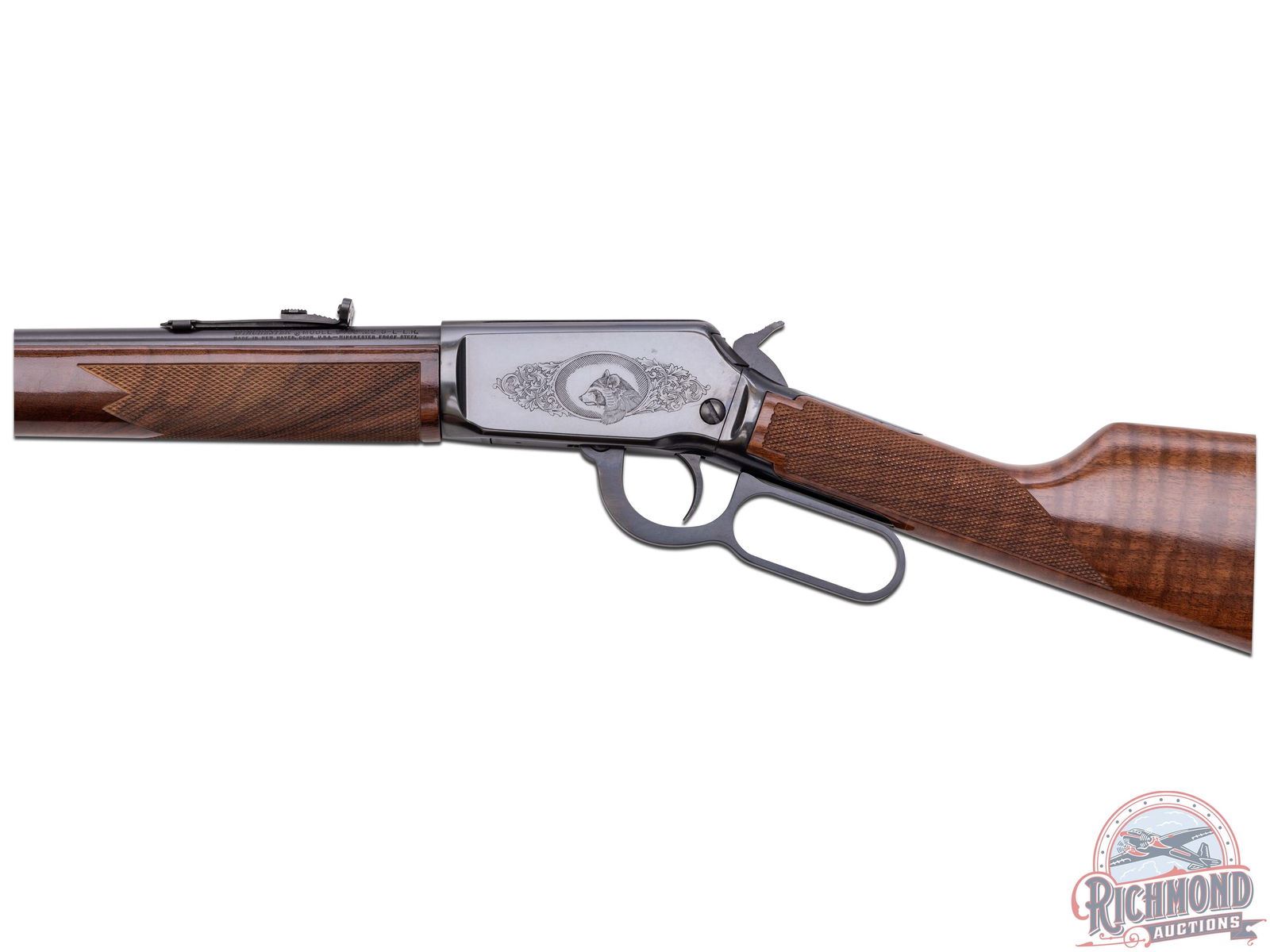 Manufactured in 1972, this high grade lever action has never been fired. Features a 20-1/2" blued barrel with standard Winchester stampings and proof marks, hooded front iron sight and rear adjustable semi-buckhorn sight with white diamond insert. Blued receiver with dovetail groove for scope mount. Special engraving features a raccoon and coonhound surrounded by floral scroll border. Reversible hammer spur, still in original package. Full length magazine tube holds up to 21 rounds of short, 17 rounds of long or 15 rounds of LR. High-grade walnut stock and forearm with deep-cut checkering and high gloss finish. Fitted with a factory checkered Winchester logo butt plate. Comes in the original factory red box with factory paperwork and hammer spur. LOP: 13-1/2". DAC: 1-1/4". DAH: 1-7/8". CALIBER: 22 S/L/LR. S/N: F689860. FFL STATUS: Curio & Relic.