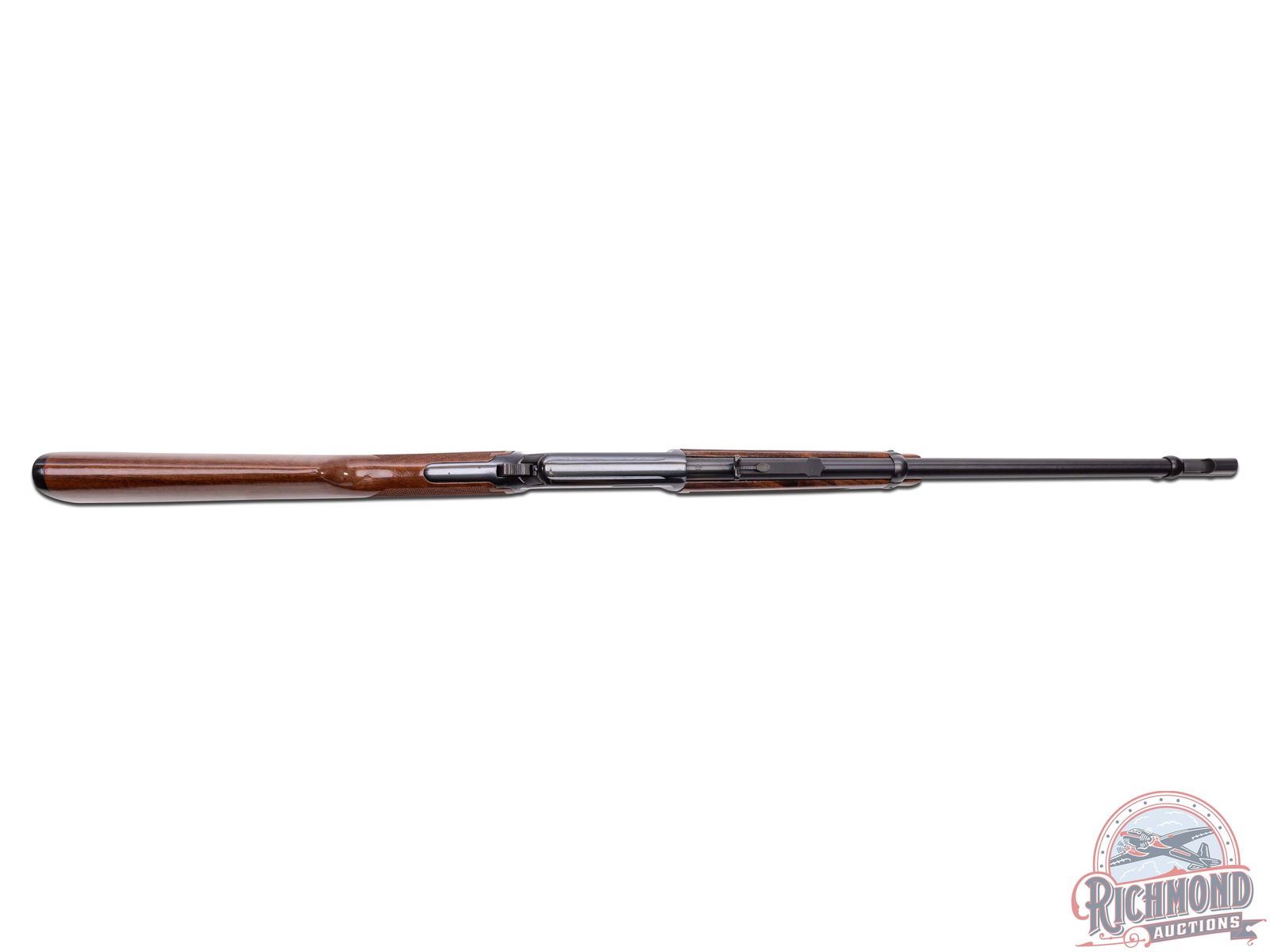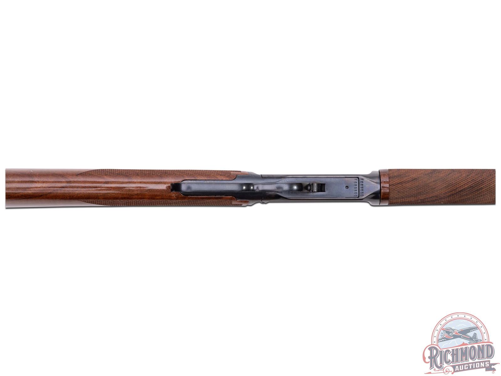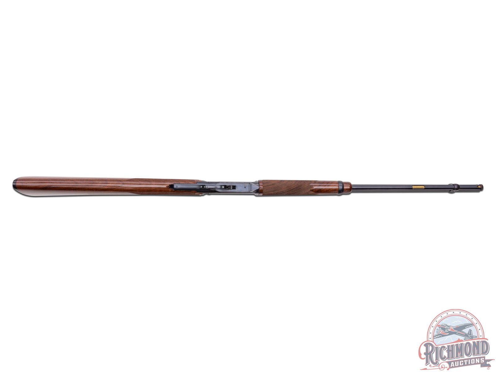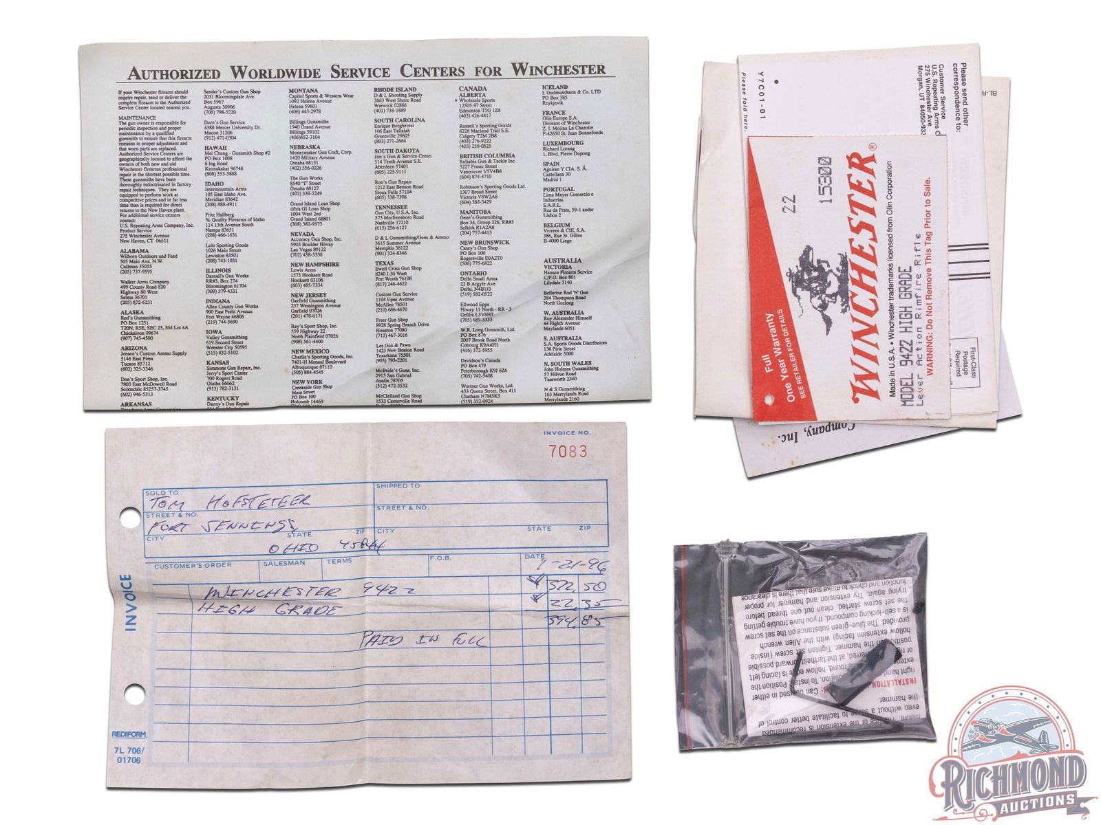Manufactured in 1972, this high grade lever action has never been fired. Features a 20-1/2" blued barrel with standard Winchester stampings and proof marks, hooded front iron sight and rear adjustable semi-buckhorn sight with white diamond insert. Blued receiver with dovetail groove for scope mount. Special engraving features a raccoon and coonhound surrounded by floral scroll border. Reversible hammer spur, still in original package. Full length magazine tube holds up to 21 rounds of short, 17 rounds of long or 15 rounds of LR. High-grade walnut stock and forearm with deep-cut checkering and high gloss finish. Fitted with a factory checkered Winchester logo butt plate. Comes in the original factory red box with factory paperwork and hammer spur. LOP: 13-1/2". DAC: 1-1/4". DAH: 1-7/8". CALIBER: 22 S/L/LR. S/N: F689860. FFL STATUS: Curio & Relic.