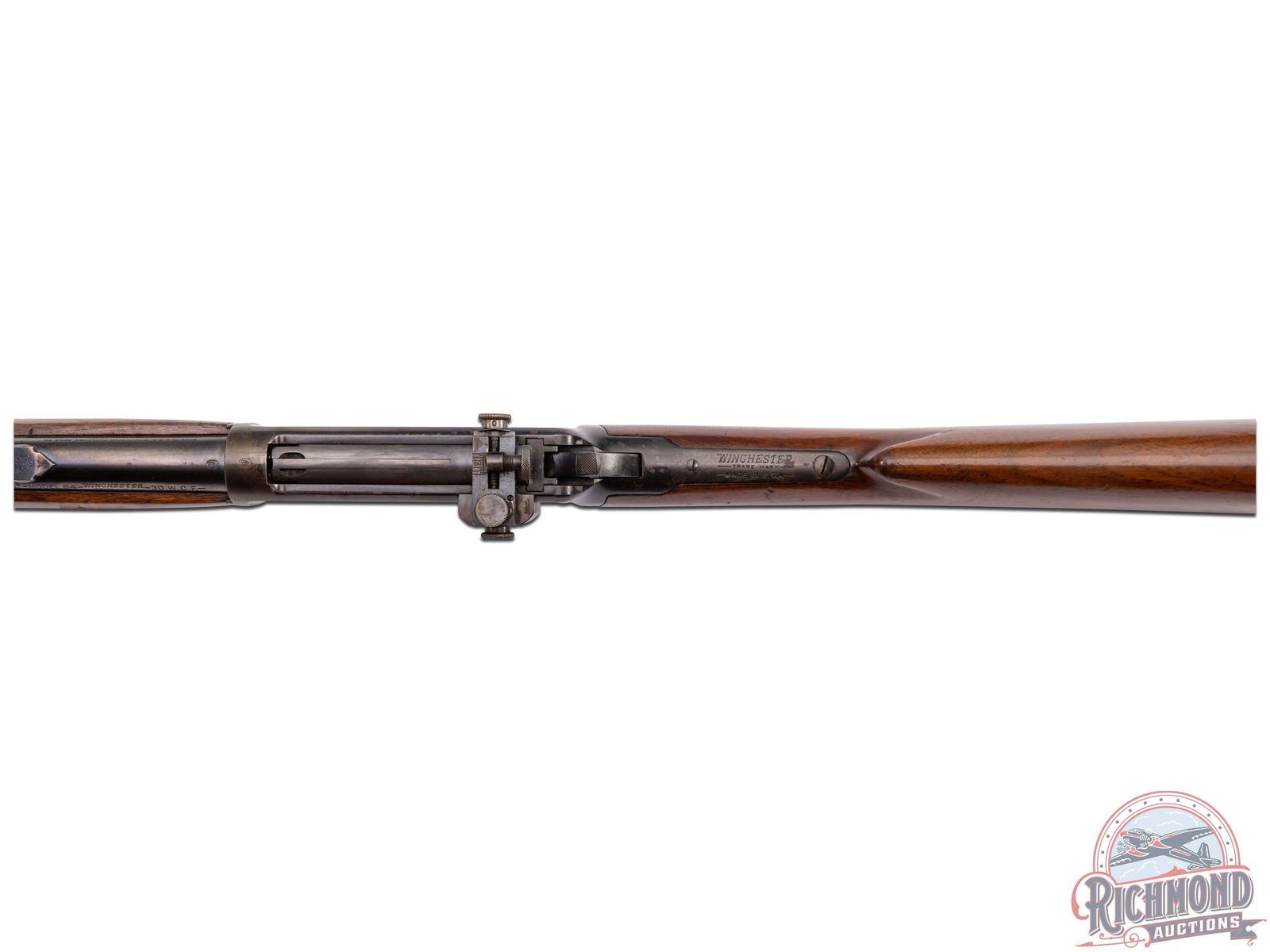 Manufactured in 1936. Features a factory carbine 20" blued barrel with carbine correct ramped hooded blade sight and 3/4 length magazine tube. Receiver mounted Lyman number 56 rear peep sight and Lyman barrel rear sight plug. Two-line Winchester address on the right side of the barrel and left side is stamped "WINCHESTER / PROOF STEEL / - MODEL 64 - / WINCHESTER / -TRADE MARK- / -30 WCF-". Winchester proof marks on the rear of the barrel as well on the top front of the receiver. Tang is also stamped with the three-line Winchester trade mark. Walnut wood stock with pistol grip and fitted with steel checkered butt plate. Matching forearm with steel cap. LOP: 13". CALIBER: 30 WCF. S/N: 1105095. FFL STATUS: Curio & Relic.