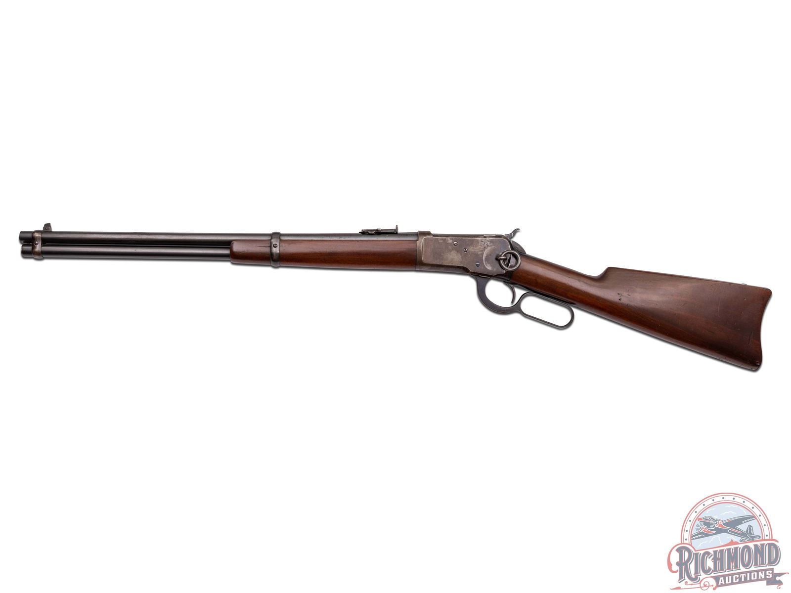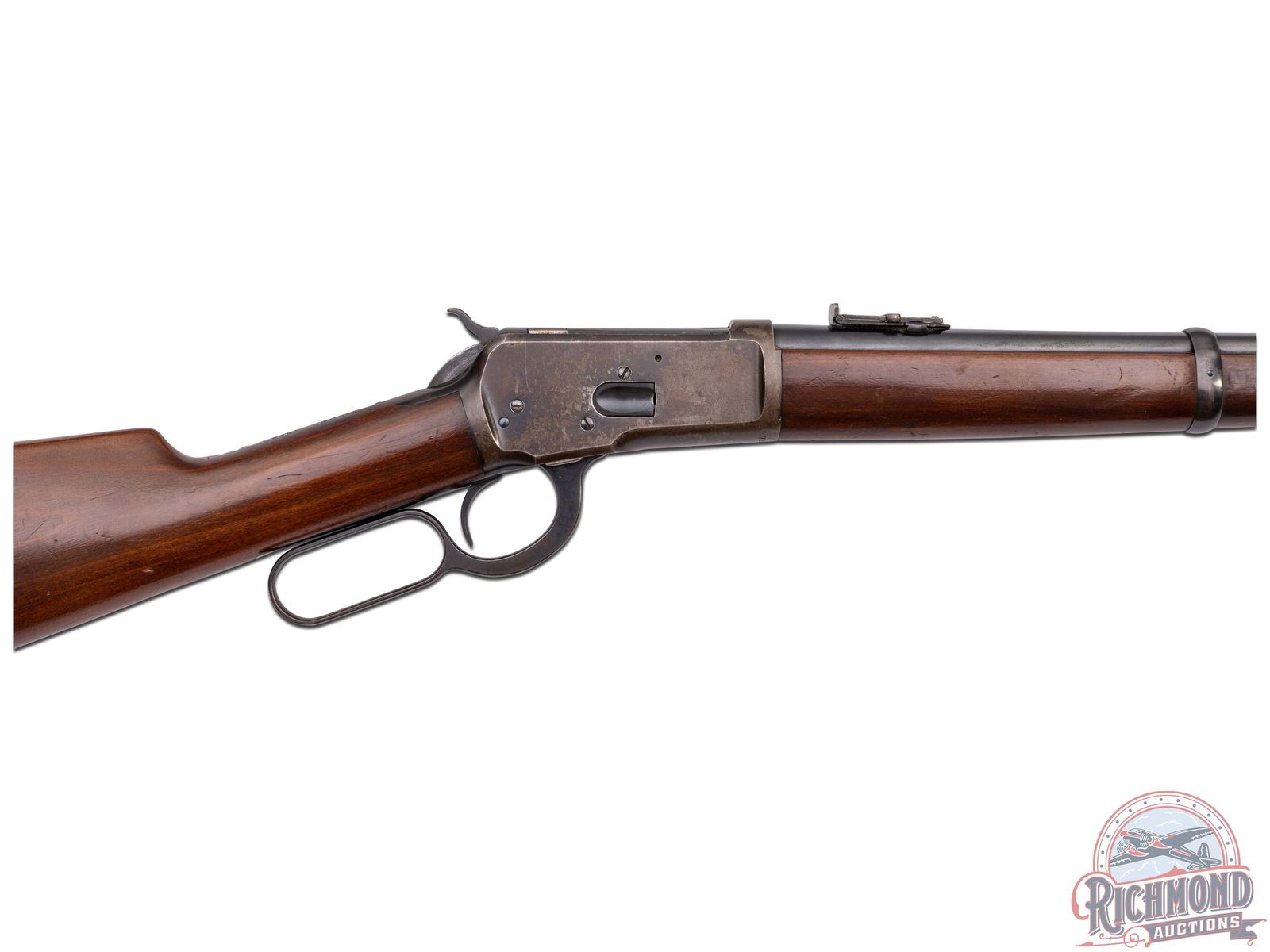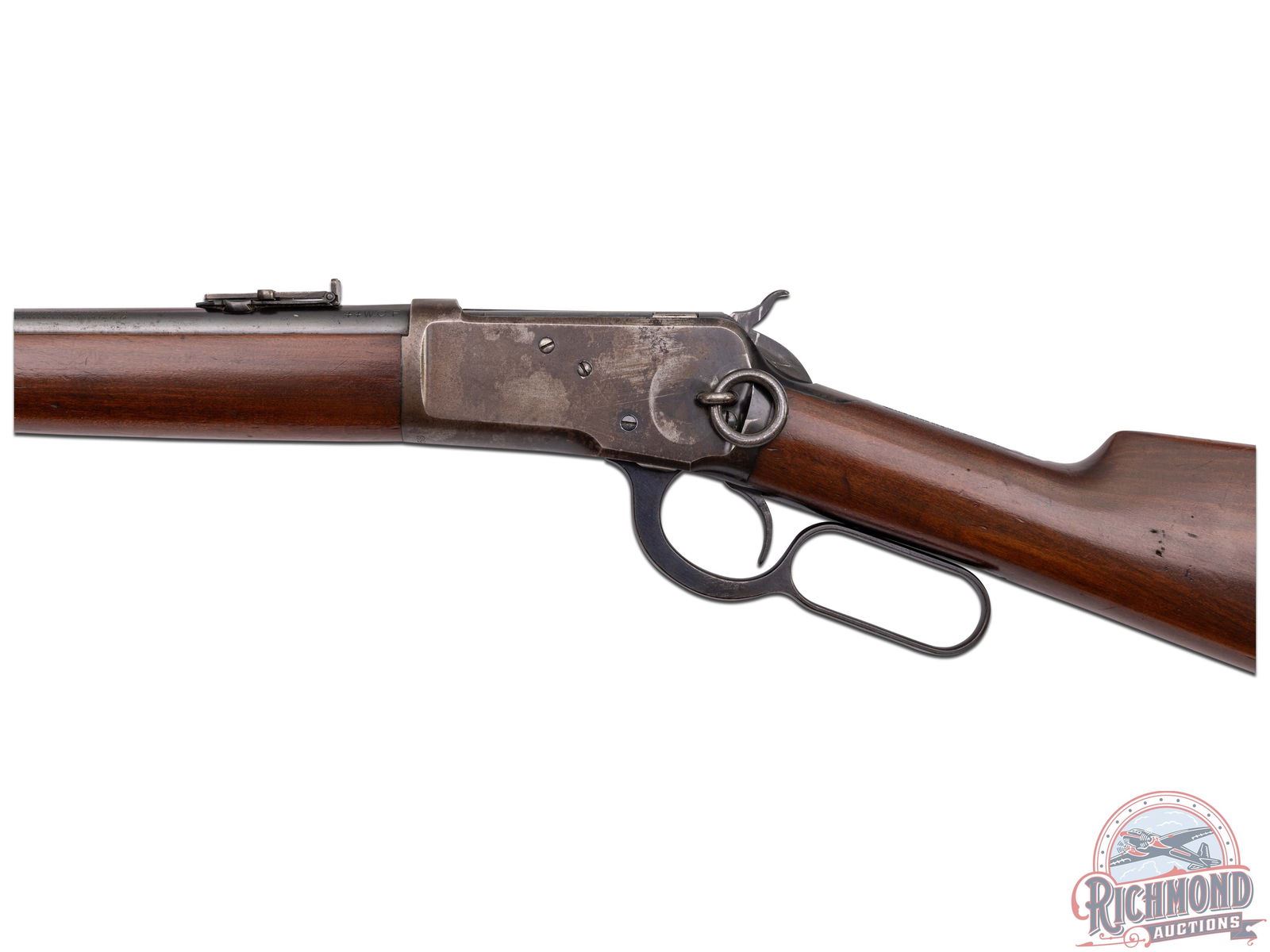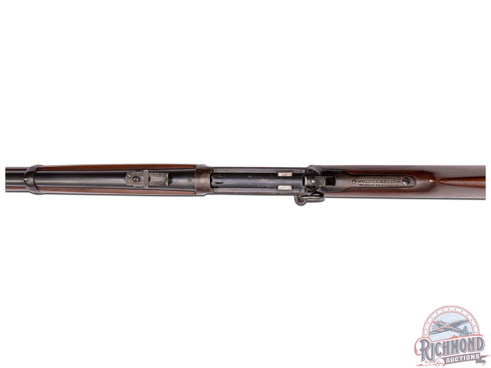 Manufactured in 1915. This sporting rifle features a 20" blued round barrel with original rear ladder sight and blade front sight. Full length magazine tube with two barrel rings. Barrel is stamped on the left side with the two line Winchester address and "44 WCF" near the receiver. Left side of the receiver is fitted with a saddle ring. Winchester proof marks on barrel and receiver. Tang is stamped "MODEL 92 / -WINCHESTER- / TRADE MARK REG. IN US PAT OFF". Straight walnut wood stock and matching forearm with period correct metal butt plate. LOP: 12-3/4". CALIBER: 44 WCF. S/N: 785258. FFL STATUS: Curio & Relic.