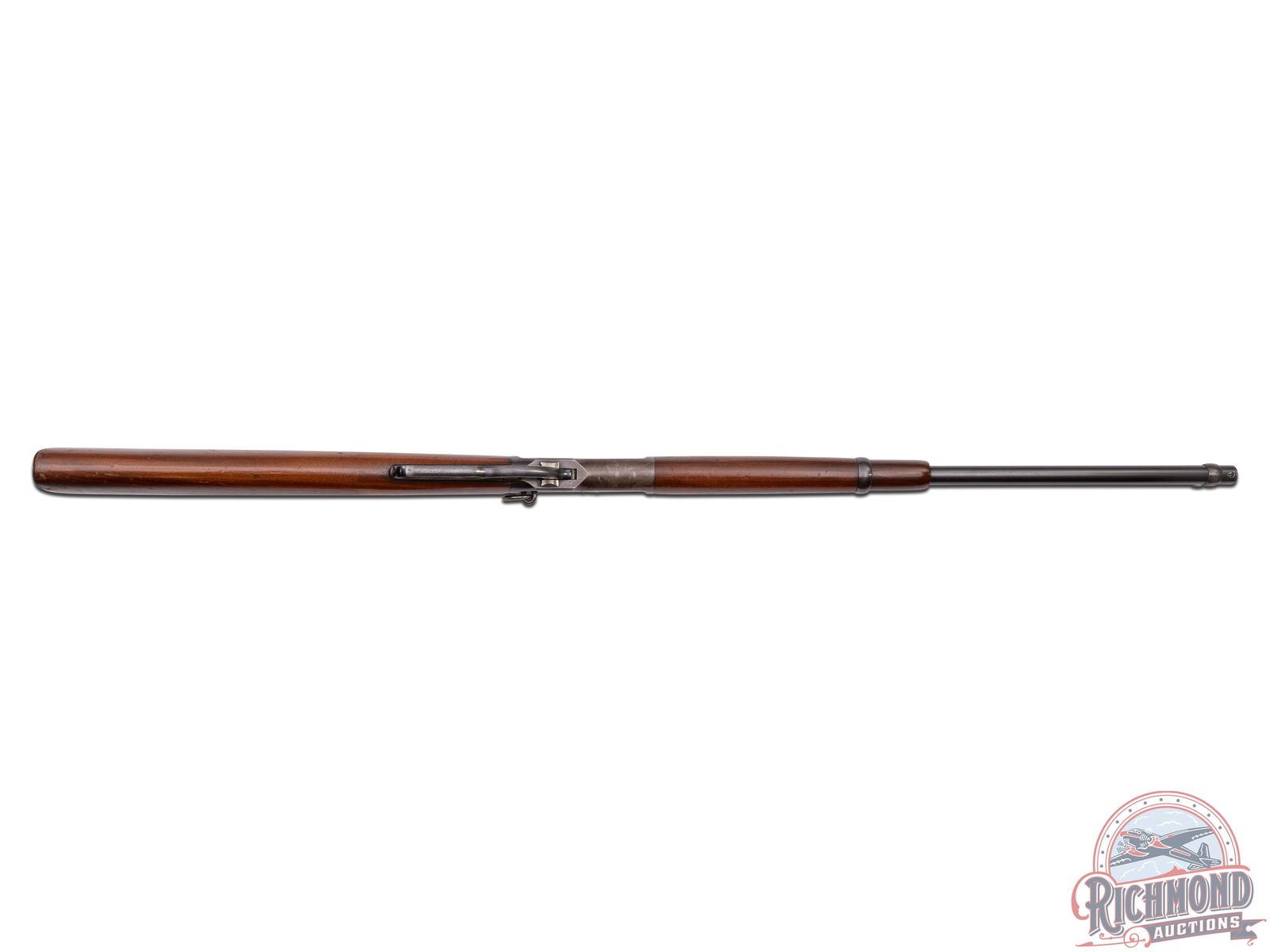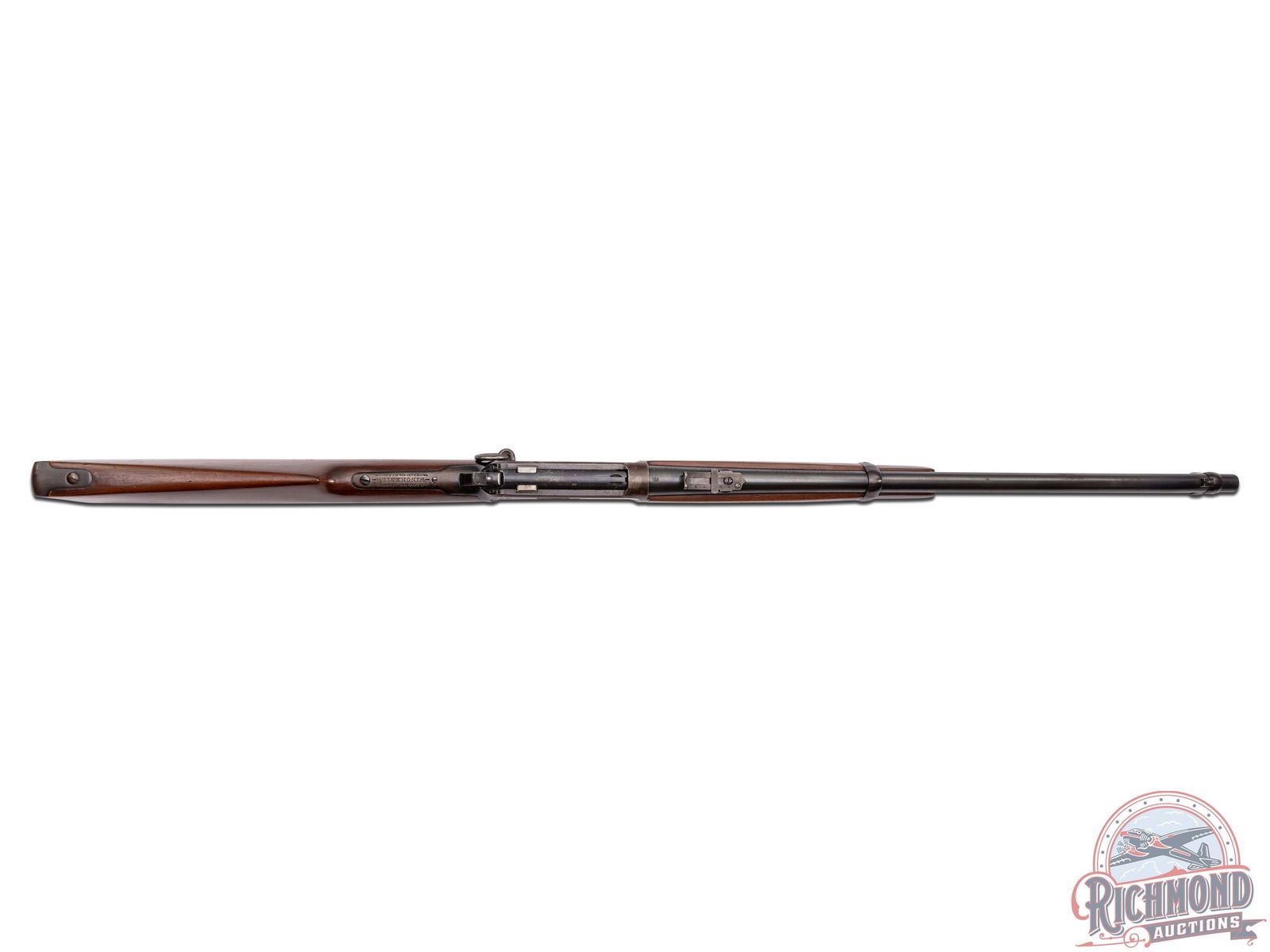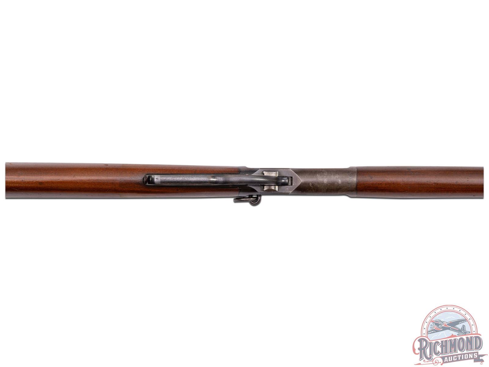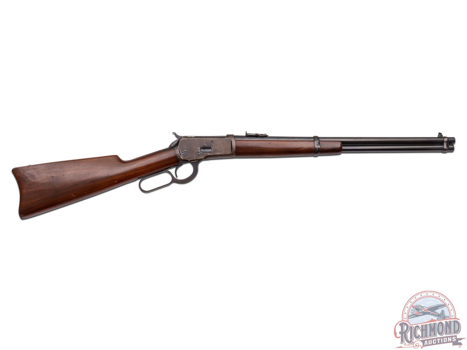 Manufactured in 1915. This sporting rifle features a 20" blued round barrel with original rear ladder sight and blade front sight. Full length magazine tube with two barrel rings. Barrel is stamped on the left side with the two line Winchester address and "44 WCF" near the receiver. Left side of the receiver is fitted with a saddle ring. Winchester proof marks on barrel and receiver. Tang is stamped "MODEL 92 / -WINCHESTER- / TRADE MARK REG. IN US PAT OFF". Straight walnut wood stock and matching forearm with period correct metal butt plate. LOP: 12-3/4". CALIBER: 44 WCF. S/N: 785258. FFL STATUS: Curio & Relic.