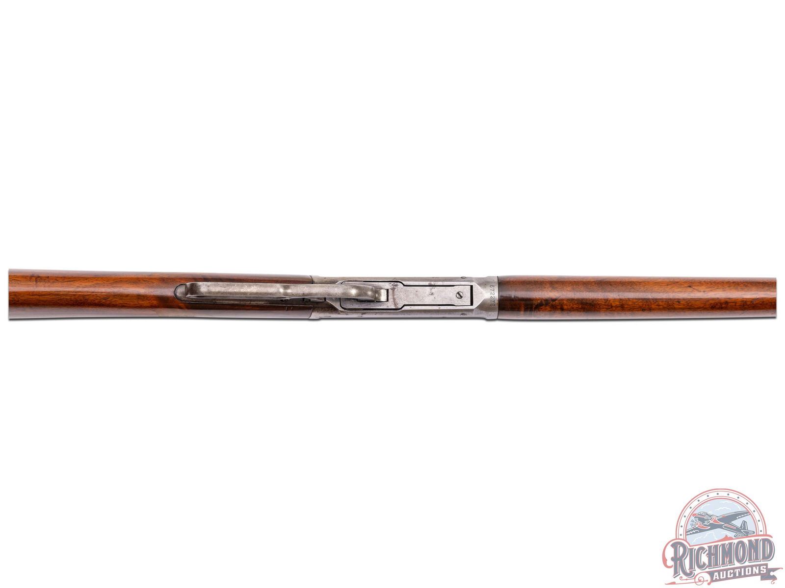 Manufactured in 1914. Features a 26" round blued barrel with half magazine tube making it a lightweight model. Marble's rear adjustable notch sight and blade front sight. Rear left side of the barrel is stamped "NICKEL STEEL BARREL / ESPECIALLY FOR SMOKELESS POWER" and caliber "30 W.C.F." with the Winchester proof marks on the top of the barrel and receiver. Tang is stamped "MODEL 1894 / -WINCHESTER- / TRADE MARK REG. IN US PAT. OFF.". Highly figured walnut straight stock and matching forearm with metal cap. Fitted with a factory Winchester synthetic checkered butt plate. LOP: 13-1/2". CALIBER: 30 WCF. S/N: 672272. FFL STATUS: Curio & Relic.