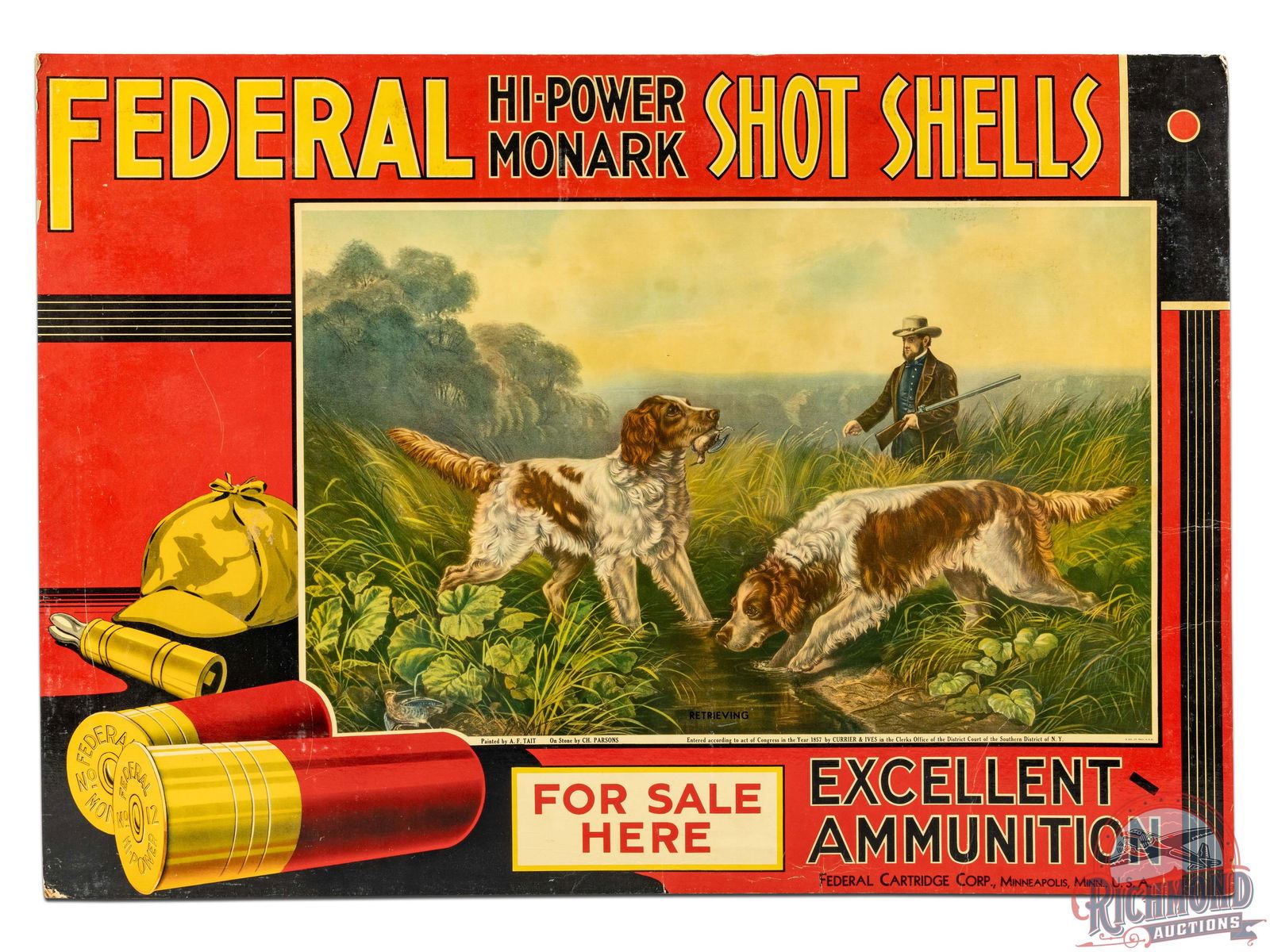 Lot 867 NOS Federal Hi-Power Monark Shot Shells "Retrieving" Easel Back Cardboard Sign & Original Box