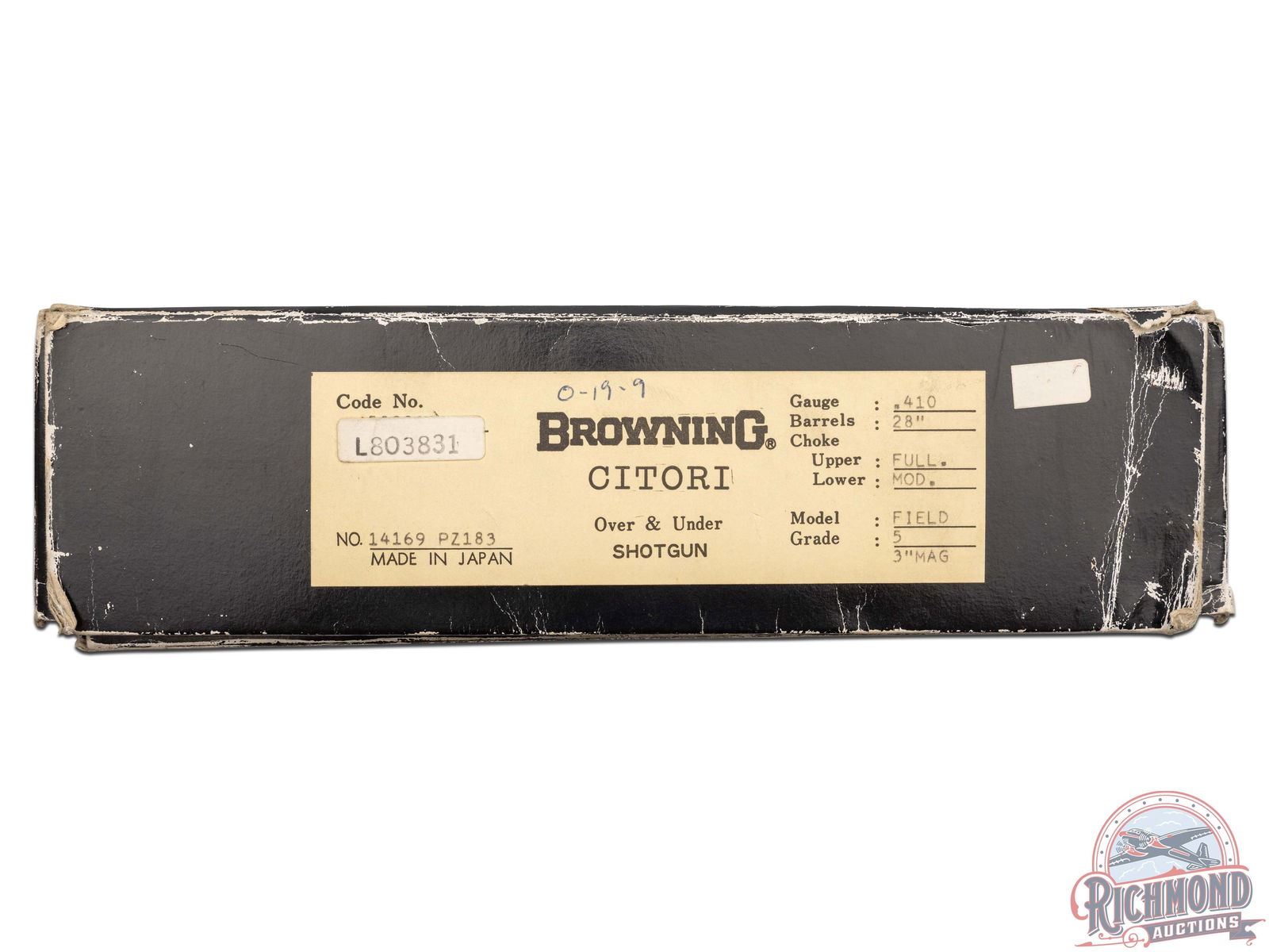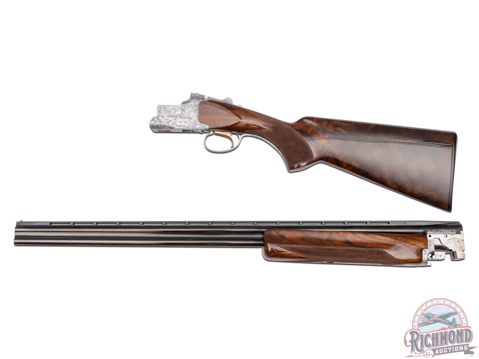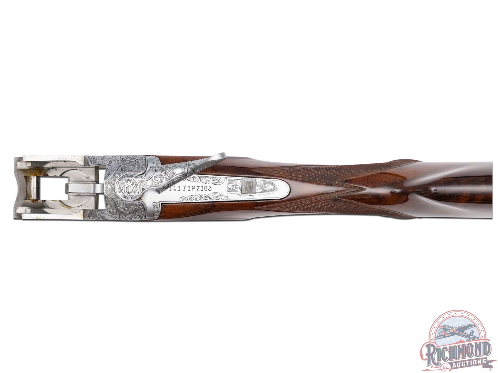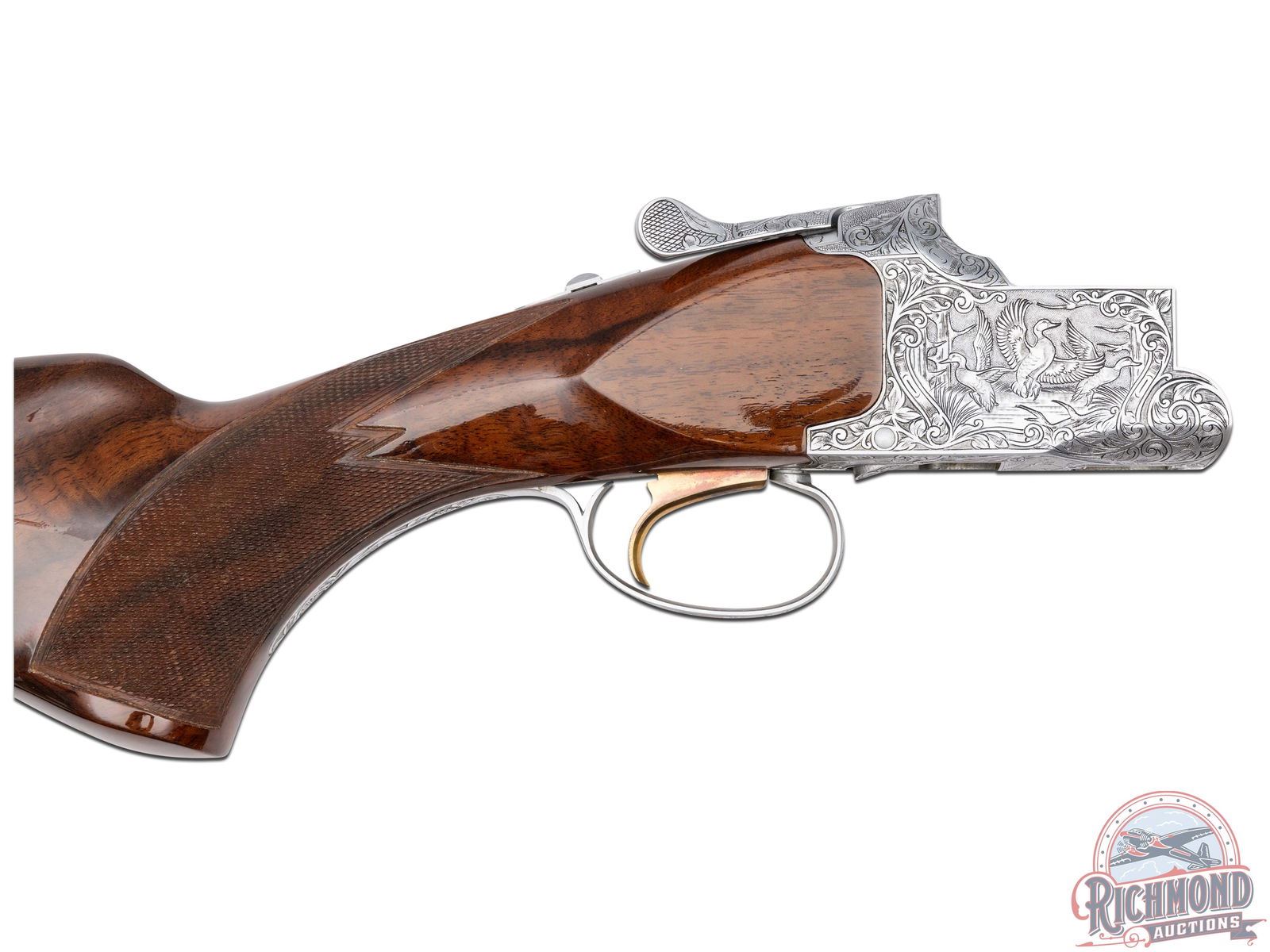 Manufactured in 1981. Features 28" blued barrels with single nickel bead front sight on a ventilated rib. Chambered for 2-1/2" and 3" shells choked Full and Modified and equipped with automatic ejectors. The coin finished action has deep floral scroll engraving which extends to the break lever, trigger guard, tang, barrel breeches and forearm hardware. The right side of the action is engraved with a game scene of three ducks taking to flight from a wooded marsh, with the left side similarly engraved with three pheasants in a wooded field scene. Signed by engraver "M.IKEZAWA" near the bottom. The underside of the action is also engraved with a setter and a flushed pheasant, along with a quail in flight on the trigger guard. Select grade V checkered walnut pistol grip stock, trap style forearm with a gloss finish. Gold washed single selective trigger / tang safety. Fitted with a factory Browning textured black plastic butt plate. Comes in a non-matching factory box with manual. LOP: 14". DAC: 1-1/4". DAH: 2". CALIBER: 410. S/N: 14171PZ183. FFL STATUS: Modern.