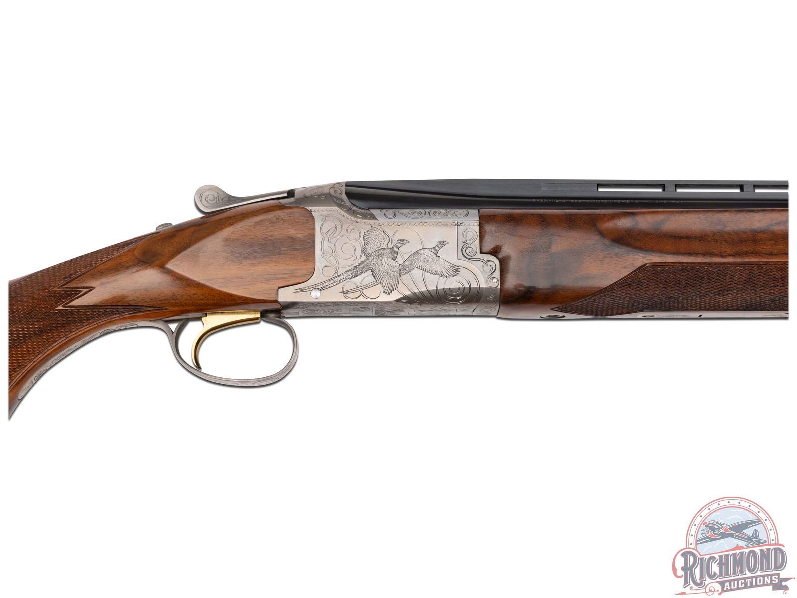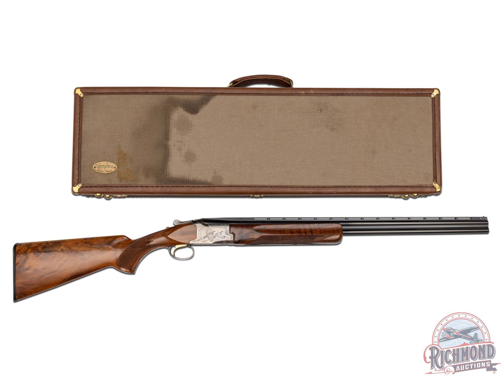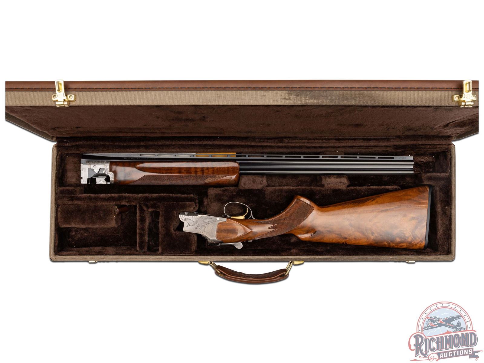 Made by Browning in 1981. 26" blued Special Steel barrels with ventilated rib, bead front sight, ejectors, 3" chambers, and Modified and Improved cylinder chokes in desirable 410 caliber. Barrel is marked with Browning Utah and Montreal addresses with steel and caliber markings. Satin finished engraved action with flying ducks, quail, and pheasant scene. Action has gold washed trigger, top tang safety, and satin finished engraved trigger guard. Walnut checkered pistol grip stock with "Browning" butt plate with walnut checkered competition style attached forearm with latch release. Comes in canvas Browning trunk case. LOP: 14-1/4". DAC: 1-1/2". DAH: 2". CALIBER: 410. S/N: 07000PZ183. FFL STATUS: Modern.