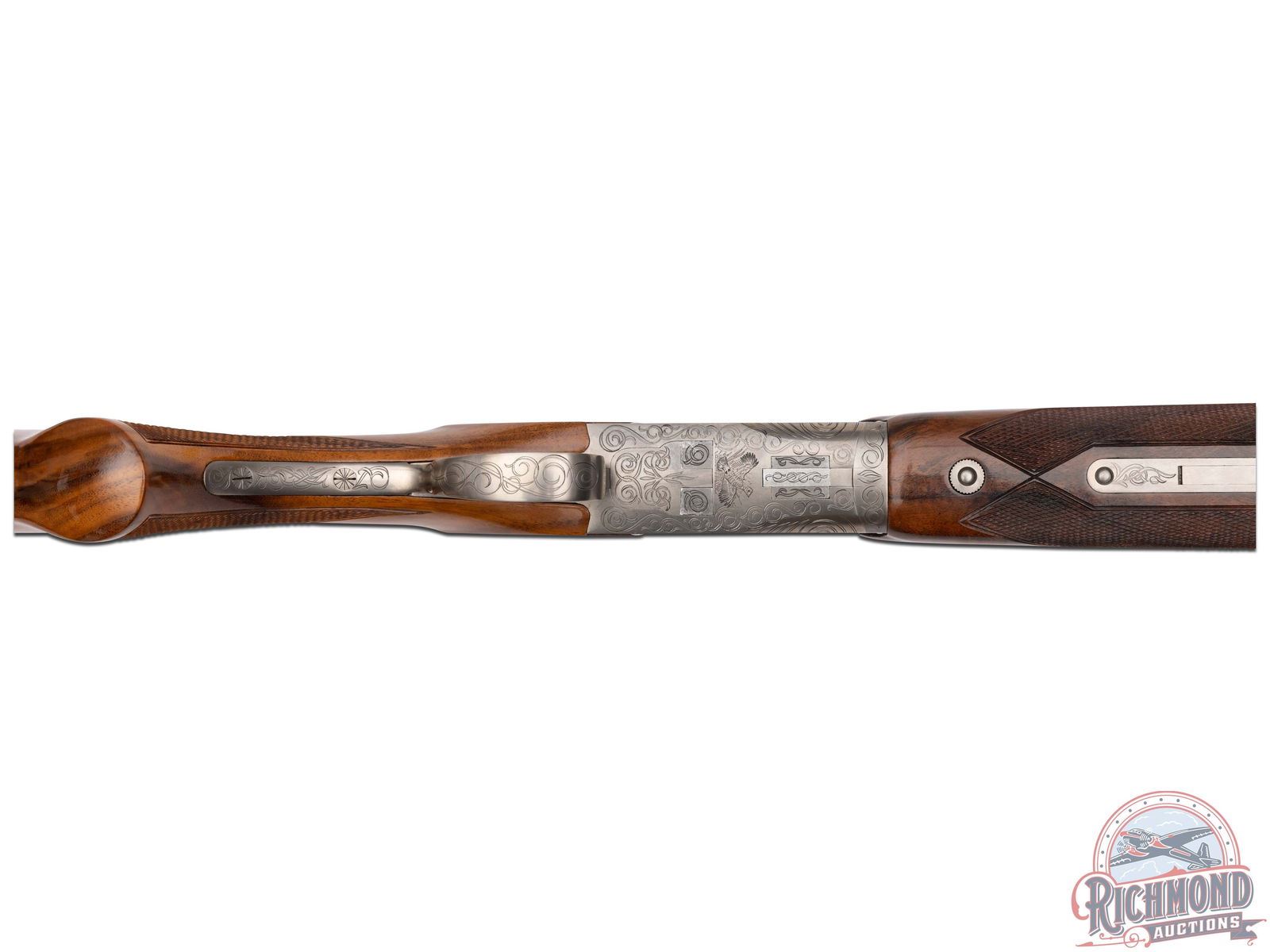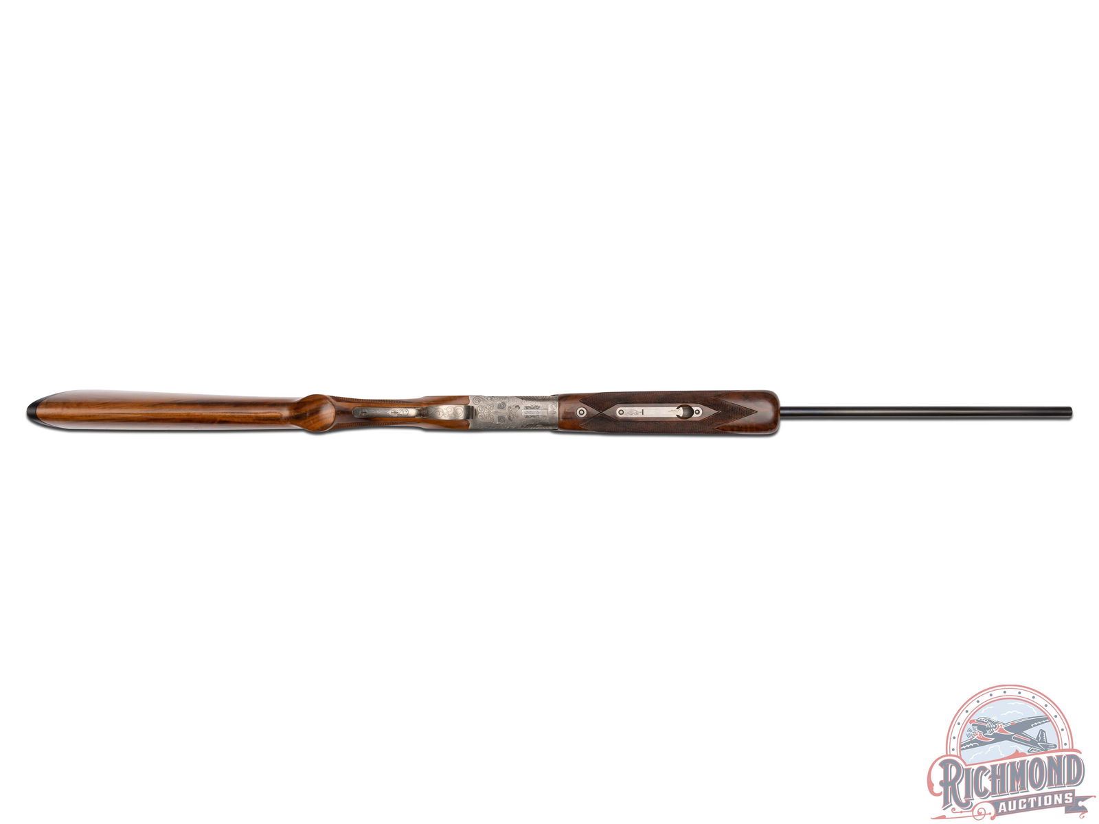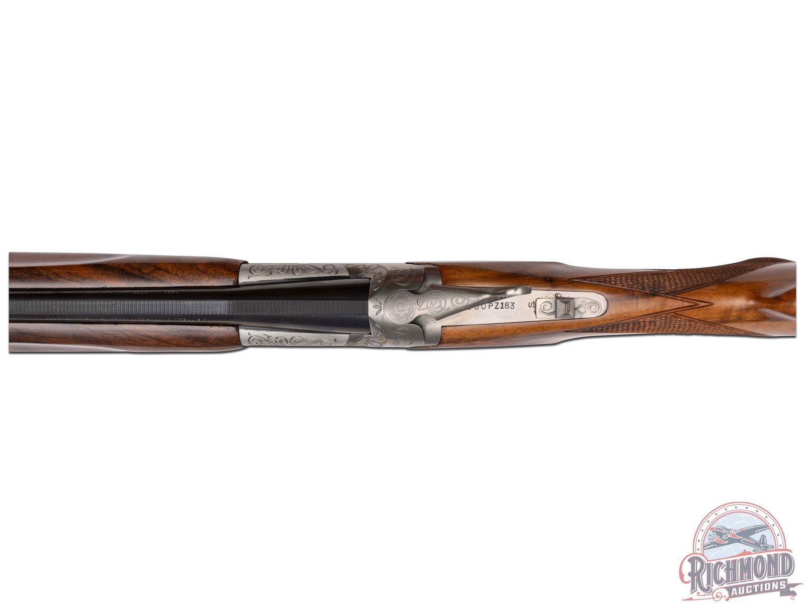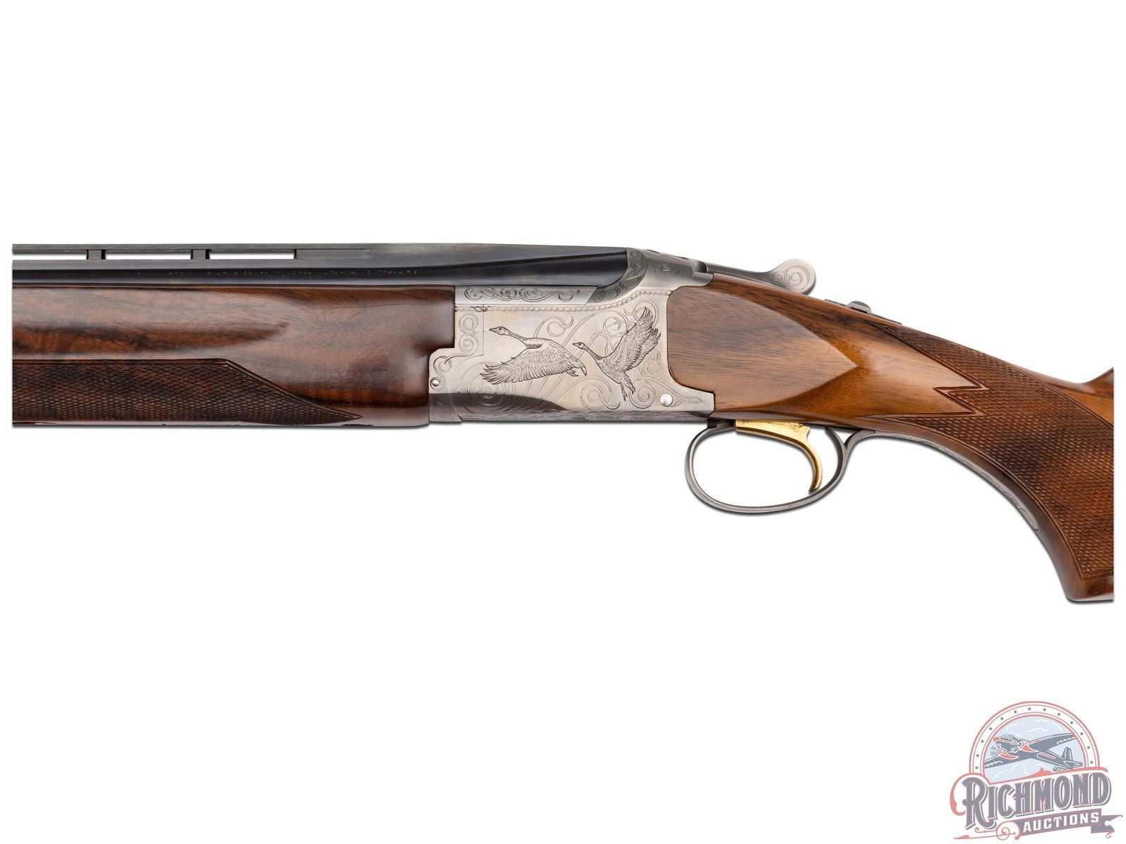 Made by Browning in 1981. 26" blued Special Steel barrels with ventilated rib, bead front sight, ejectors, 3" chambers, and Modified and Improved cylinder chokes in desirable 410 caliber. Barrel is marked with Browning Utah and Montreal addresses with steel and caliber markings. Satin finished engraved action with flying ducks, quail, and pheasant scene. Action has gold washed trigger, top tang safety, and satin finished engraved trigger guard. Walnut checkered pistol grip stock with "Browning" butt plate with walnut checkered competition style attached forearm with latch release. Comes in canvas Browning trunk case. LOP: 14-1/4". DAC: 1-1/2". DAH: 2". CALIBER: 410. S/N: 07000PZ183. FFL STATUS: Modern.