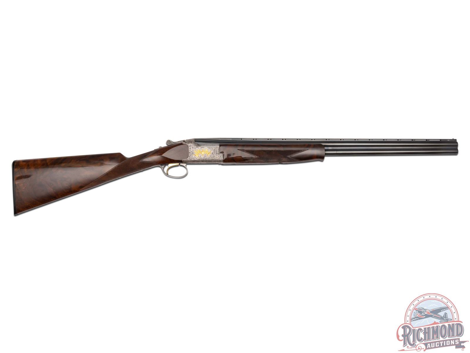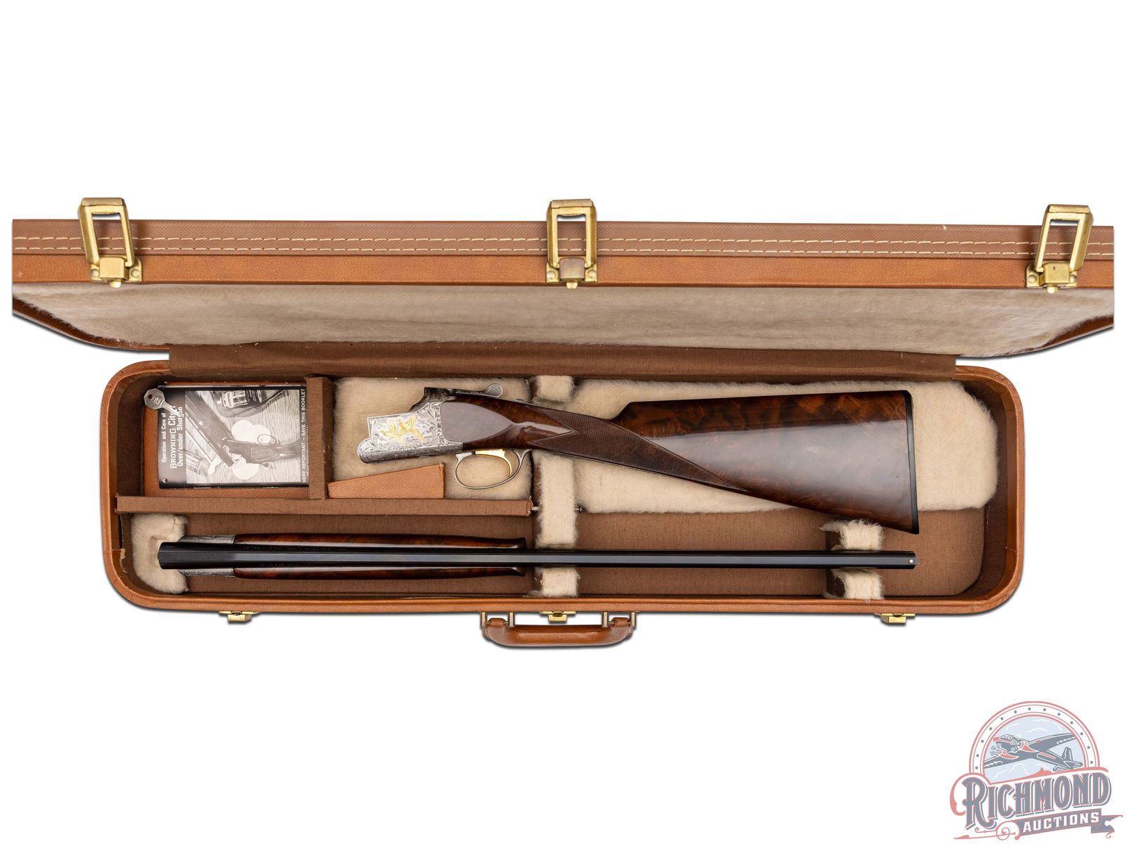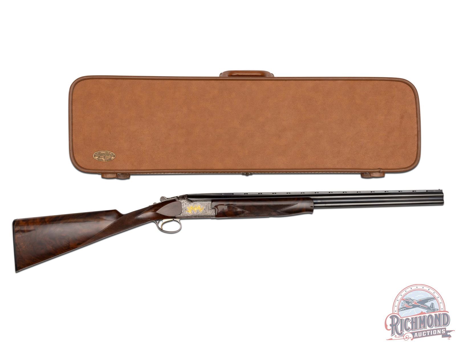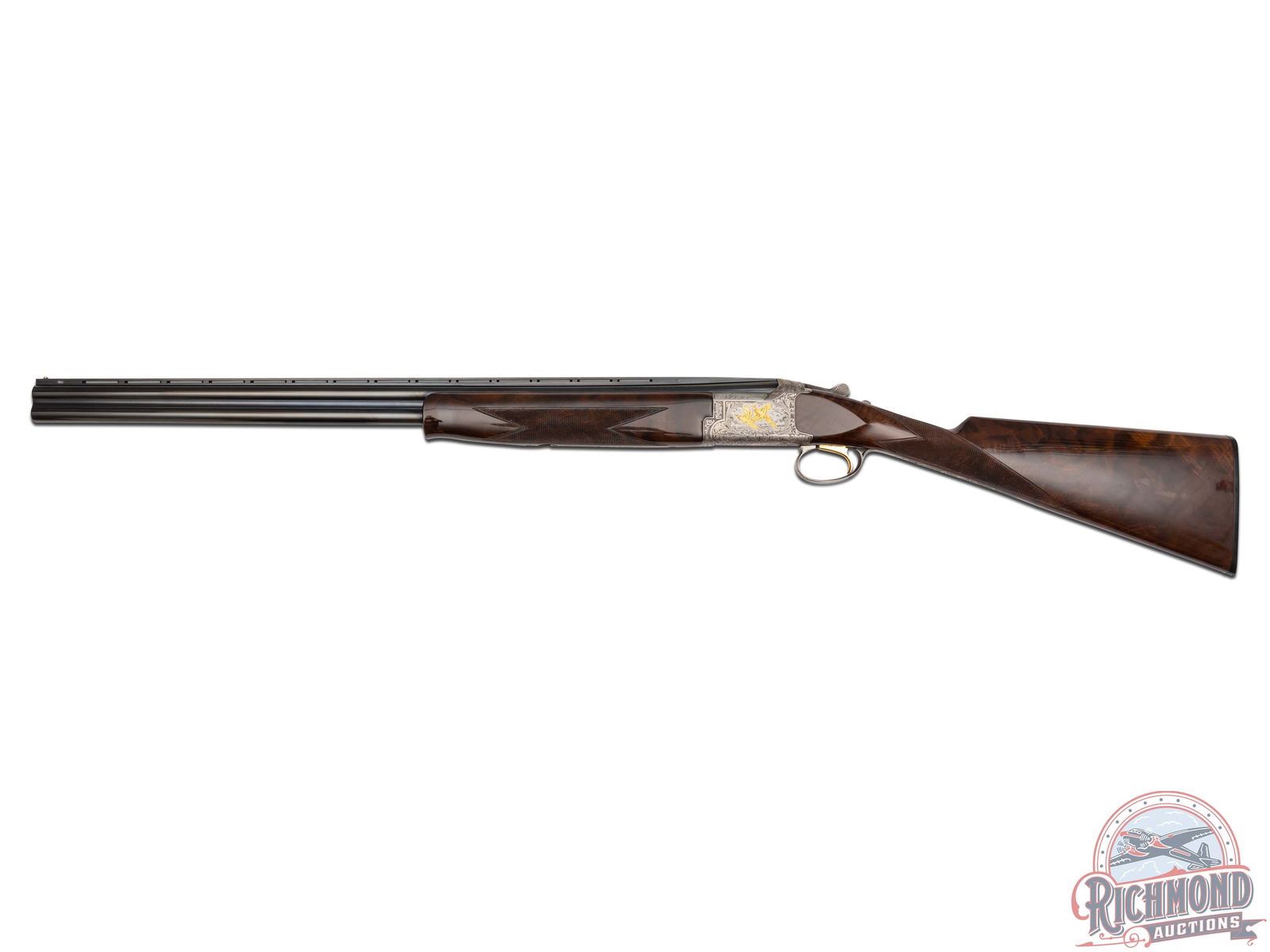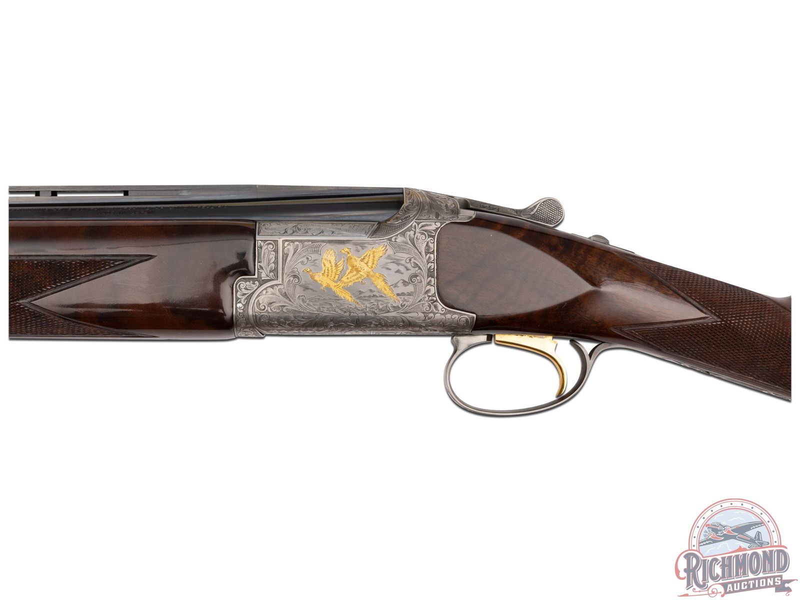 Manufactured in 1987. 26" blued Special Steel barrels with ventilated rib, bead front sight, 2-3/4" chambers, ejectors, and Modified and Improved cylinder chokes in 28 gauge. Barrels are marked with Browning Utah and Montreal Addresses and standard gauge and chamber markings. Satin finish floral engraved boxlock receiver with gold pheasants on left, three gold ducks on right with floral background and gold setter on bottom of receiver. Action has satin finish trigger guard with gold quail inlay and gold washed single selective trigger and top tang safety barrel selector. Dark figured walnut checkered English grip stock with "Browning" hard rubber butt plate. Matching attached scaled down checkered Schnabel forearm with latch release. Comes in Browning luggage trunk case. LOP: 14-1/4". DAC: 1-1/2". DAH: 2". CALIBER: 28 GA. S/N: 28161PRF73. FFL STATUS: Modern.