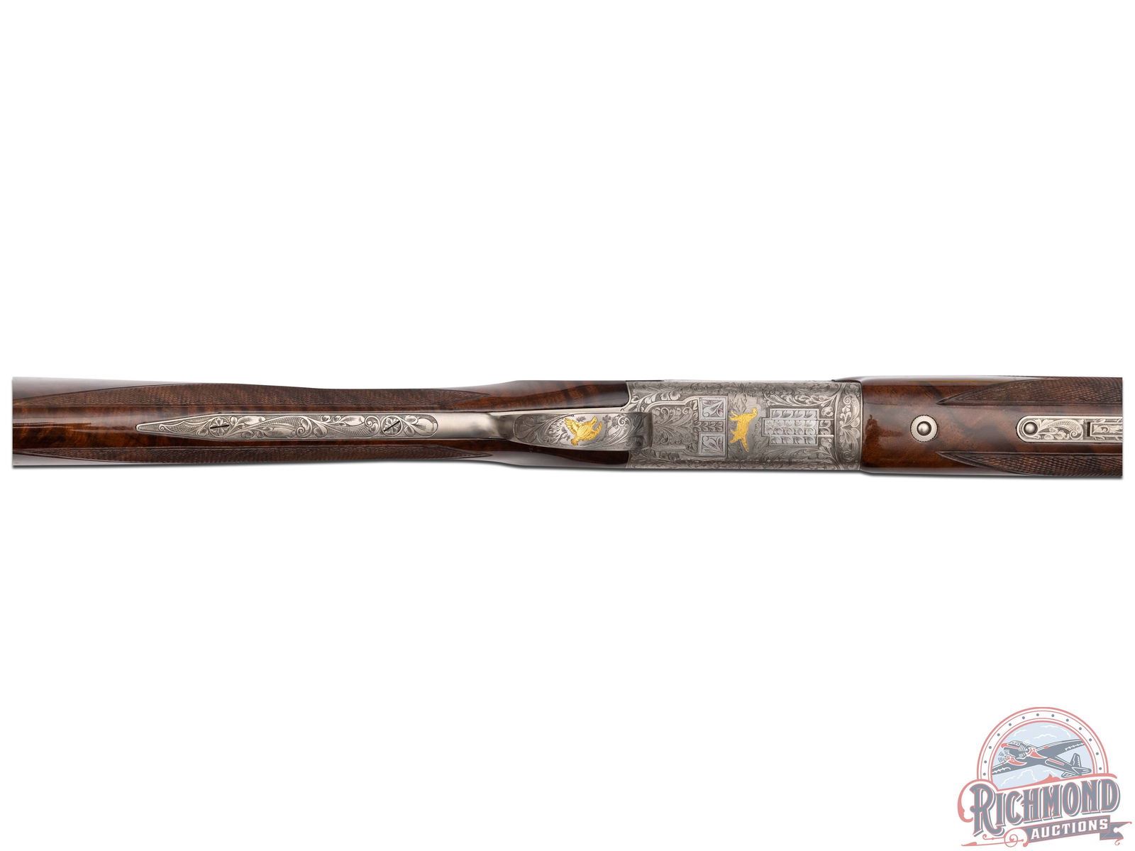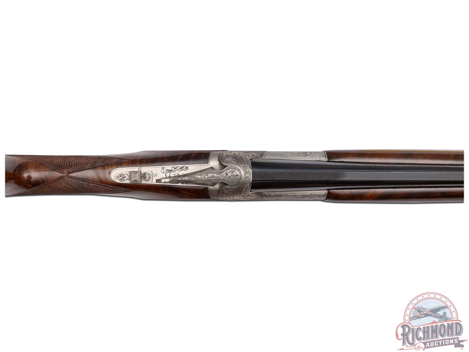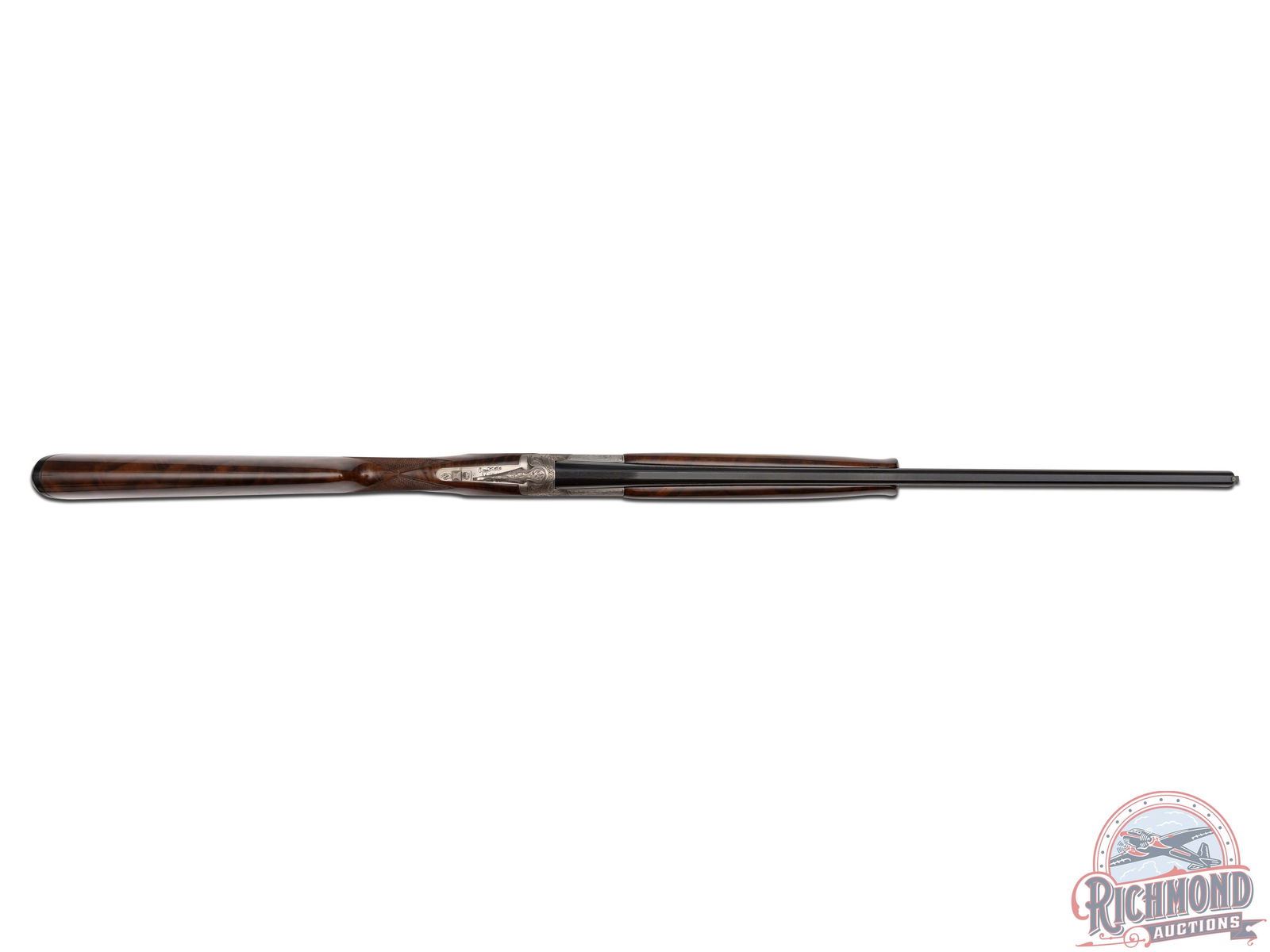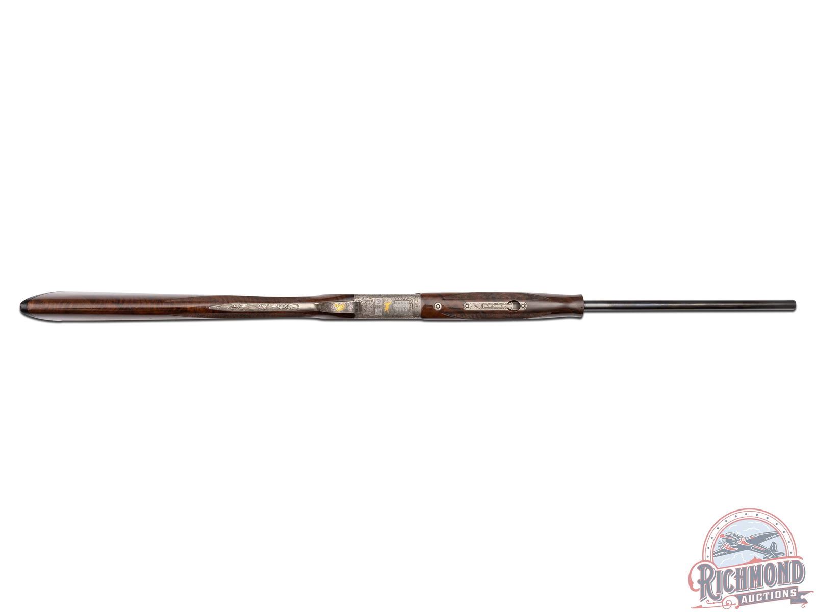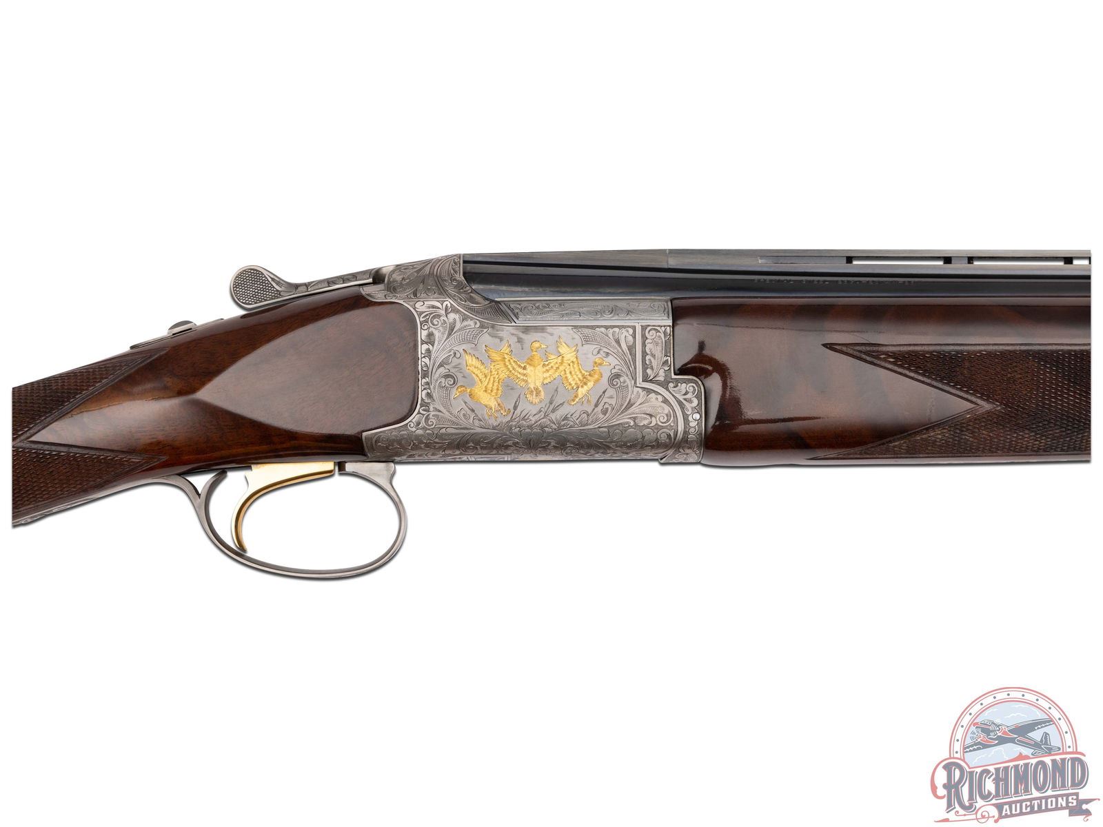Manufactured in 1987. 26" blued Special Steel barrels with ventilated rib, bead front sight, 2-3/4" chambers, ejectors, and Modified and Improved cylinder chokes in 28 gauge. Barrels are marked with Browning Utah and Montreal Addresses and standard gauge and chamber markings. Satin finish floral engraved boxlock receiver with gold pheasants on left, three gold ducks on right with floral background and gold setter on bottom of receiver. Action has satin finish trigger guard with gold quail inlay and gold washed single selective trigger and top tang safety barrel selector. Dark figured walnut checkered English grip stock with "Browning" hard rubber butt plate. Matching attached scaled down checkered Schnabel forearm with latch release. Comes in Browning luggage trunk case. LOP: 14-1/4". DAC: 1-1/2". DAH: 2". CALIBER: 28 GA. S/N: 28161PRF73. FFL STATUS: Modern.
