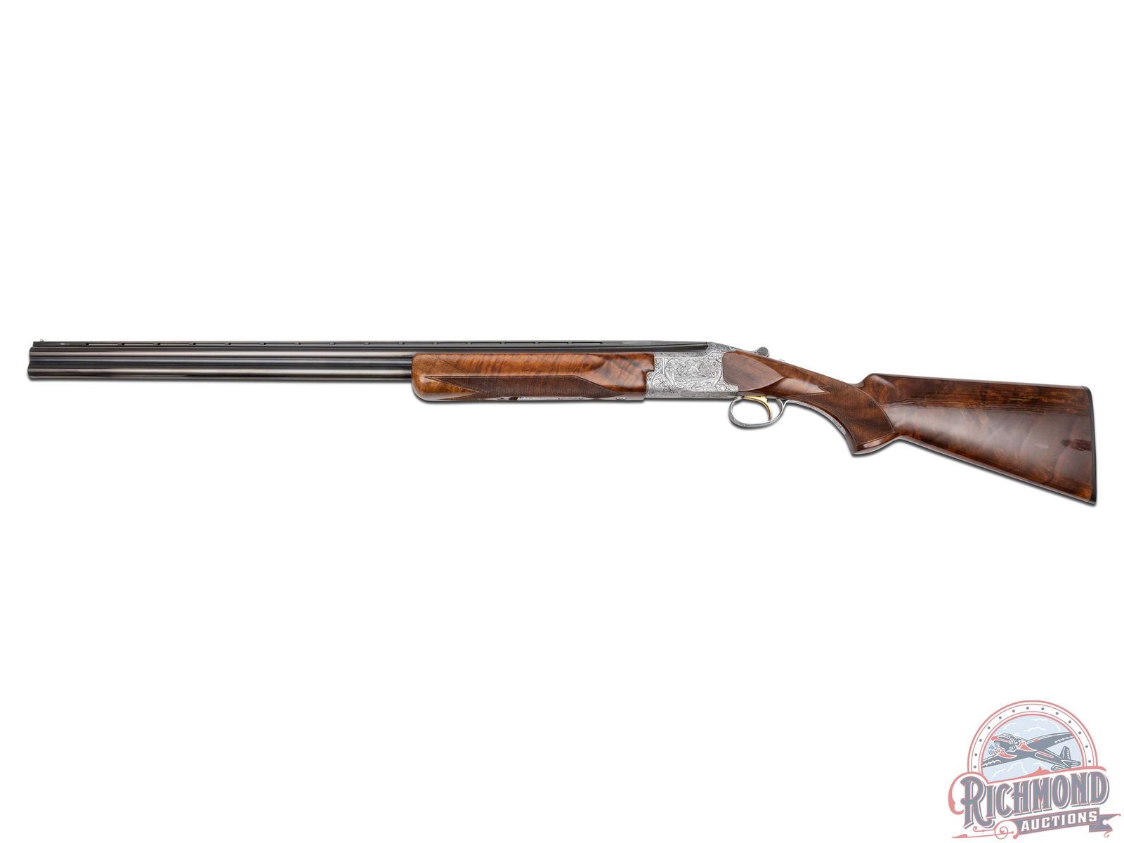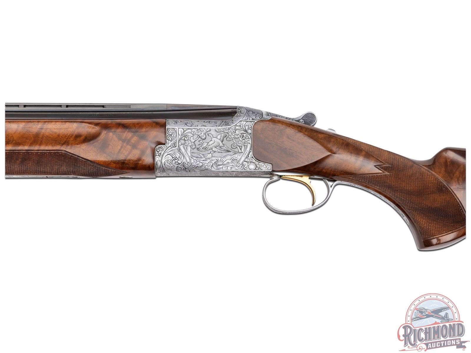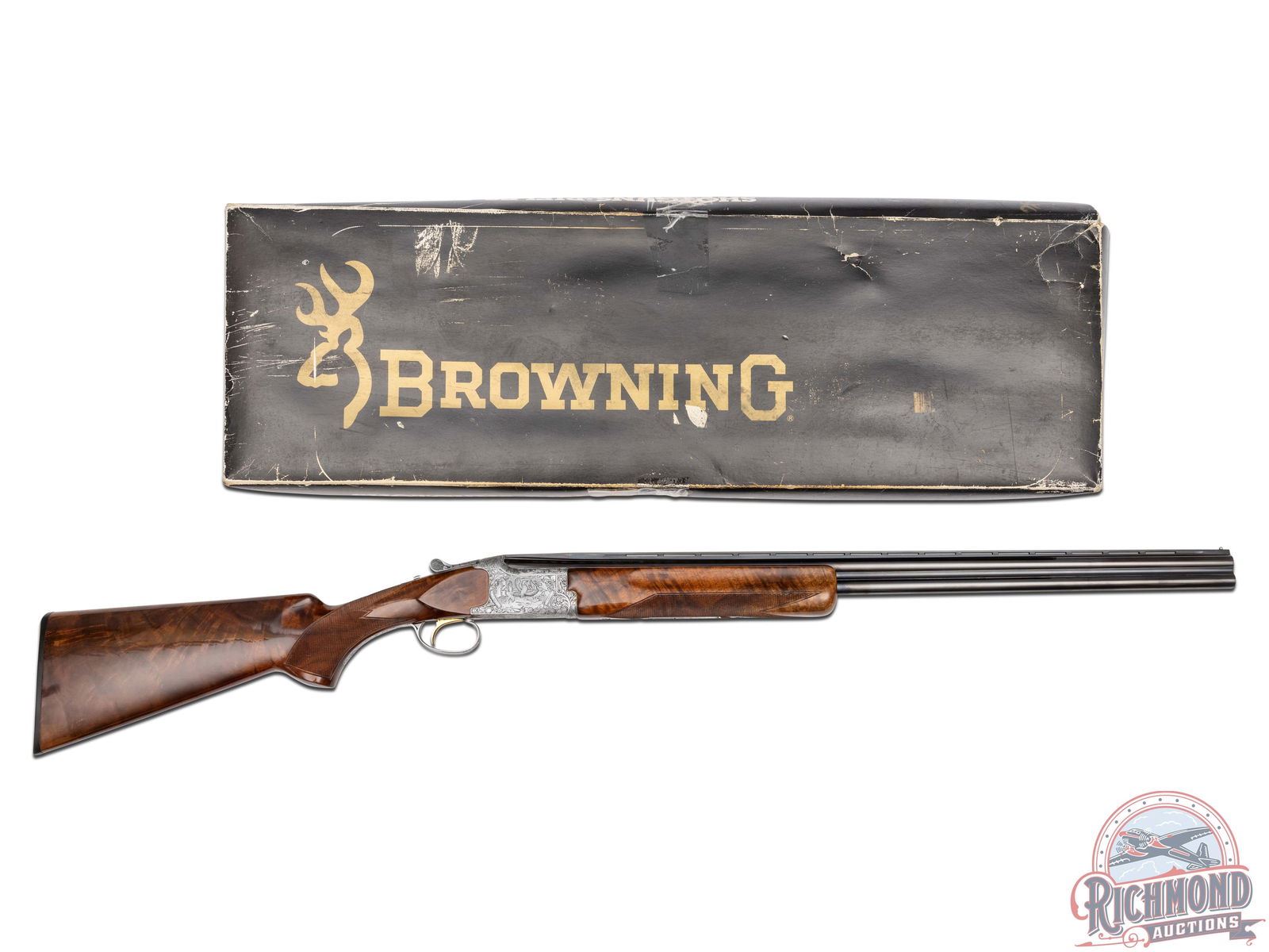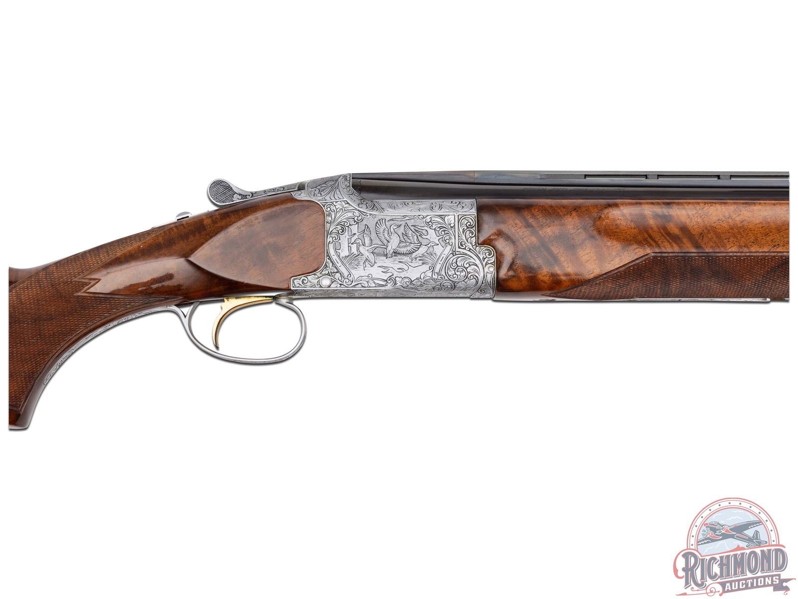 Manufactured in 1978. Features 28" blued barrels with single nickel bead front sight on a matte ventilated rib. Chambered for 2-3/4" shells choked Full and Improved modified and equipped with automatic ejectors. The coin finished action has deep floral scroll engraving which extends to the break lever, trigger guard, tang, barrel breeches and forearm hardware. The right side of the action is engraved with a game scene of three ducks taking to flight from a wooded marsh, with the left side similarly engraved with three pheasants in a wooded field scene. The underside of the action is also engraved with a setter and a flushed pheasant, along with a quail in flight on the trigger guard. Select high grade checkered walnut pistol grip stock, skeet style forearm with a polished finish. Gold washed single selective trigger / tang safety. Fitted with a factory Browning textured black plastic butt plate. Includes non-matching box. LOP: 14". DAC: 1-1/2". DAH: 2". CALIBER: 28 GA. S/N: 08130RP573. FFL STATUS: Modern.