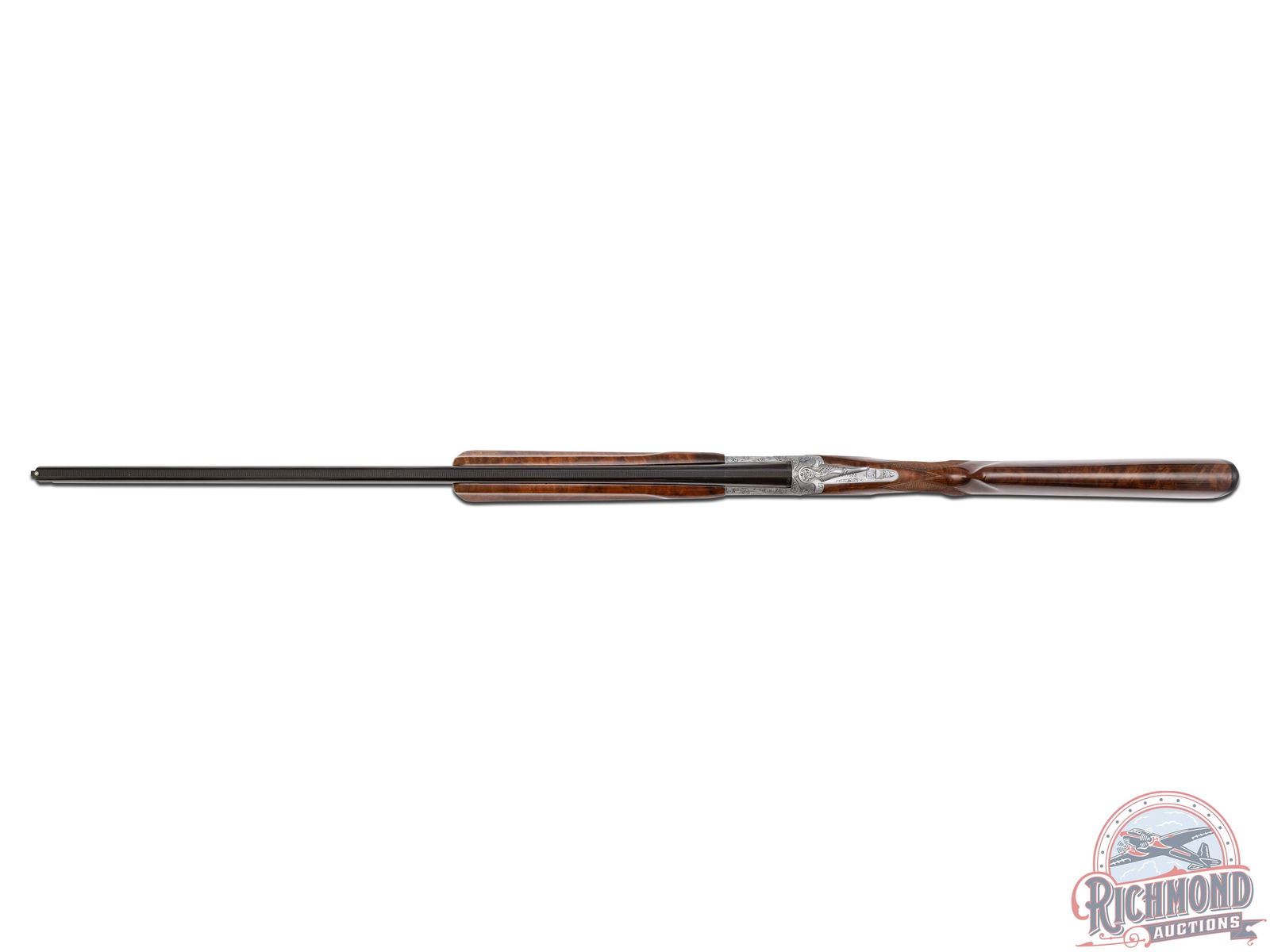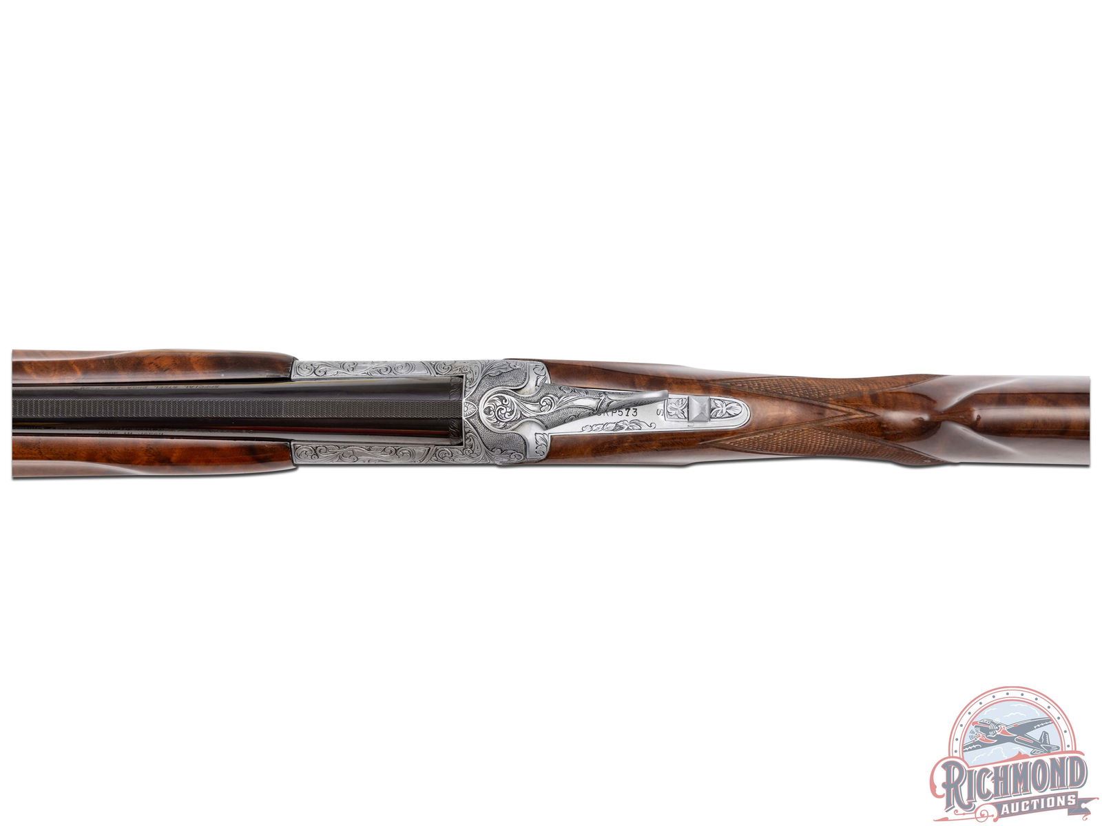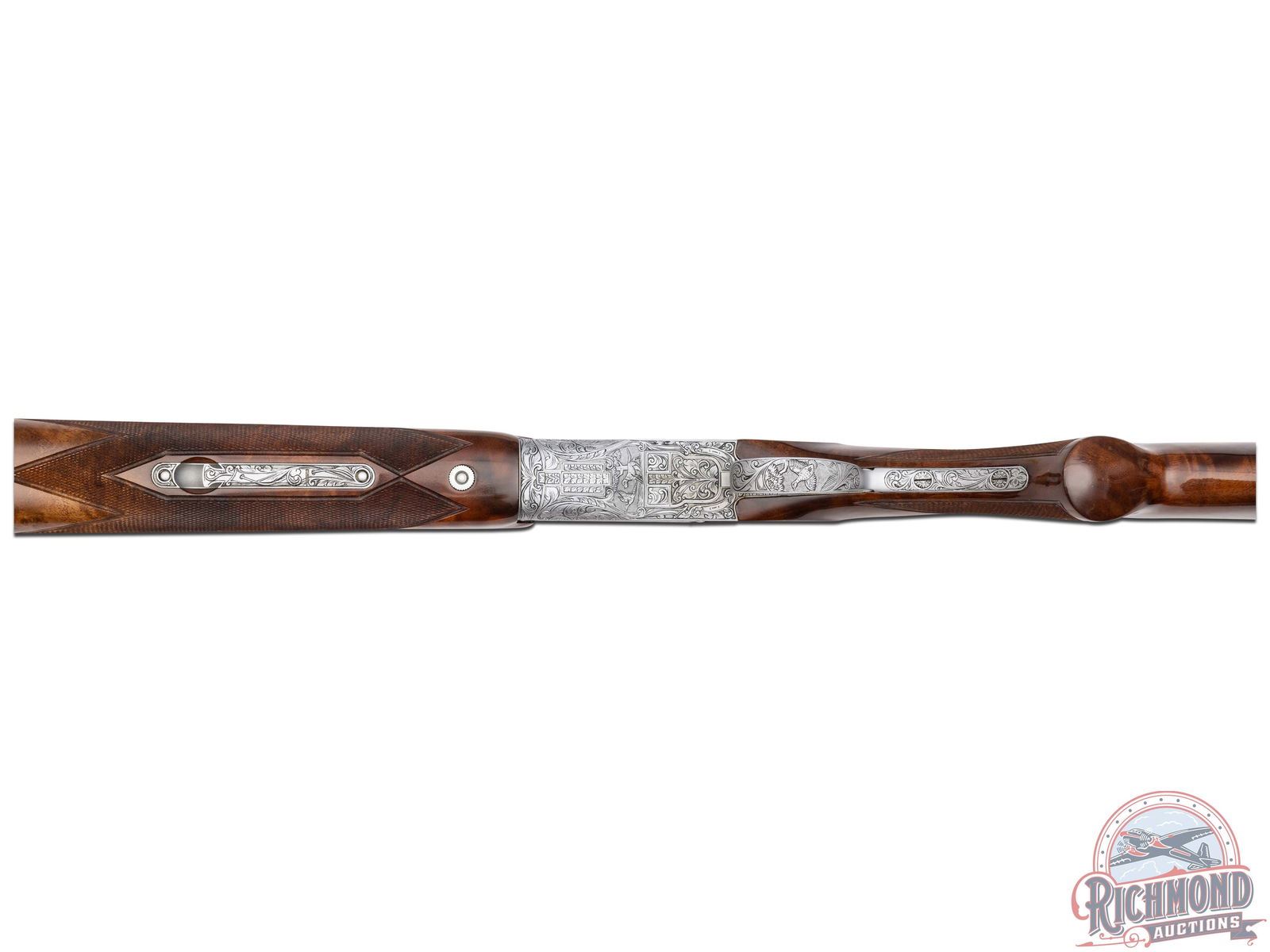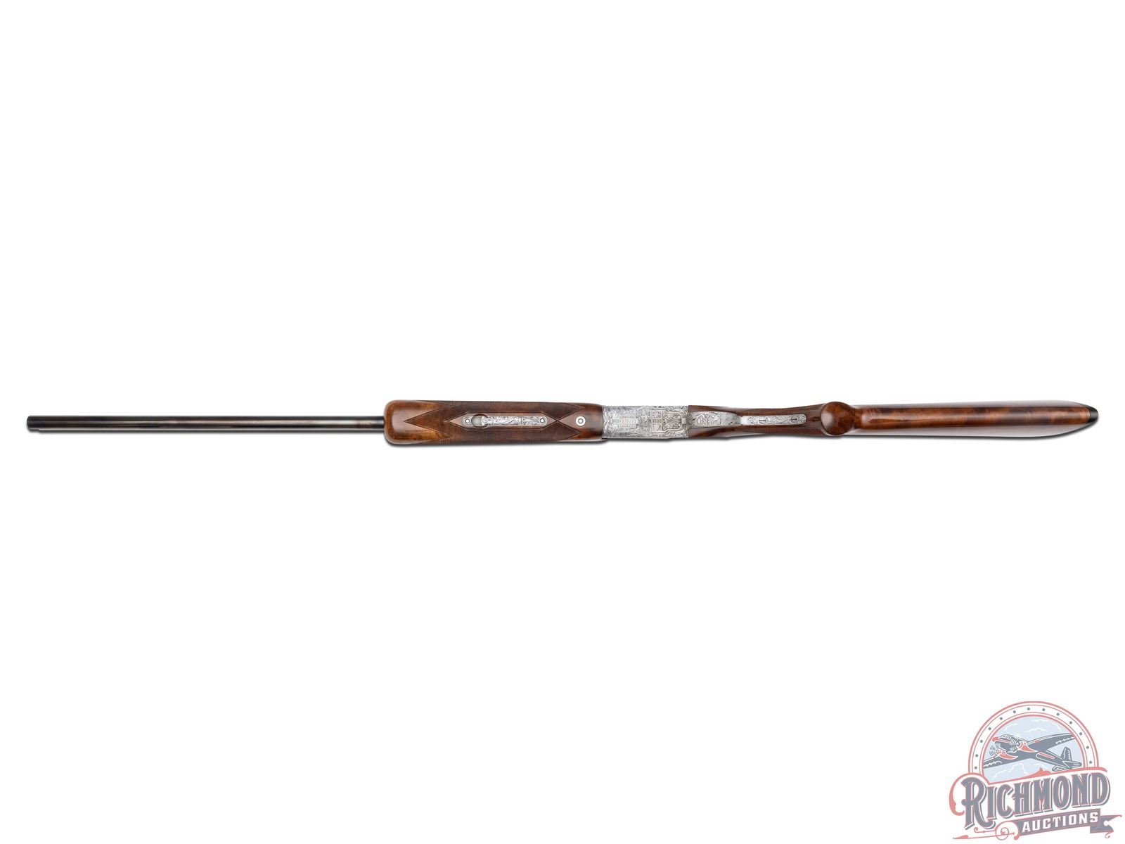 Manufactured in 1978. Features 28" blued barrels with single nickel bead front sight on a matte ventilated rib. Chambered for 2-3/4" shells choked Full and Improved modified and equipped with automatic ejectors. The coin finished action has deep floral scroll engraving which extends to the break lever, trigger guard, tang, barrel breeches and forearm hardware. The right side of the action is engraved with a game scene of three ducks taking to flight from a wooded marsh, with the left side similarly engraved with three pheasants in a wooded field scene. The underside of the action is also engraved with a setter and a flushed pheasant, along with a quail in flight on the trigger guard. Select high grade checkered walnut pistol grip stock, skeet style forearm with a polished finish. Gold washed single selective trigger / tang safety. Fitted with a factory Browning textured black plastic butt plate. Includes non-matching box. LOP: 14". DAC: 1-1/2". DAH: 2". CALIBER: 28 GA. S/N: 08130RP573. FFL STATUS: Modern.