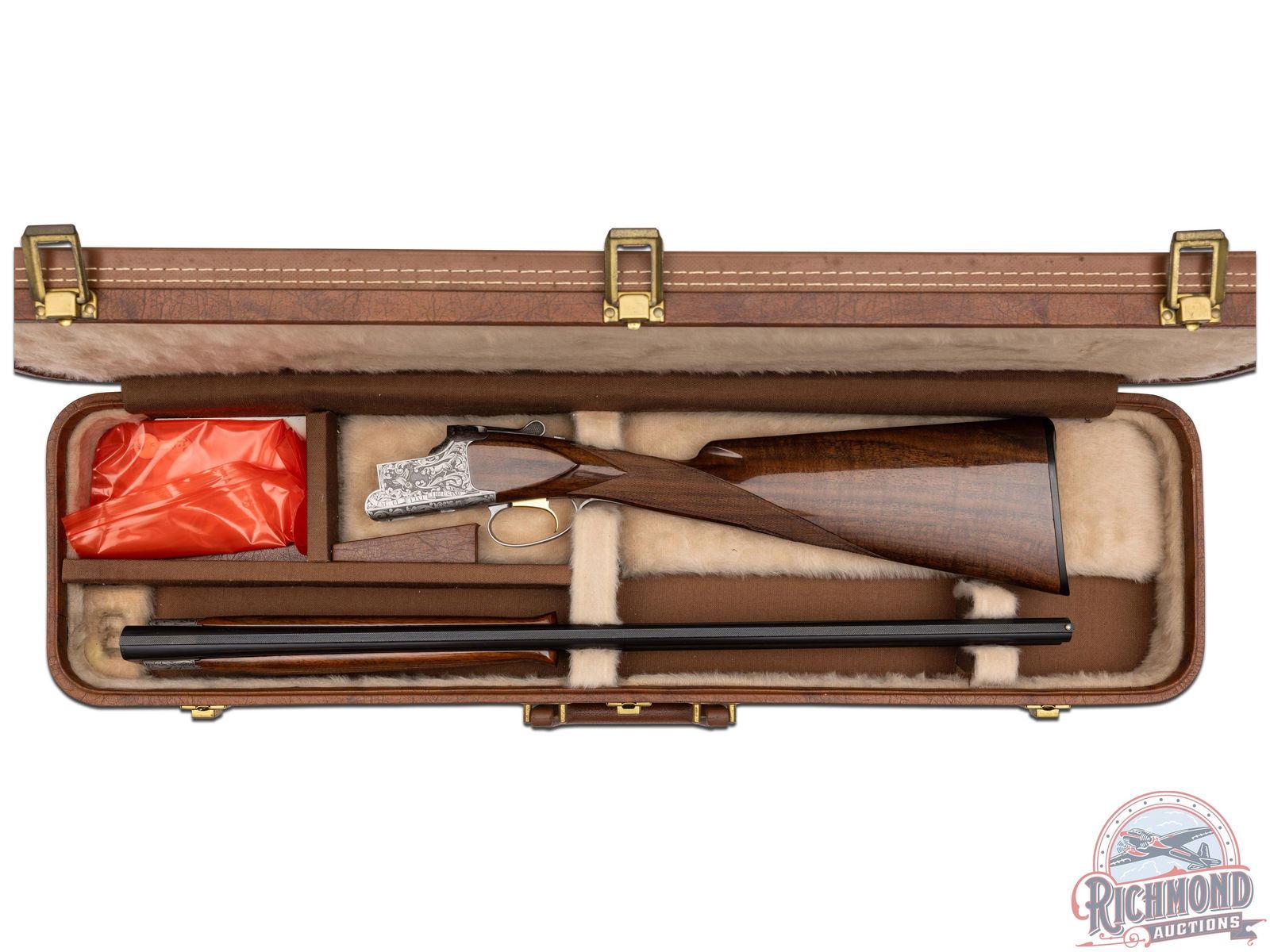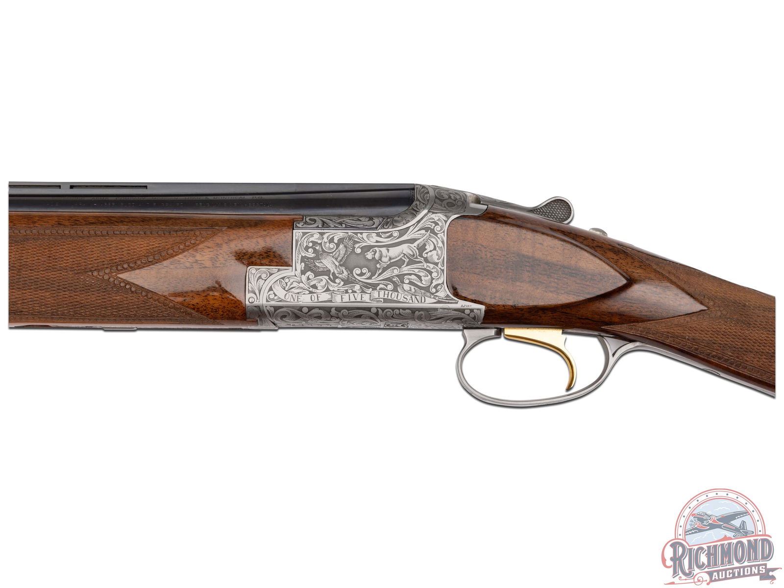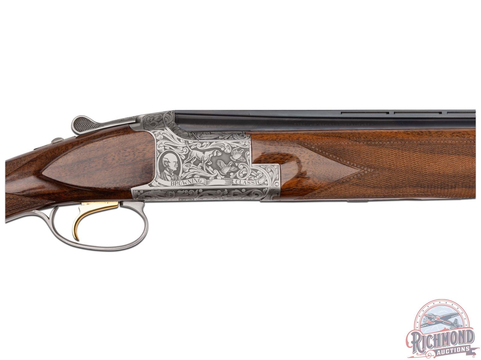 Assembled and fitted in Herstal, Belgium and engraved by Augusta Poes. These guns were only produced one year (1986) with approximately only 2500 actually being built. Fitted with 20 gauge blued 26" Special Steel barrels with ventilated rib, ejectors, bead front sight, 2-3/4" chambers and Modified and Improved cylinder chokes. Satin finish boxlock action with gold washed trigger, top tang safety, and special pattern engraving featuring setter flushing pheasant and "One of Five Thousand" banner on left with "A. Poes" signature. Right side features silhouette of John M. Browning and dog flushing quail with bottom having birds head and floral pattern and trigger guard having floral pattern with gold washed Browning Deer Head Logo. Walnut checkered English grip stock with checkering having a circular chain carved border pattern. Stock is fitted with latch release forearm. Comes in tan Browning luggage case. LOP: 14-1/4". DAC: 1-3/8". DAH: 2". CALIBER: 20 GA. S/N: P33BC0867. FFL STATUS: Modern.
