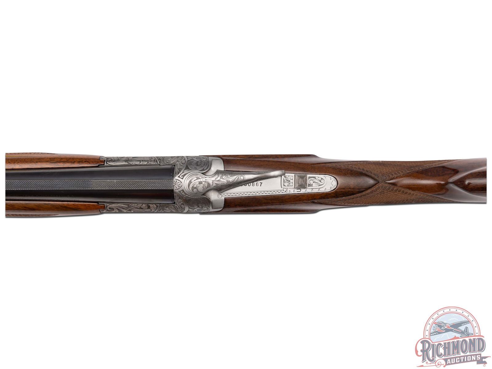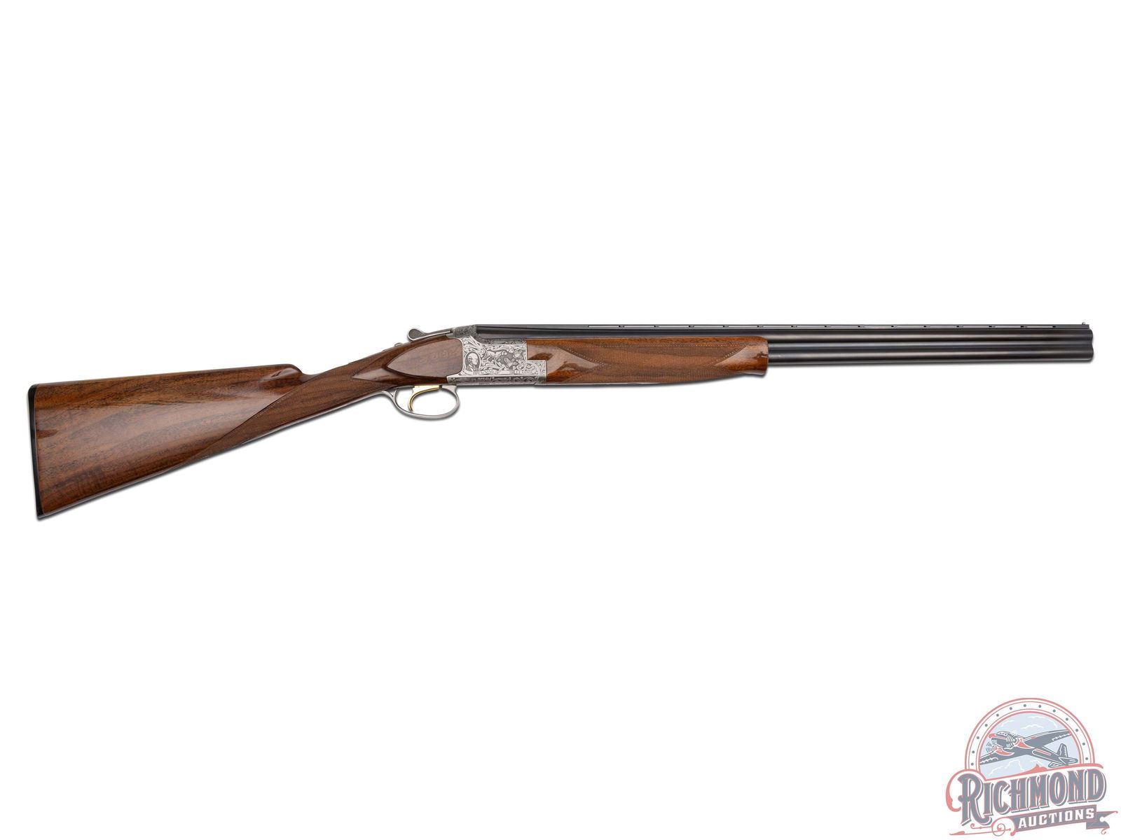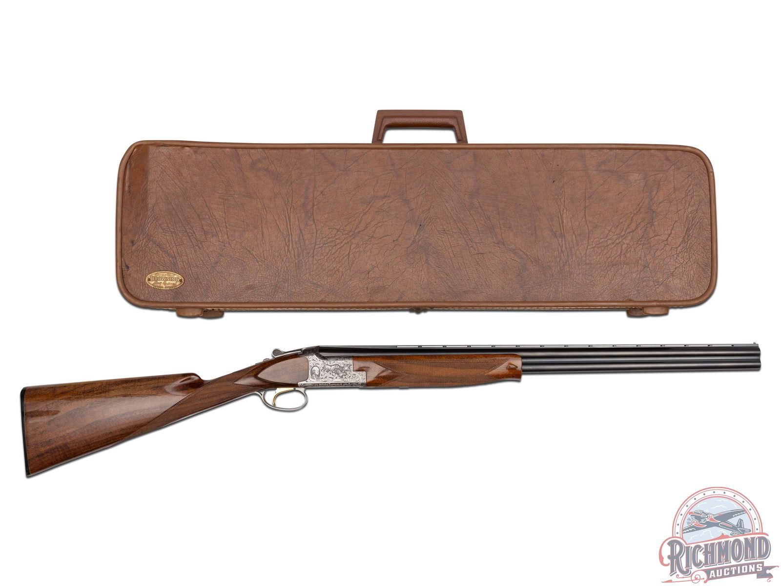 Assembled and fitted in Herstal, Belgium and engraved by Augusta Poes. These guns were only produced one year (1986) with approximately only 2500 actually being built. Fitted with 20 gauge blued 26" Special Steel barrels with ventilated rib, ejectors, bead front sight, 2-3/4" chambers and Modified and Improved cylinder chokes. Satin finish boxlock action with gold washed trigger, top tang safety, and special pattern engraving featuring setter flushing pheasant and "One of Five Thousand" banner on left with "A. Poes" signature. Right side features silhouette of John M. Browning and dog flushing quail with bottom having birds head and floral pattern and trigger guard having floral pattern with gold washed Browning Deer Head Logo. Walnut checkered English grip stock with checkering having a circular chain carved border pattern. Stock is fitted with latch release forearm. Comes in tan Browning luggage case. LOP: 14-1/4". DAC: 1-3/8". DAH: 2". CALIBER: 20 GA. S/N: P33BC0867. FFL STATUS: Modern.