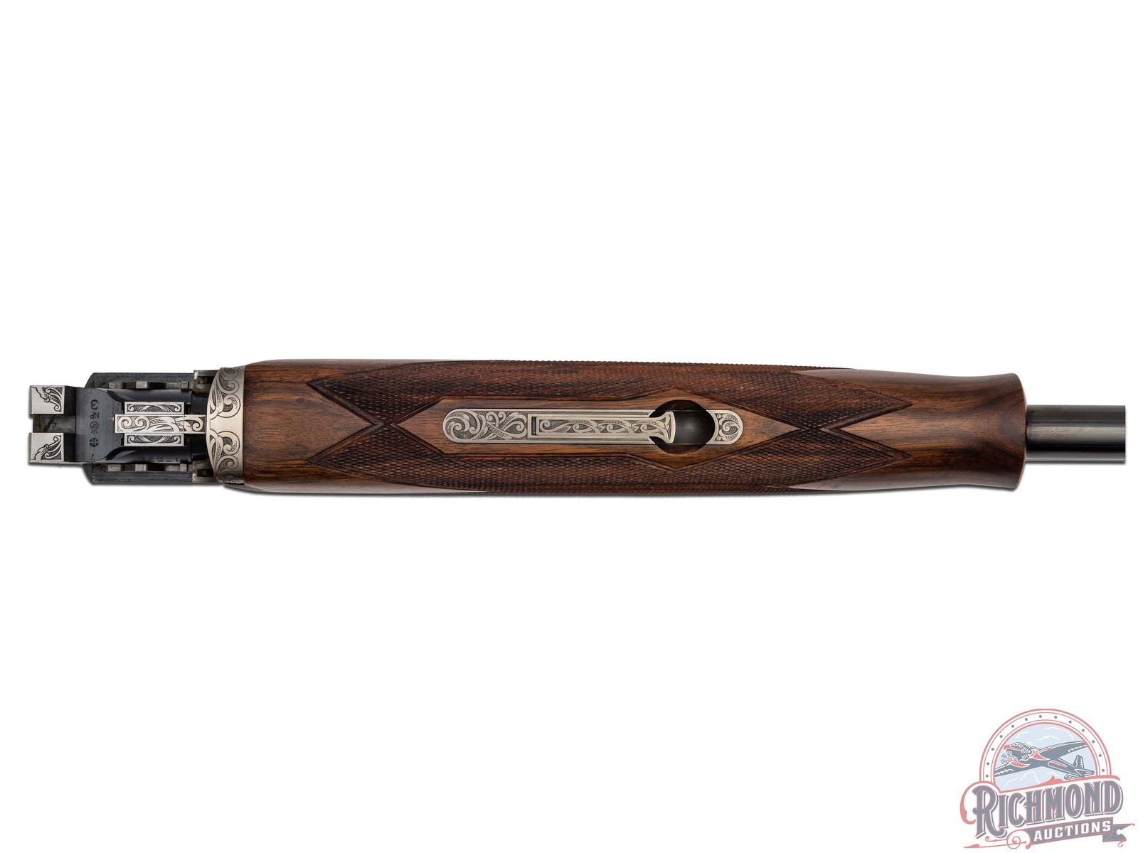 Manufactured in 2001. O/U with standard markings on the barrel. Matching serials on the frame, barrel and forearm. 26" barrels with full vent rib and white bead front sight. Coin finished frame with factory game scene engraving, with 95% coverage. Woodcocks in flight on the right side of the frame with a pointer dog and pheasants on the left. "Privilege" in script on the underside. Nicely oiled walnut stock and forearm with fine checkering on the wrist and forearm. Factory black rubber butt pad. Gold washed single trigger. Tang safety and selector, with ejectors on the barrel. 3" chambers. Invector choke tubes with full, improved cylinder, cylinder, skeet and modified tubes included. Includes serial matching box, manual, lock and choke tube wrench. LOP: 14-1/4". DAC: 1-1/4". DAH: 2-1/2". CALIBER: 20 GA. S/N: 17532MZ131. FFL STATUS: Modern.