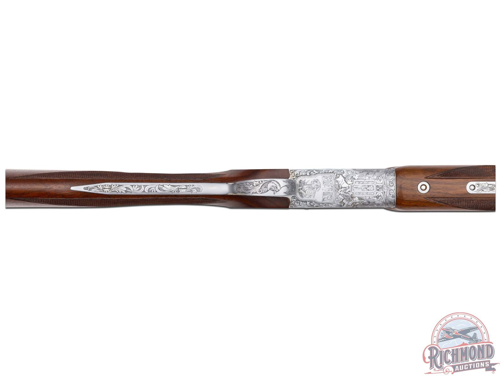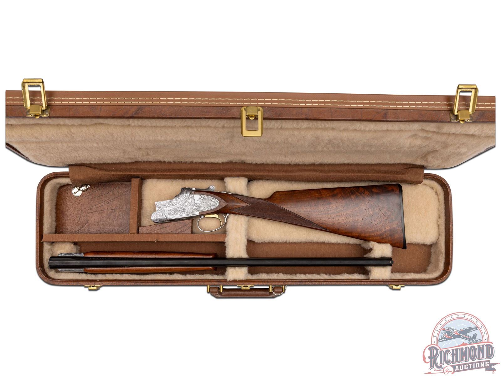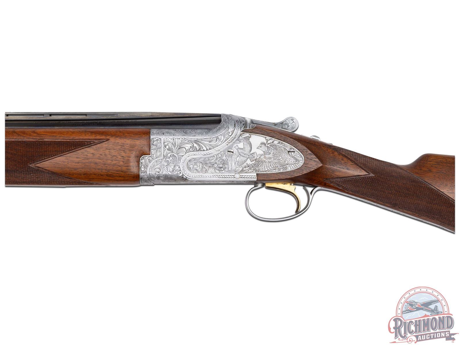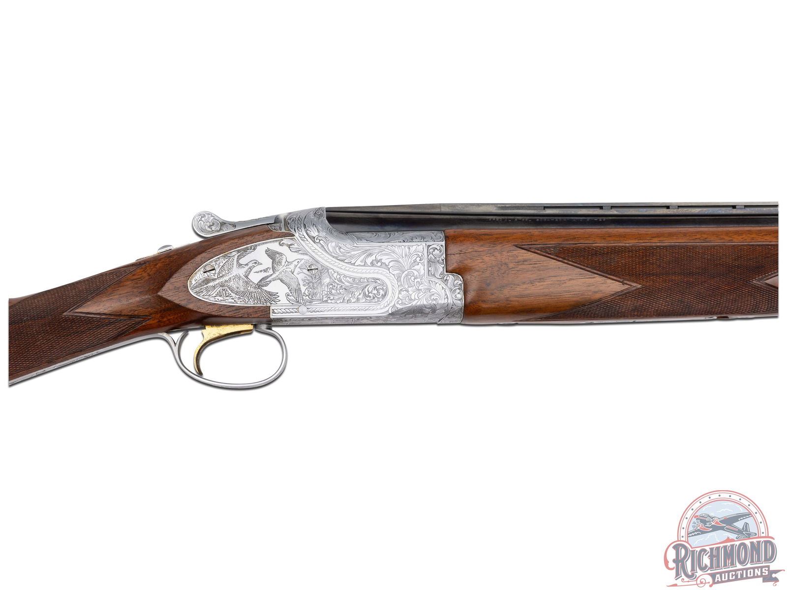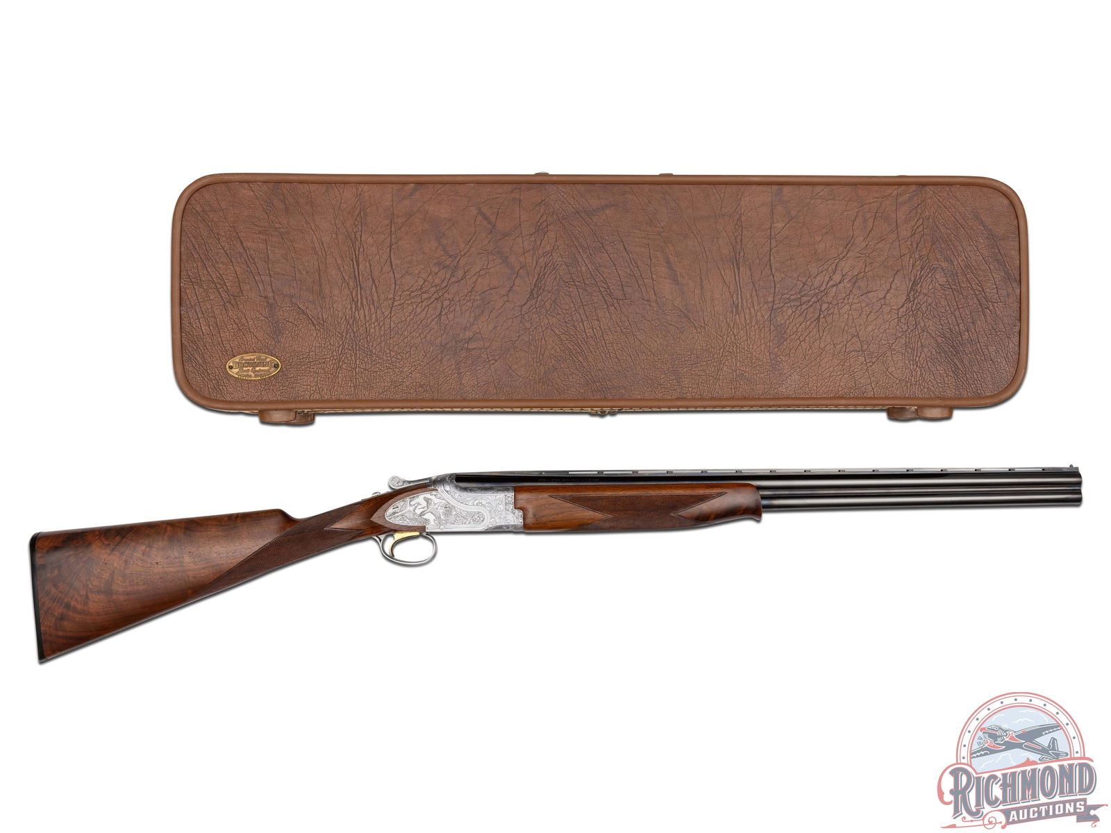 Manufactured in 1981. 26" blued Special Steel 20 gauge barrels with ventilated rib, bead front sight, ejectors, 3" chambers, and Full and Modified chokes with Browning Utah and Montreal addresses. Gray floral engraved boxlock action fitted with sideplates with full coverage bird and dog scene panels. Action fitted with gold washed single selective trigger, top tang safety, and barrel selector switch. Select walnut checkered English grip stock with "Browning" hard rubber butt plate. Matching attached scaled down walnut checkered Schnabel forearm. Comes in Browning luggage trunk case. LOP: 14-1/4". DAC: 1-1/2". DAH: 2". CALIBER: 20 GA. S/N: 20648PZ163. FFL STATUS: Modern.