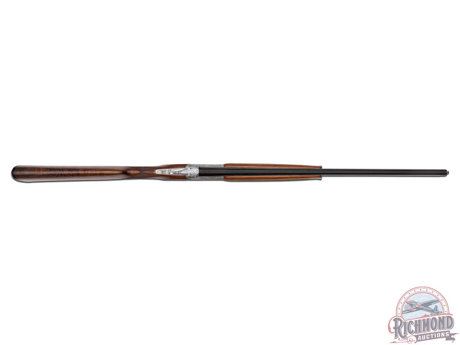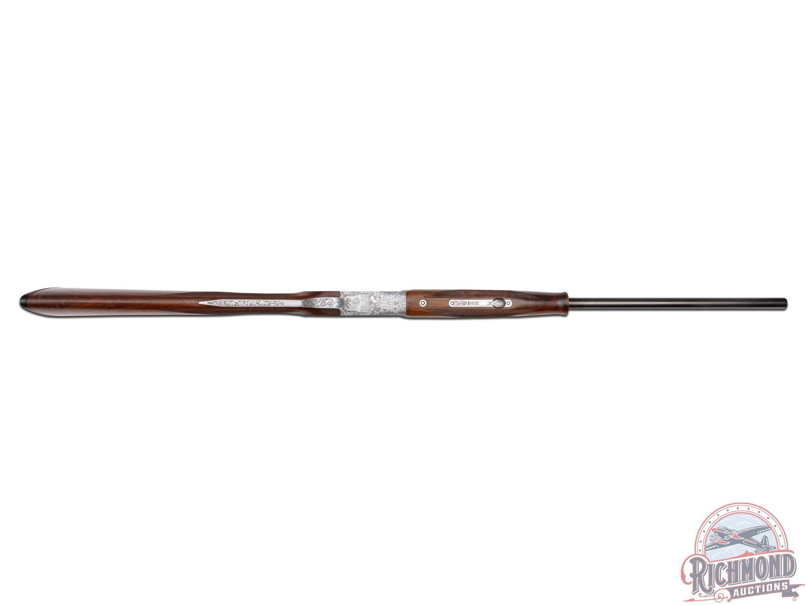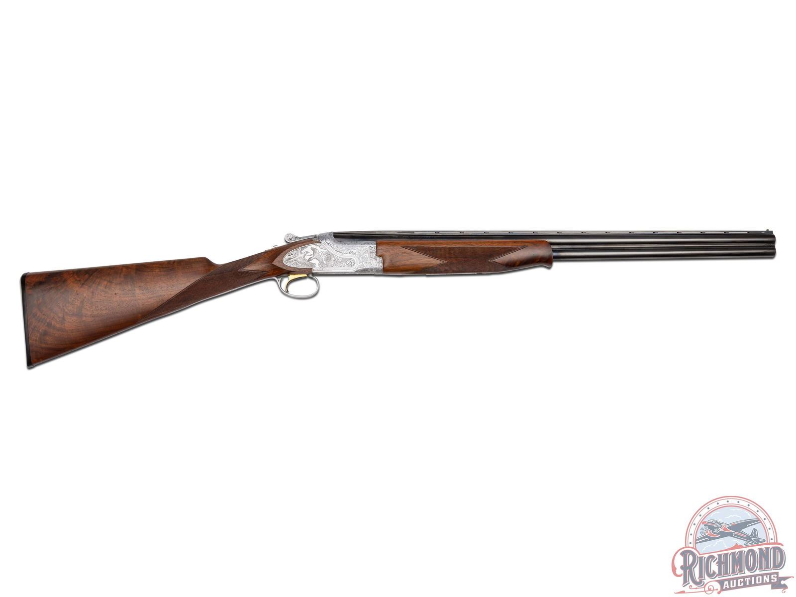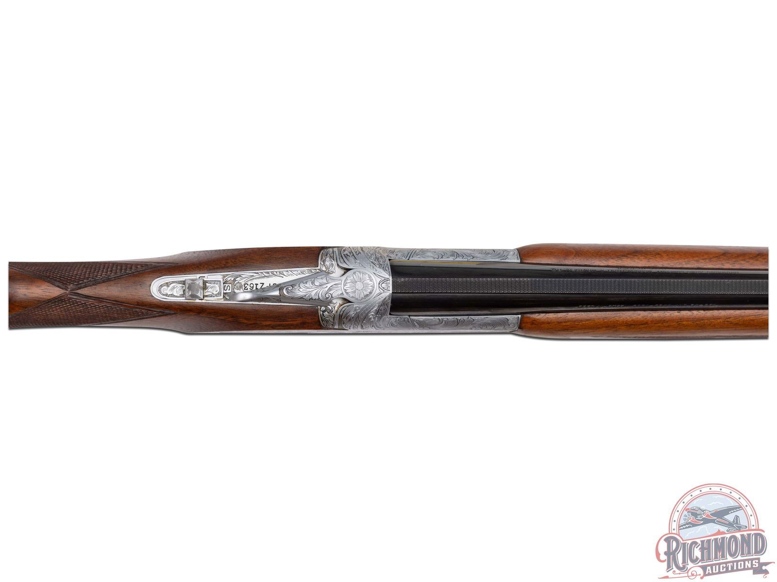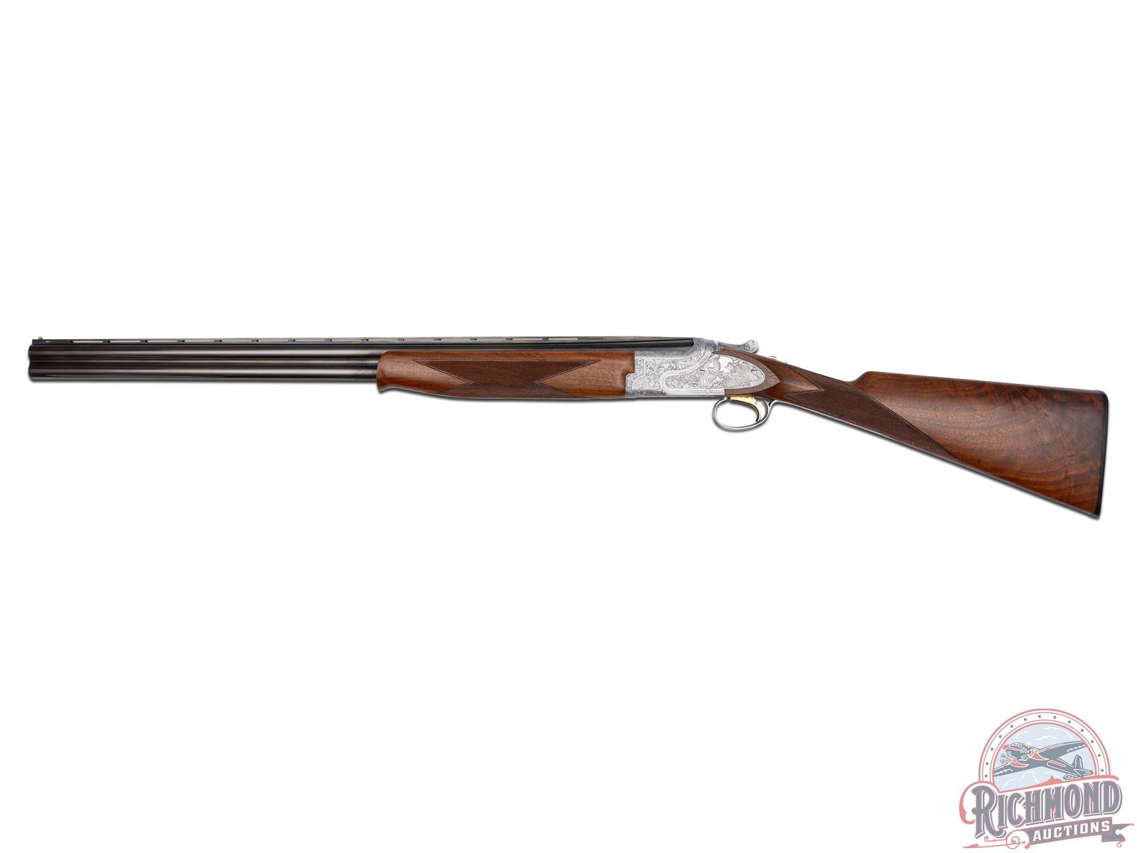 Manufactured in 1981. 26" blued Special Steel 20 gauge barrels with ventilated rib, bead front sight, ejectors, 3" chambers, and Full and Modified chokes with Browning Utah and Montreal addresses. Gray floral engraved boxlock action fitted with sideplates with full coverage bird and dog scene panels. Action fitted with gold washed single selective trigger, top tang safety, and barrel selector switch. Select walnut checkered English grip stock with "Browning" hard rubber butt plate. Matching attached scaled down walnut checkered Schnabel forearm. Comes in Browning luggage trunk case. LOP: 14-1/4". DAC: 1-1/2". DAH: 2". CALIBER: 20 GA. S/N: 20648PZ163. FFL STATUS: Modern.