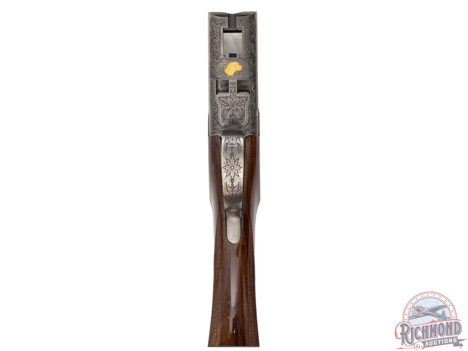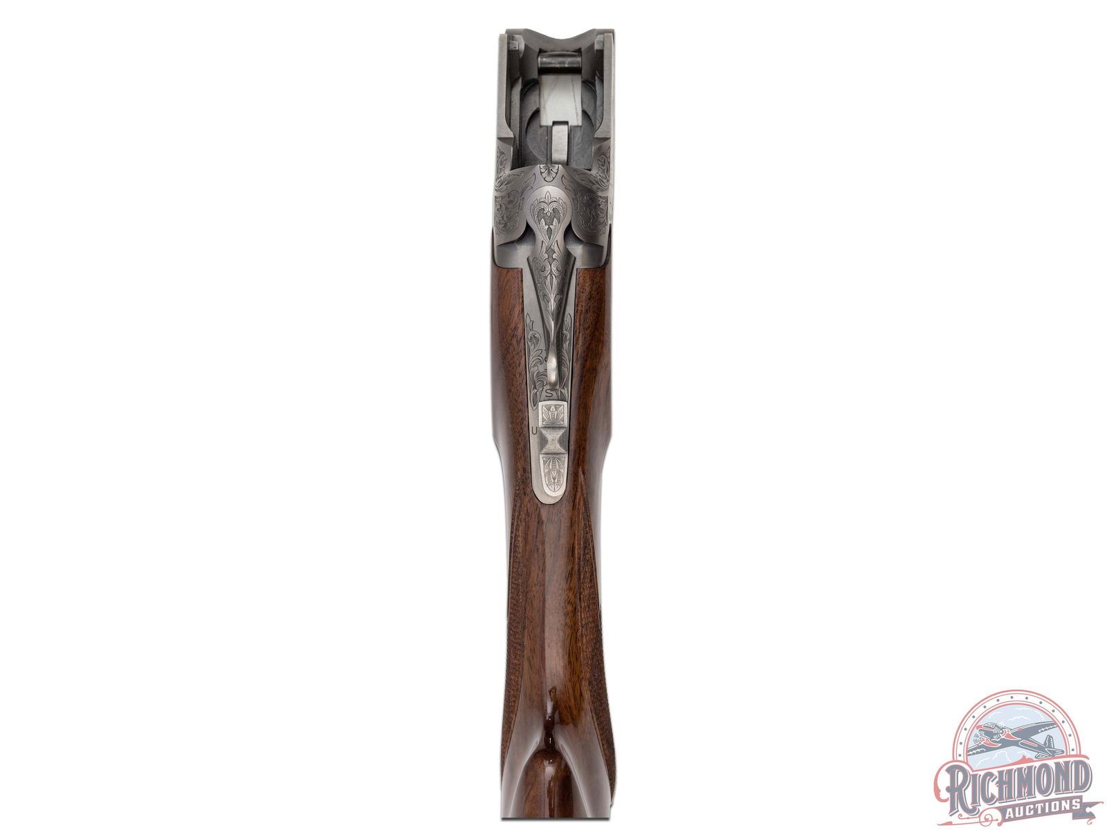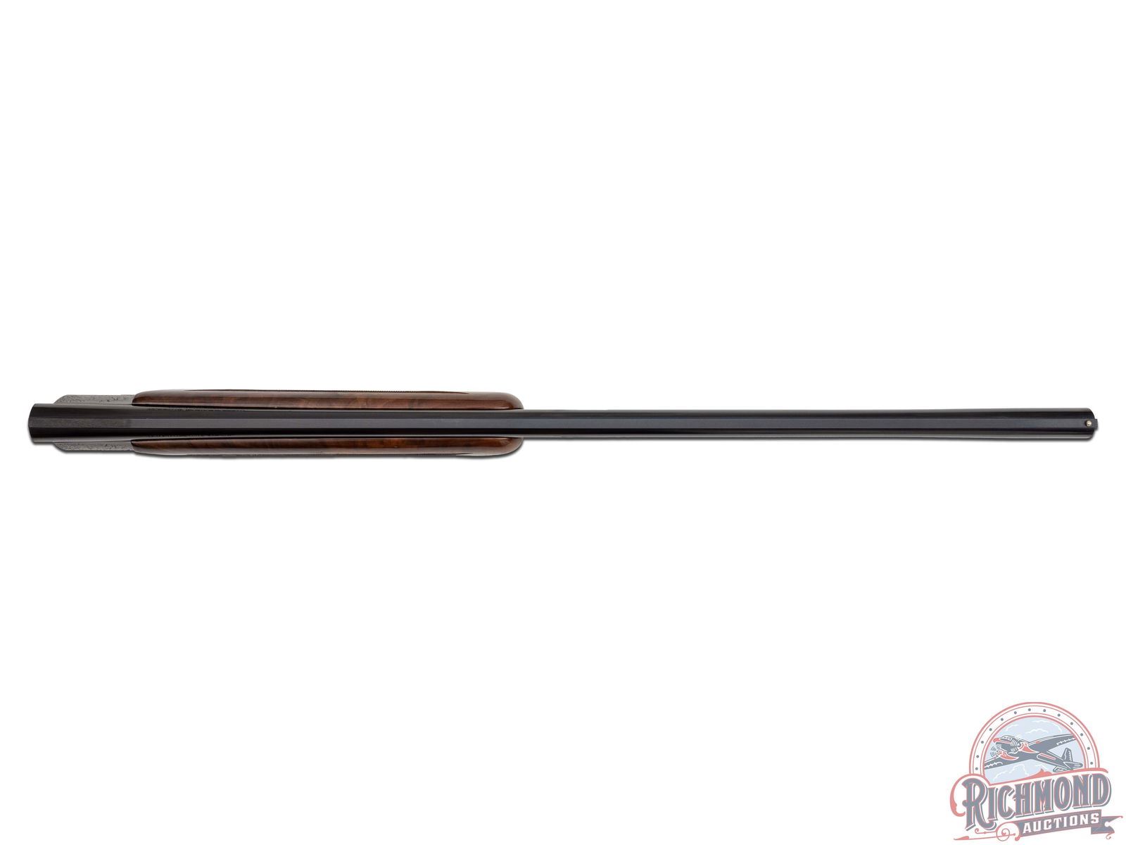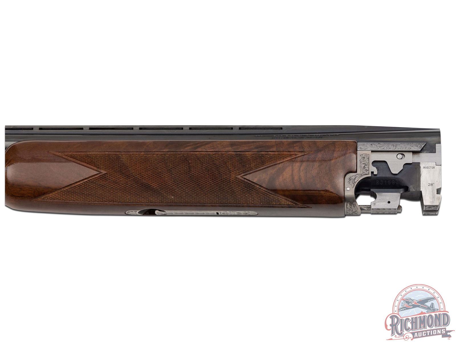 Manufactured in 2012. O/U with standard markings on the barrel. Matching serials on the frame, barrel and forearm. 28" barrels with full vent rib and steel bead front sight. Grade 7 engraved receiver with gold inlay grouse on either side. Pointer dog inlaid in gold on the underside. Factory gloss finished walnut stock and forearm. Fine checkered pistol grip wrist and forearm. Original black plastic butt plate. Single gold washed trigger with a tang safety/selector. 2-3/4" chamber. Invector choke tubes (full and modified tubes installed) with improved cylinder included (only chokes included). Weight: 7lbs. Wall thickness at 9 inches from breech .0505/.0505". Bore diameter is 9" from the breech. .659/.659". Includes lock, manual, choke tube wrench and serial matching box. LOP: 14-1/4". DAC: 1-1/4". DAH: 2-1/4". CALIBER: 16 GA. S/N: 23159ZY131. FFL STATUS: Modern.