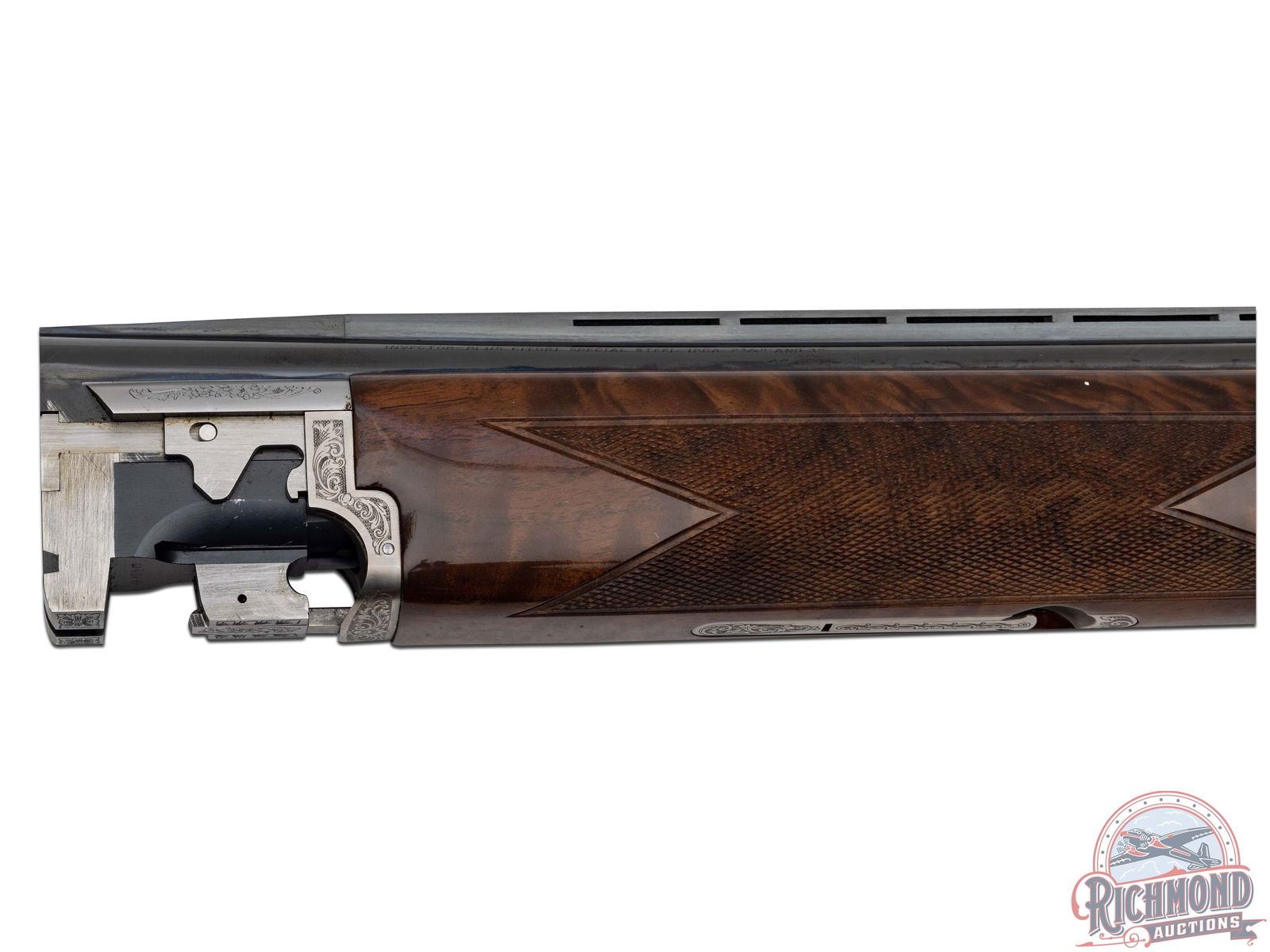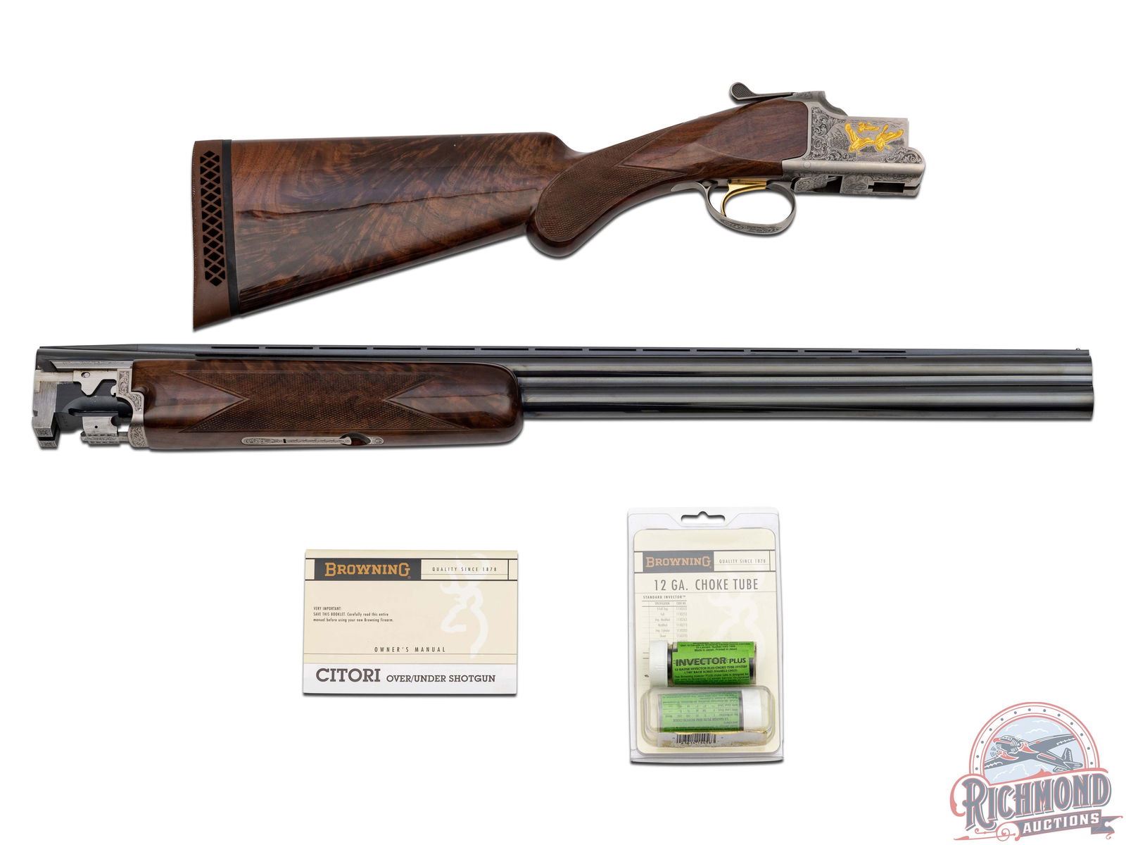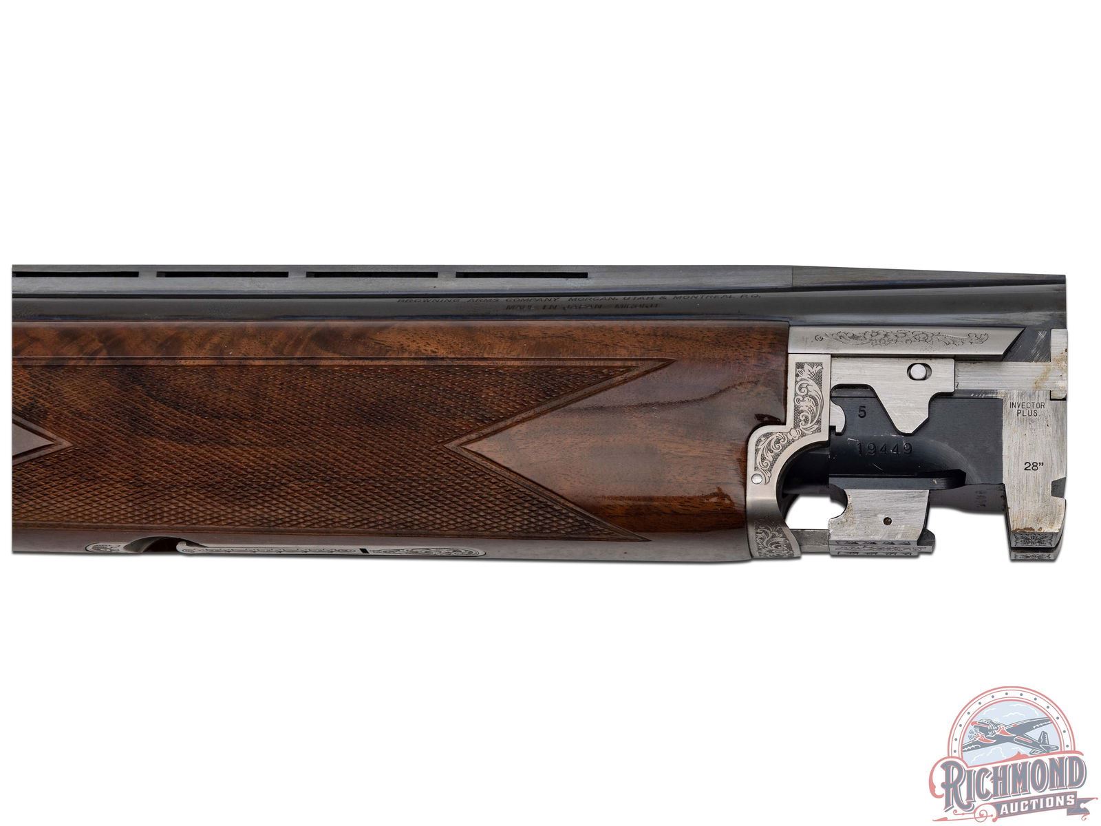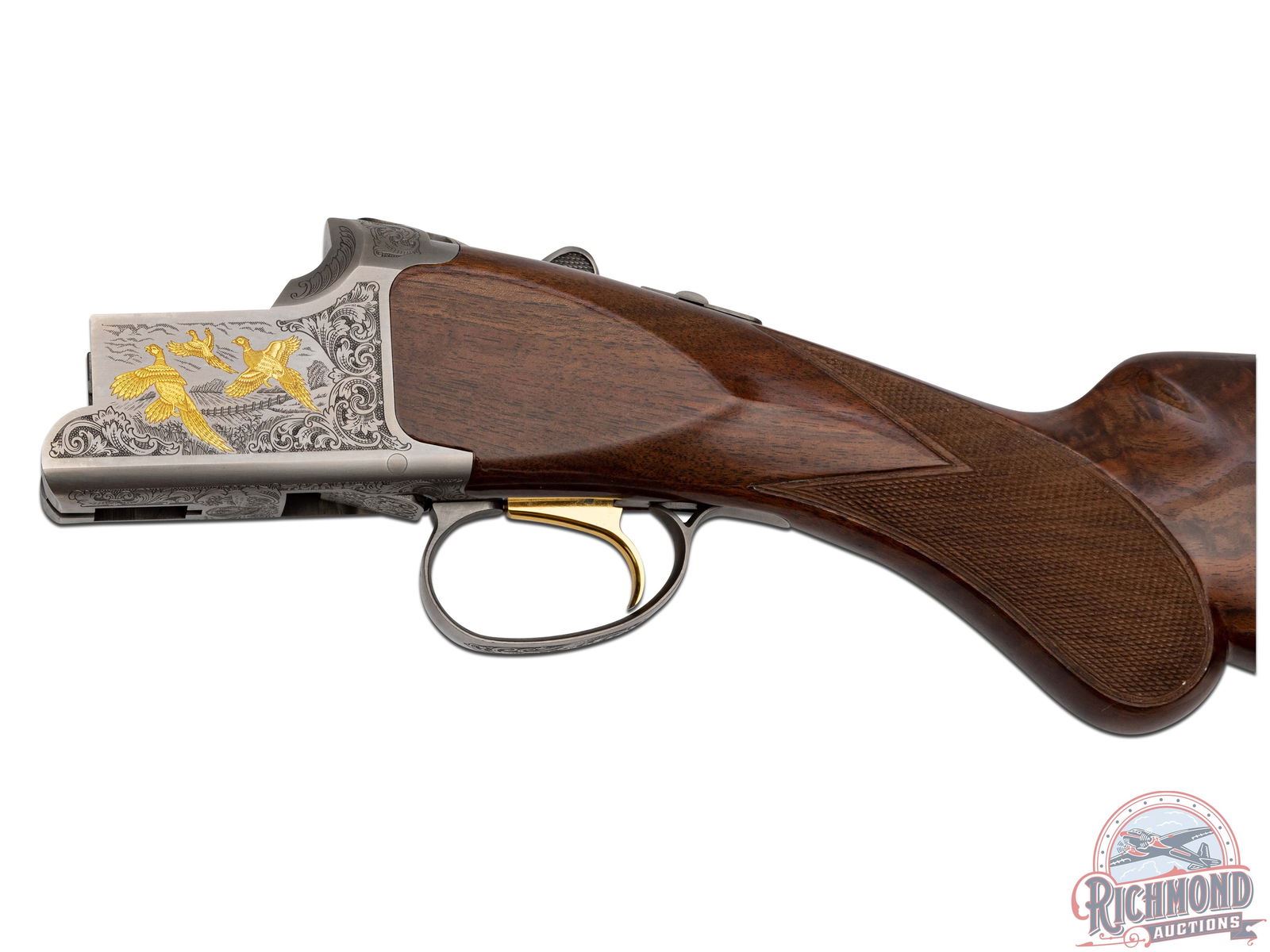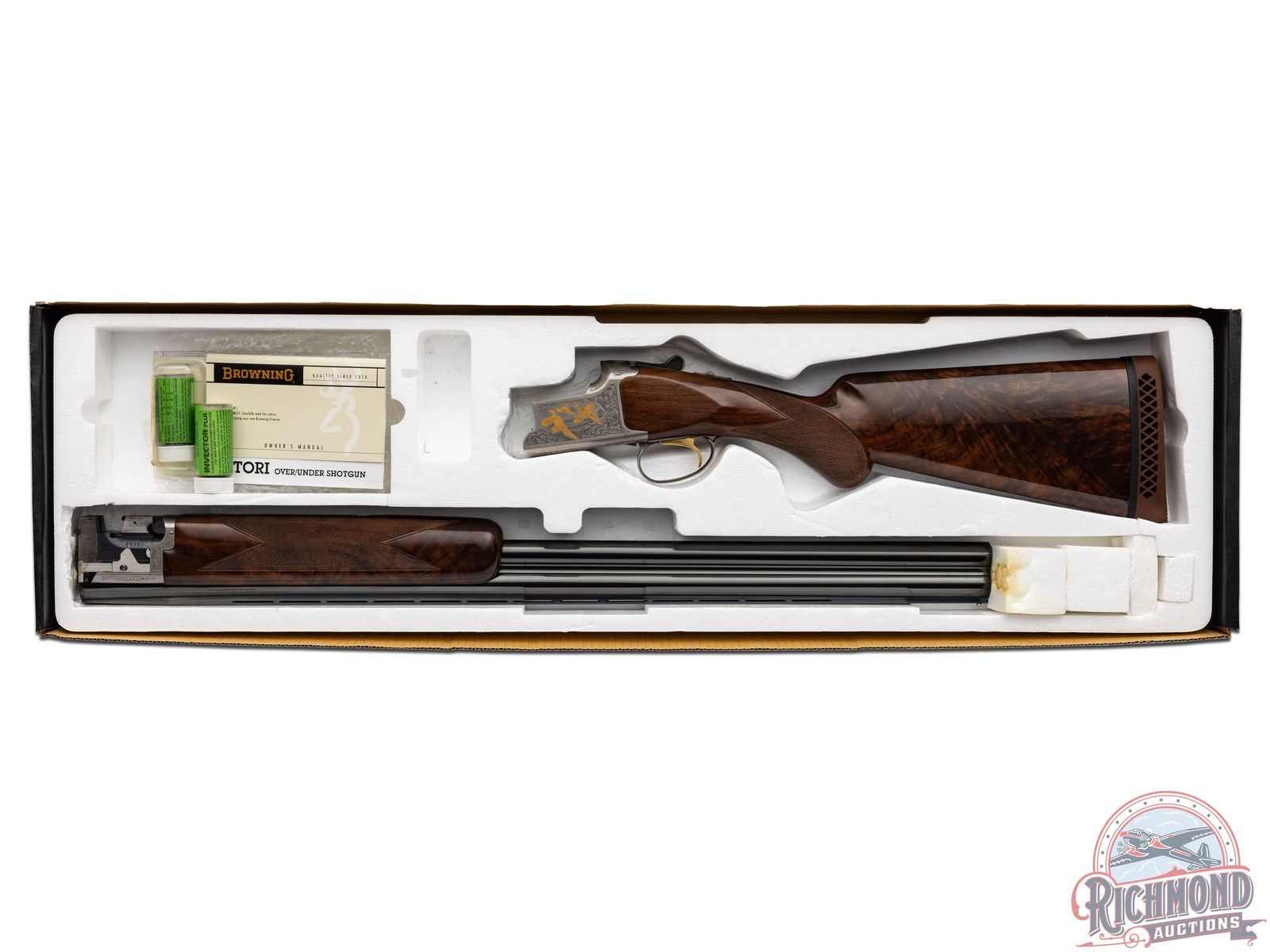 Manufactured in 2000. Standard markings on the barrel. Matching serials on the frame, barrel and forearm. 28" O/U barrels with full vent rib and steel bead front sight. Coin finished frame with factory Grade VI game scene engraving. Gold inlay pheasants on the left side of the frame and woodcocks on the right. Portrait of a pointer dog on the bottom of the frame. Fine walnut furniture with fine cut checkering on the forearm and pistol grip wrist. Added brown rubber "BROWNING" marked butt pad. Single gold washed trigger and tang safety/barrel selector. 3" chambers. Invector choke tubes, with full, modified, improved modified and improved cylinder choke tubes included. Includes serial number matching box and manual. LOP: 14-1/4". DAC: 1-1/2". DAH: 2-1/2". CALIBER: 12 GA. S/N: 19449MM131. FFL STATUS: Modern.