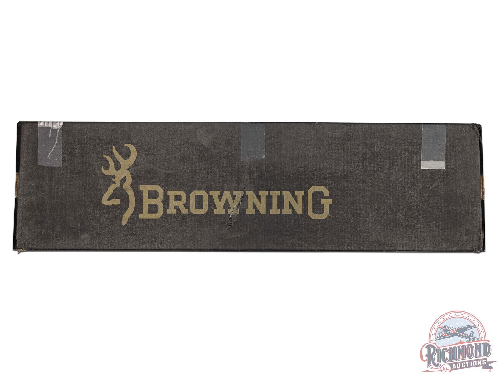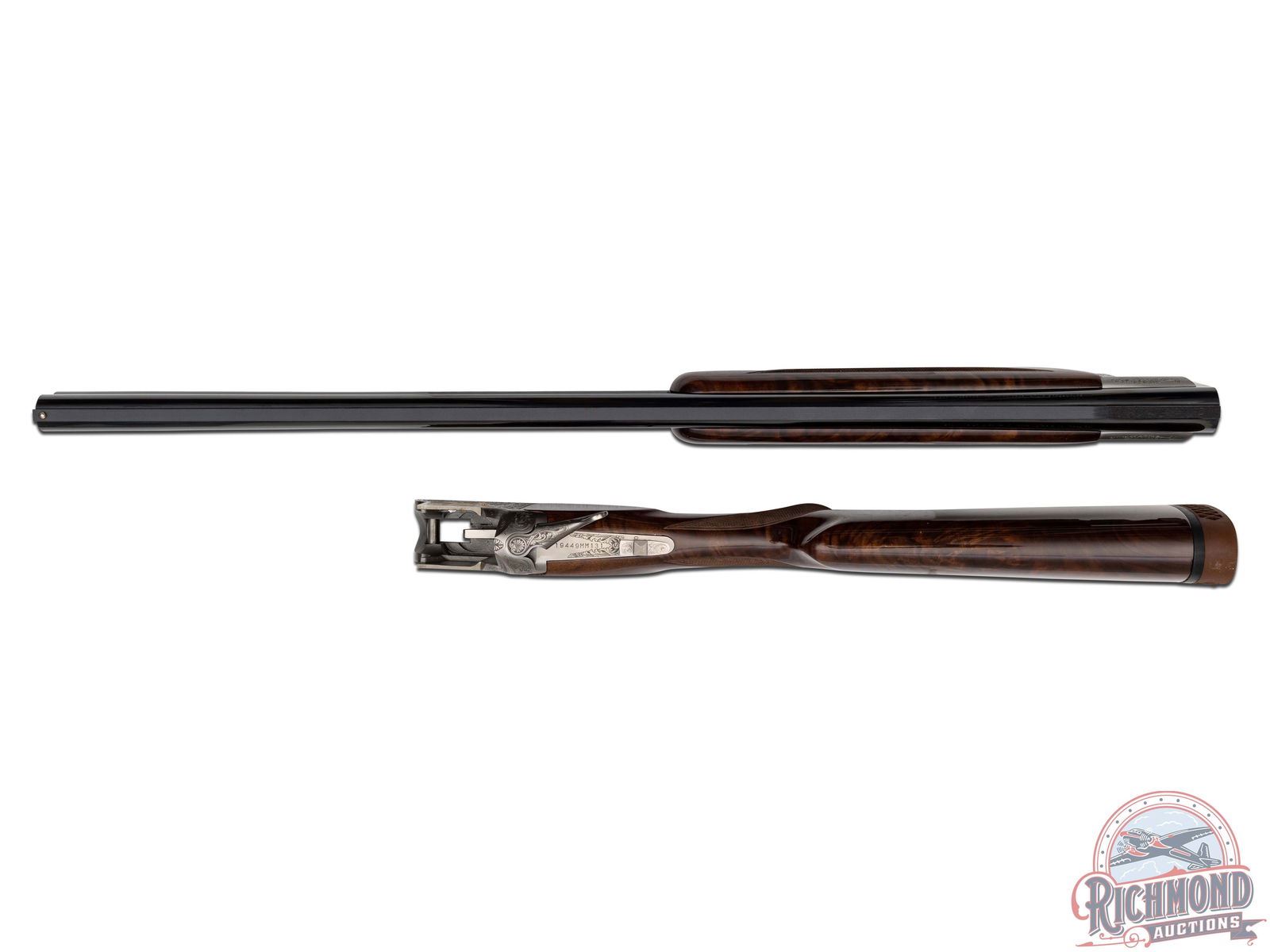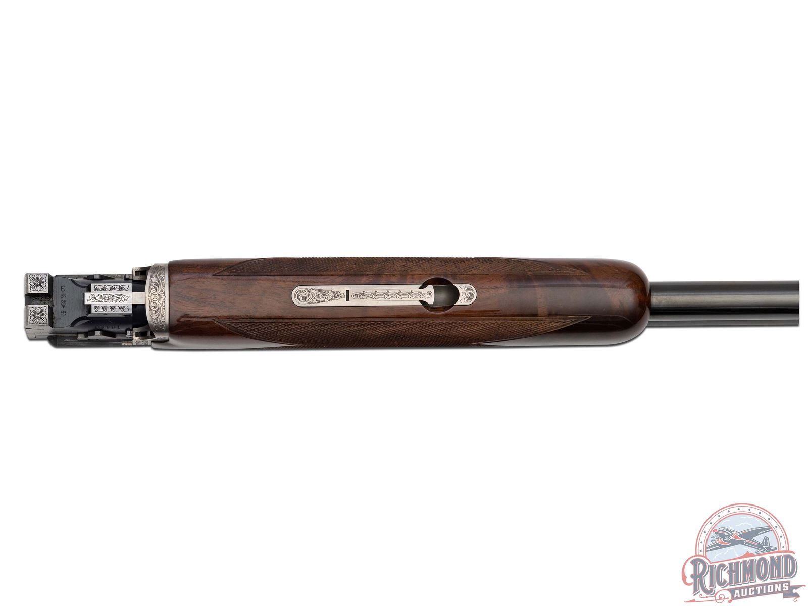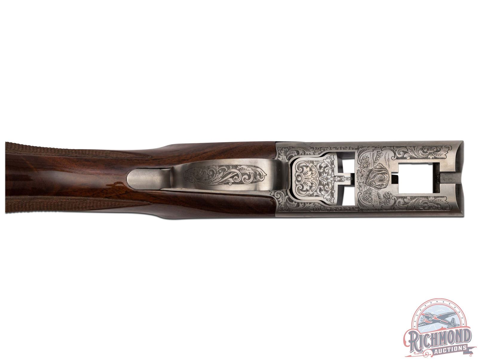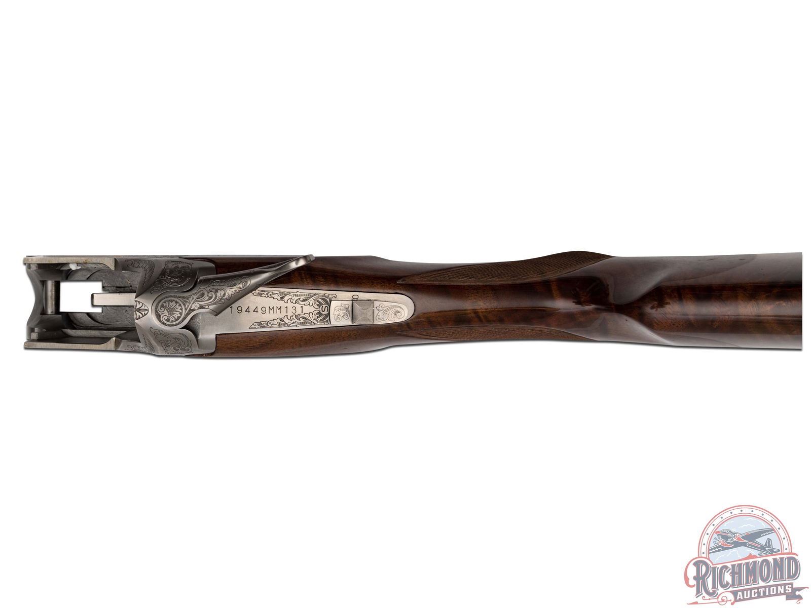 Manufactured in 2000. Standard markings on the barrel. Matching serials on the frame, barrel and forearm. 28" O/U barrels with full vent rib and steel bead front sight. Coin finished frame with factory Grade VI game scene engraving. Gold inlay pheasants on the left side of the frame and woodcocks on the right. Portrait of a pointer dog on the bottom of the frame. Fine walnut furniture with fine cut checkering on the forearm and pistol grip wrist. Added brown rubber "BROWNING" marked butt pad. Single gold washed trigger and tang safety/barrel selector. 3" chambers. Invector choke tubes, with full, modified, improved modified and improved cylinder choke tubes included. Includes serial number matching box and manual. LOP: 14-1/4". DAC: 1-1/2". DAH: 2-1/2". CALIBER: 12 GA. S/N: 19449MM131. FFL STATUS: Modern.
