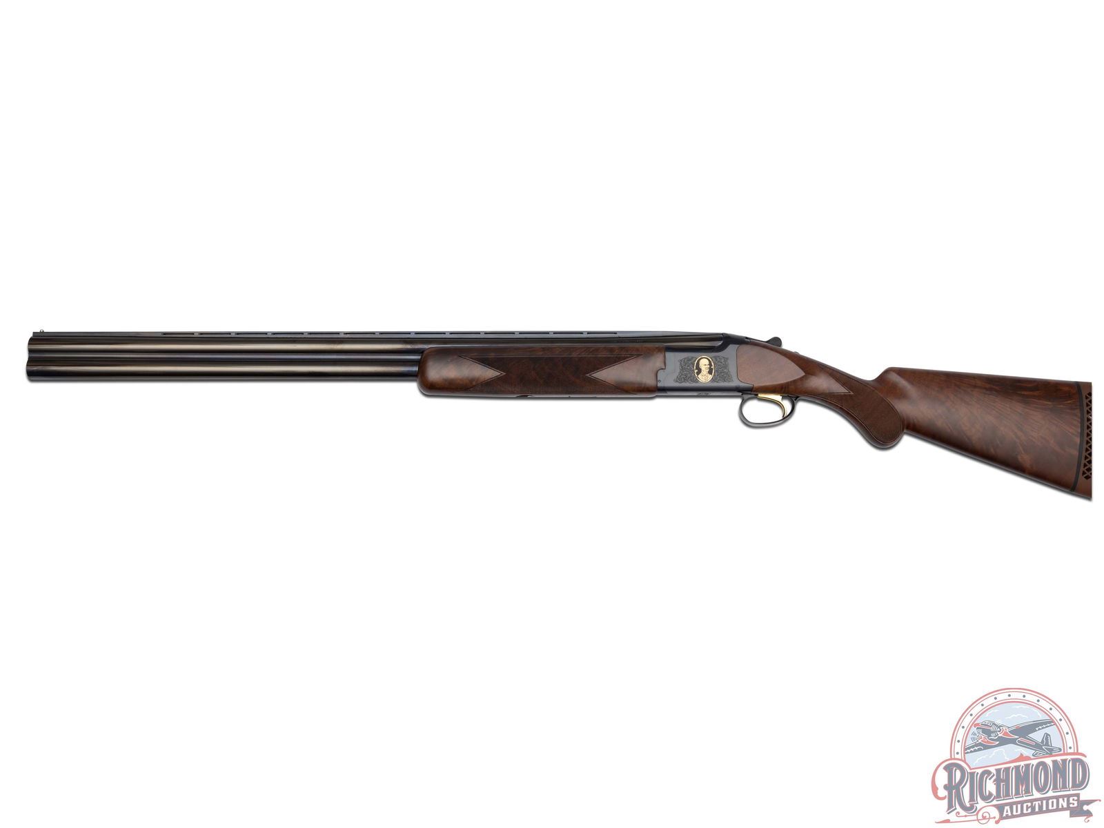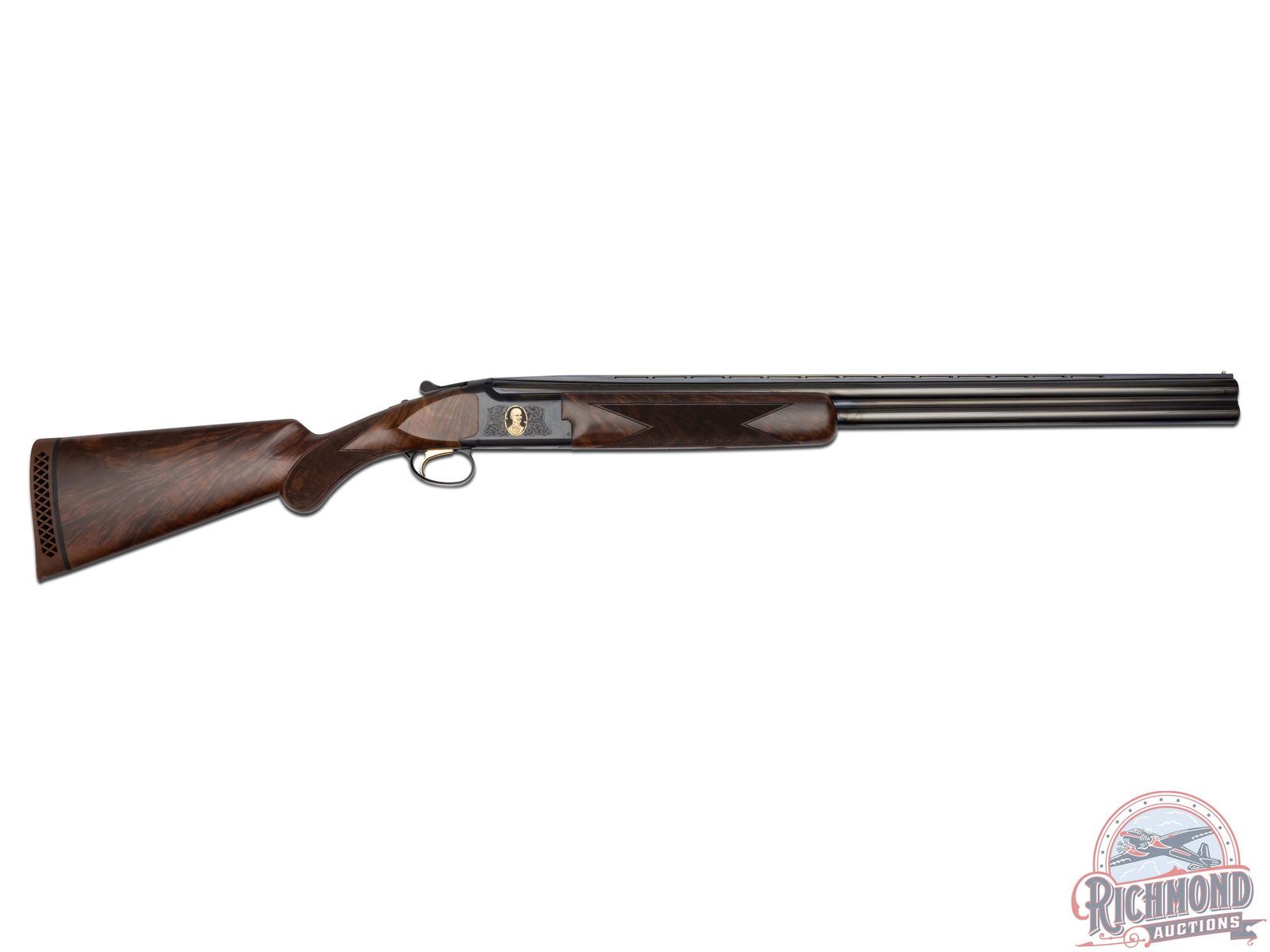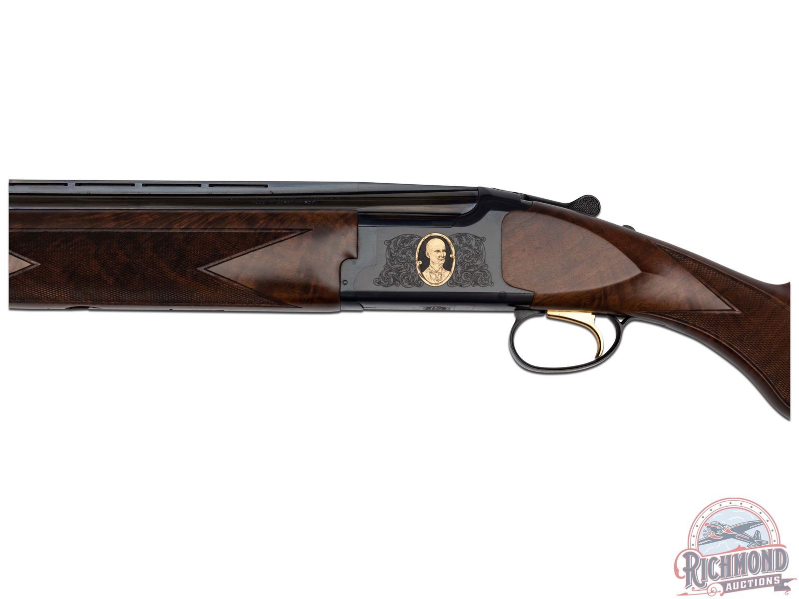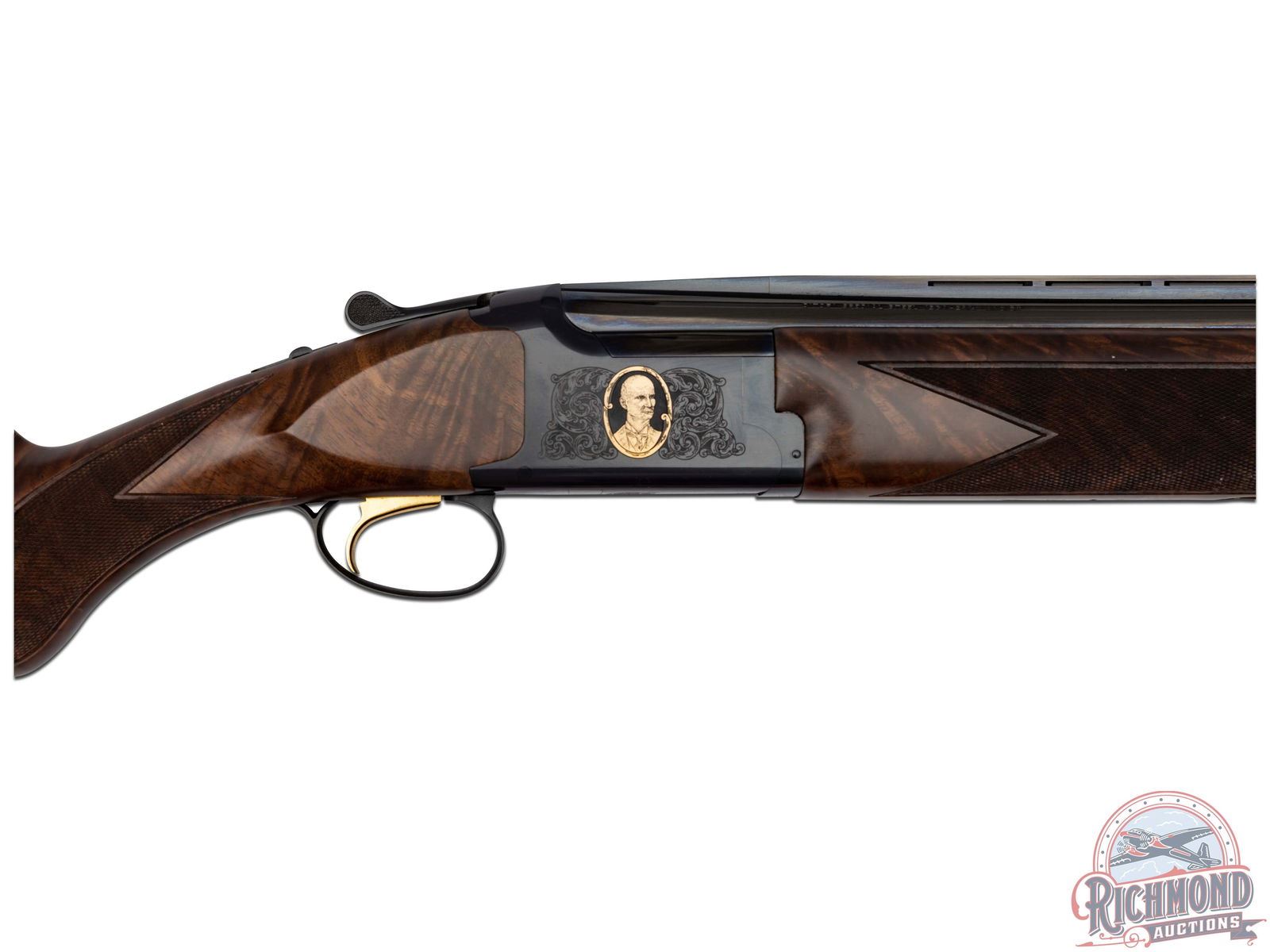 Manufactured in 2005. Blued 28" O/U steel barrels with ventilated rib and bead front sight, Invector chokes, 3" chamber and ejectors. Blued steel boxlock action with floral engraving surrounding gold wash portrait of John M. Browning on both sides of the receiver. Bottom of receiver features "150th Anniversary" and John M. Browning signature in gold wash. gold-plated single trigger and tang safety selector. Walnut feather crotch checkered round knob pistol grip with factory Browning vented pad. Matching checkered sporting type forearm. Includes the original Browning box with paperwork. LOP: 14-1/4". DAC: 1-1/2". DAH: 2-1/2". CALIBER: 12 GA. S/N: 19362MV131. FFL STATUS: Modern.
