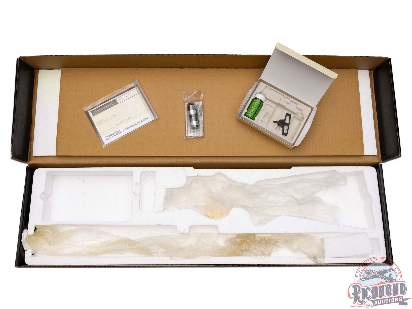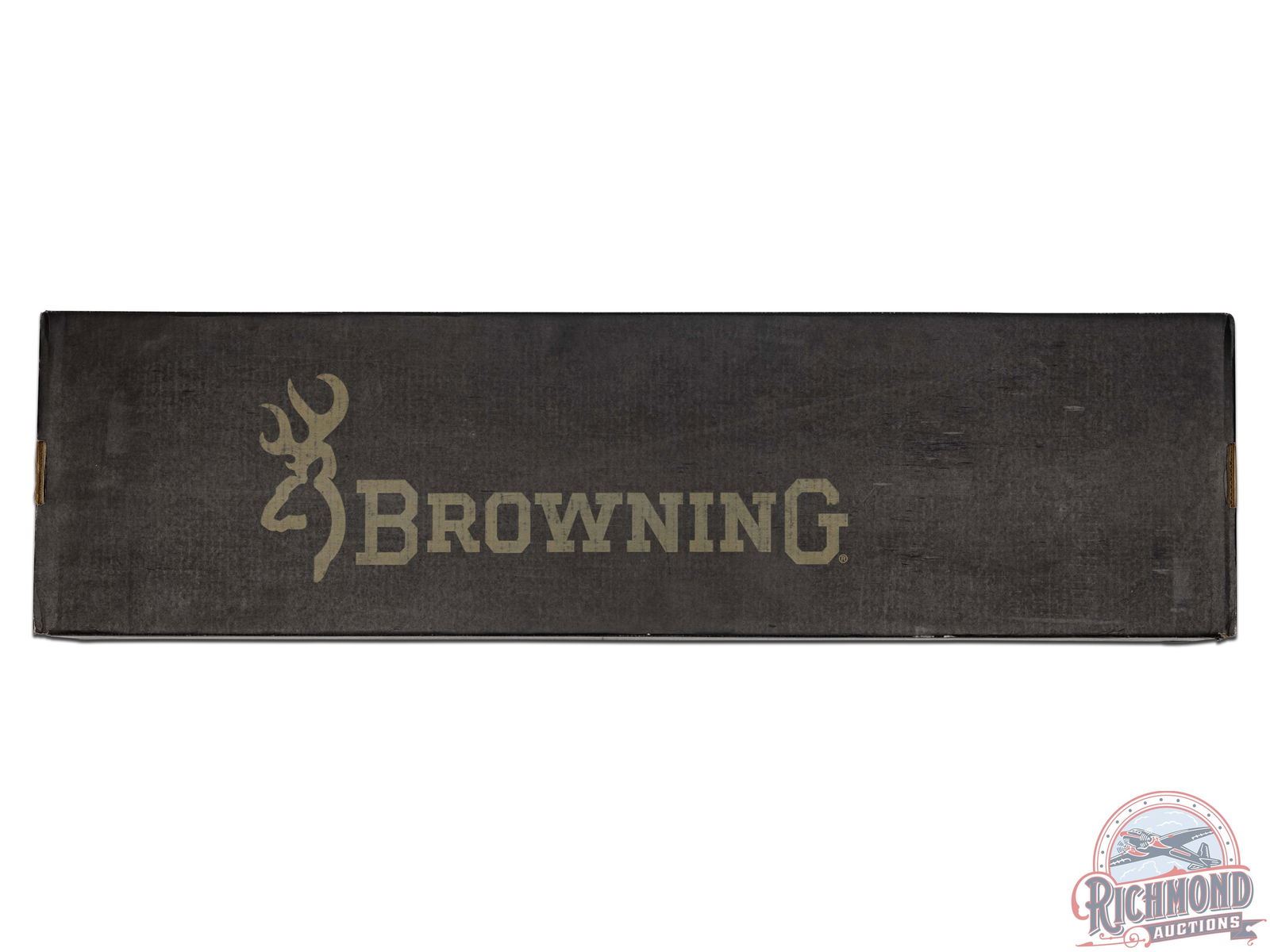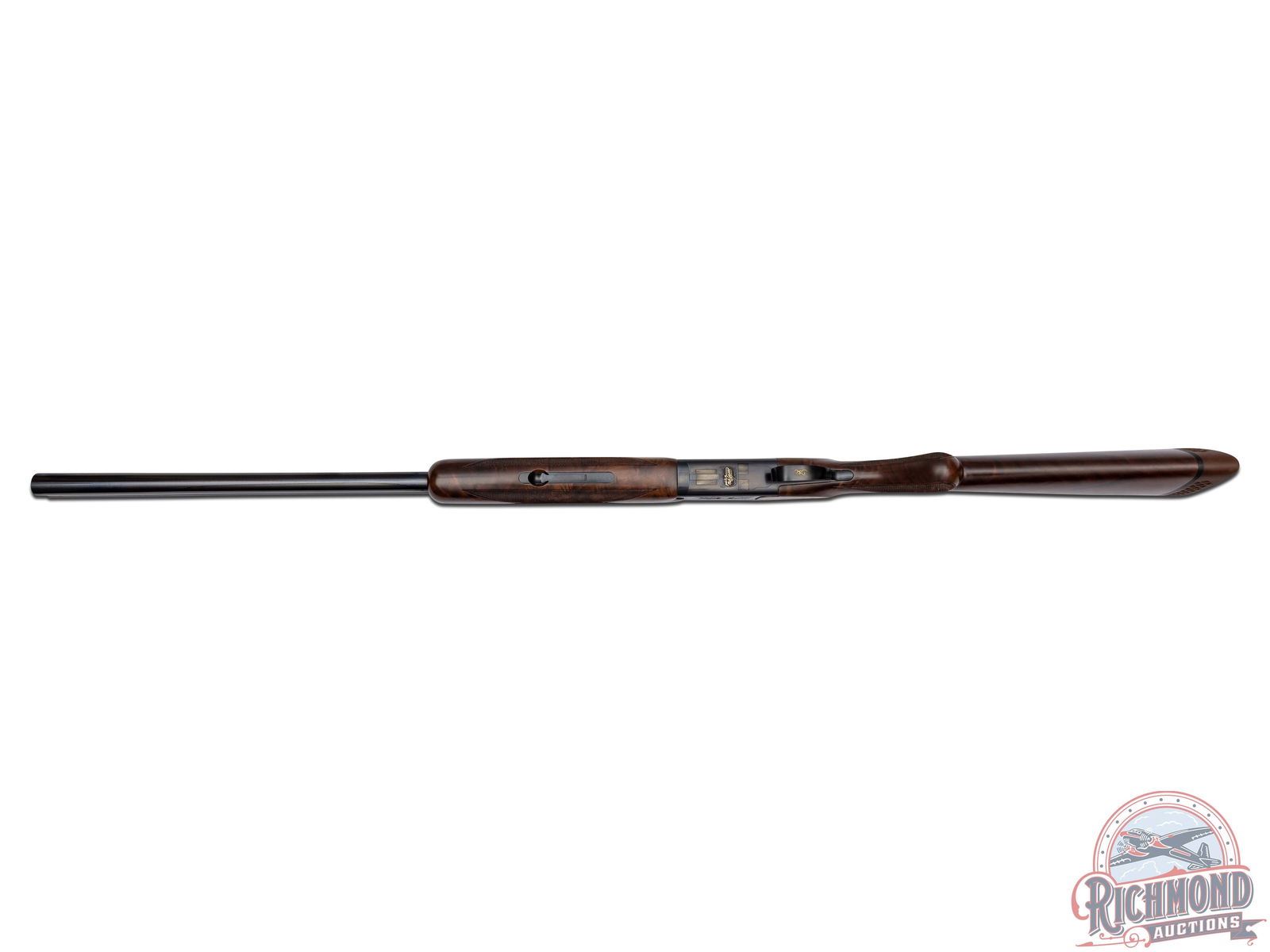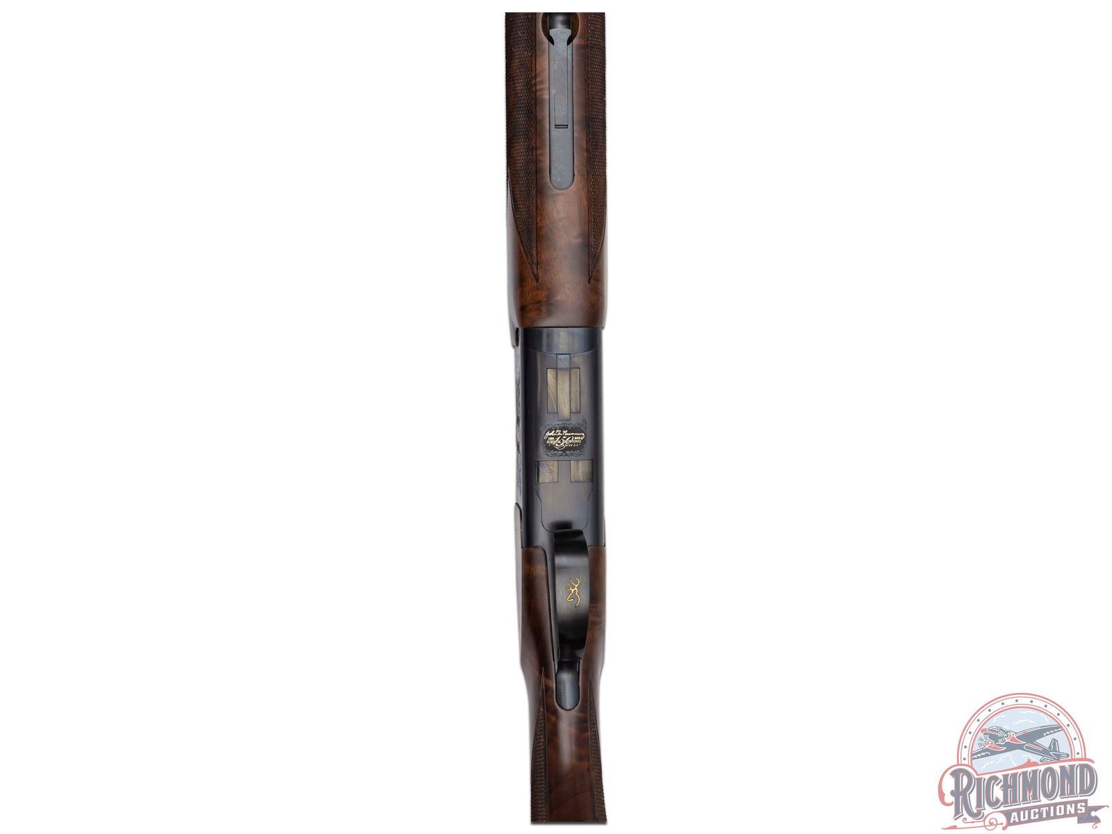 Manufactured in 2005. Blued 28" O/U steel barrels with ventilated rib and bead front sight, Invector chokes, 3" chamber and ejectors. Blued steel boxlock action with floral engraving surrounding gold wash portrait of John M. Browning on both sides of the receiver. Bottom of receiver features "150th Anniversary" and John M. Browning signature in gold wash. gold-plated single trigger and tang safety selector. Walnut feather crotch checkered round knob pistol grip with factory Browning vented pad. Matching checkered sporting type forearm. Includes the original Browning box with paperwork. LOP: 14-1/4". DAC: 1-1/2". DAH: 2-1/2". CALIBER: 12 GA. S/N: 19362MV131. FFL STATUS: Modern.