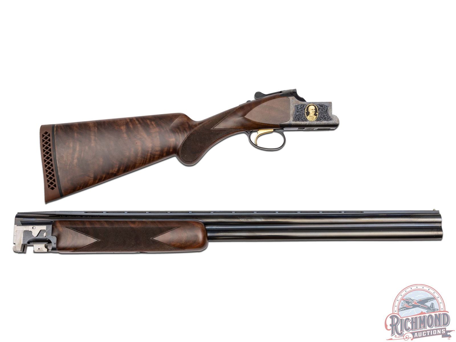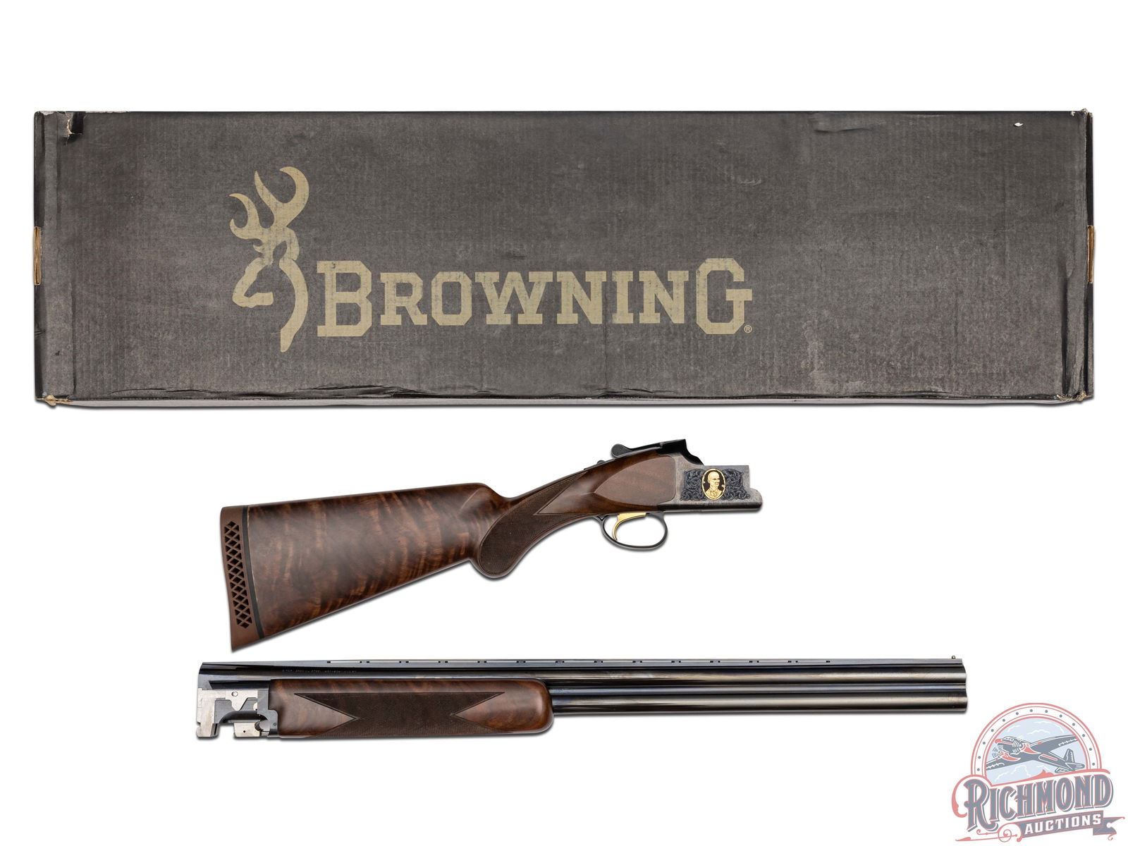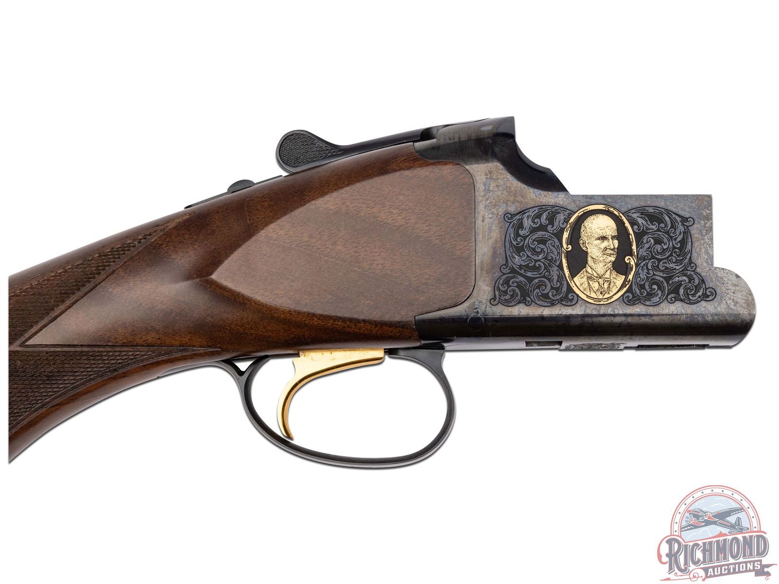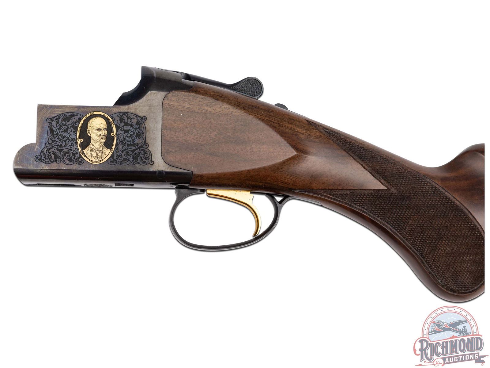 Manufactured in 2004 to commemorate the 150th year of Browning Arms. Features 28" blued barrels with ventilated rib, chambered for 2-3/4" and 3" shells with Invector Plus choke system and nickel bead front sight. Polished blued action with an oval gold portrait of John Browning on both sides surrounded with scroll floral engraving. Bottom of the receiver shows a facsimile signature of John M. Browning in gold with the years "1885 and 2005" superimposed above a gold "150 Years". Crossbolt safety and gold washed trigger with Browning Buck logo stamped on the bottom of the guard in gold. High grade walnut round knob, long tang stock with checkered pistol grip and matching forearm with checkering, all in a satin oil finish. Fitted with a factory brown ventilated recoil pad. Comes in the original Browning box with paperwork, choke wrench and lock. LOP: 14-1/8". DAC: 1-1/2". DAH: 2". CALIBER: 12 GA. S/N: 20043MV131. FFL STATUS: Modern.