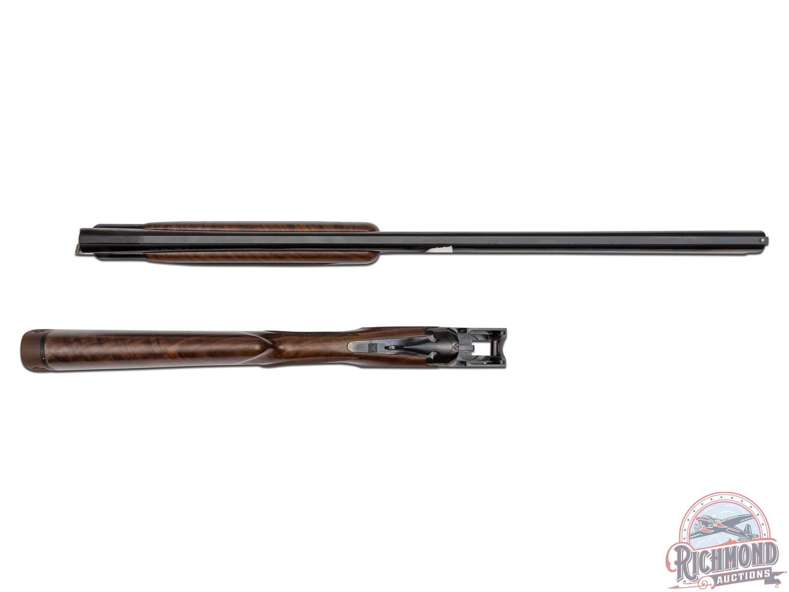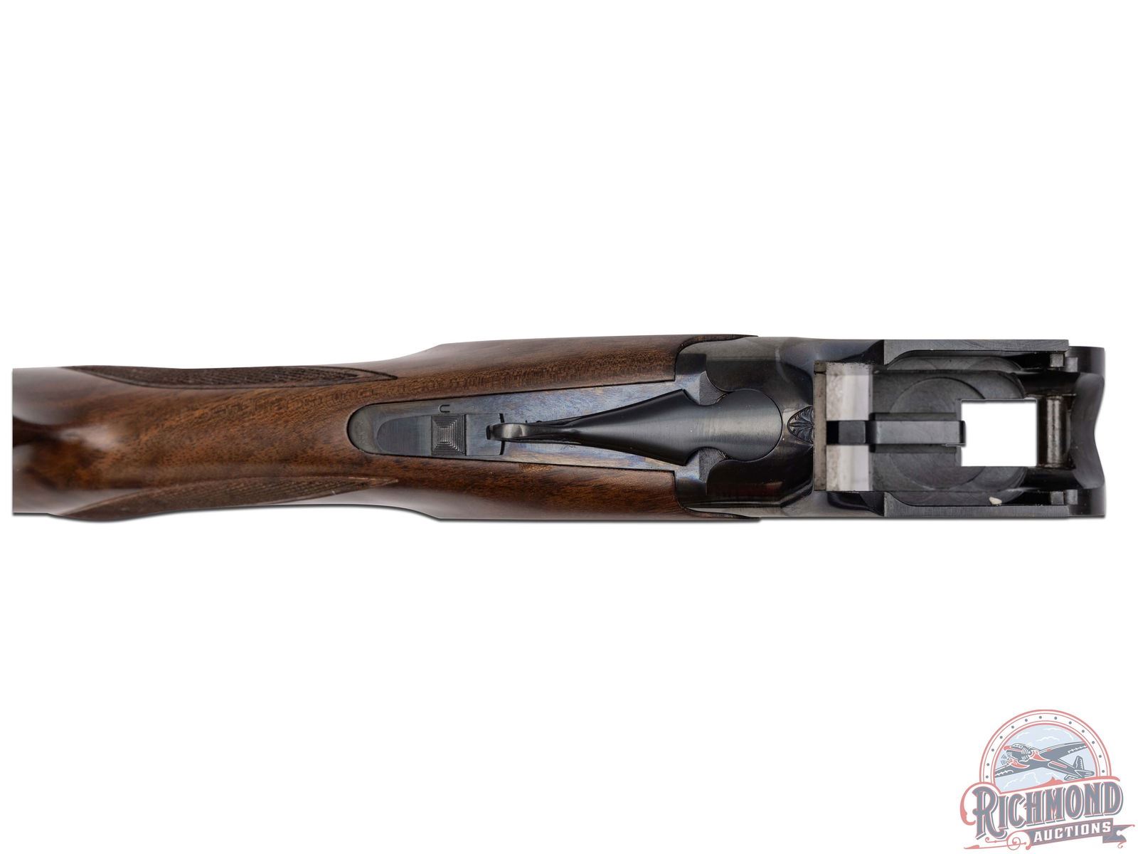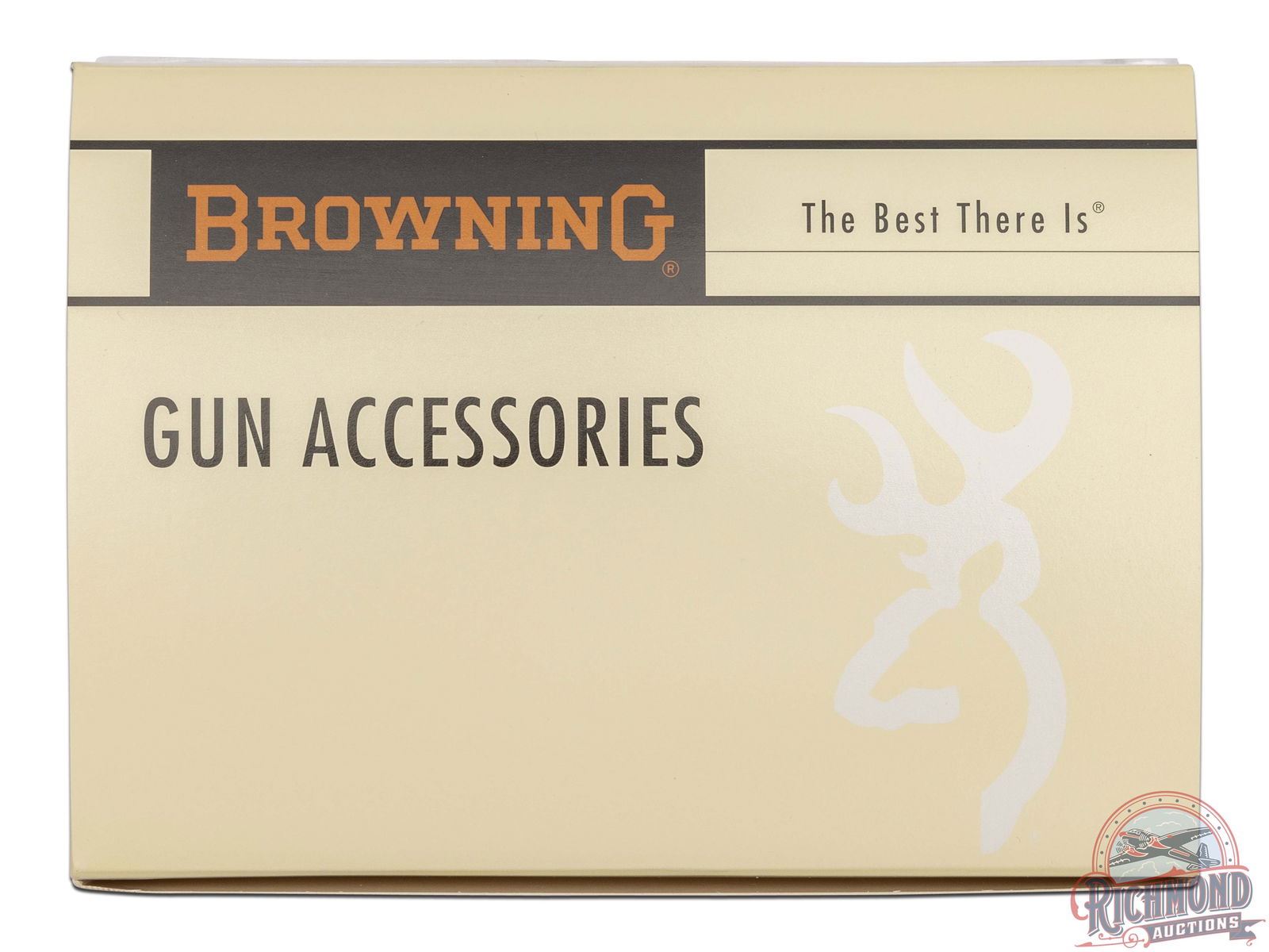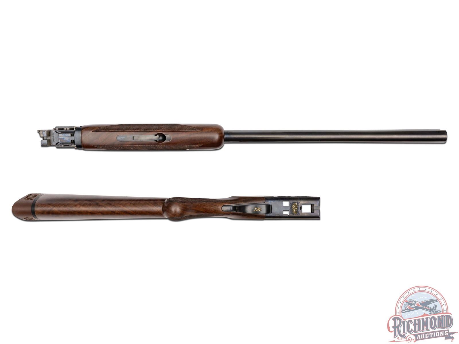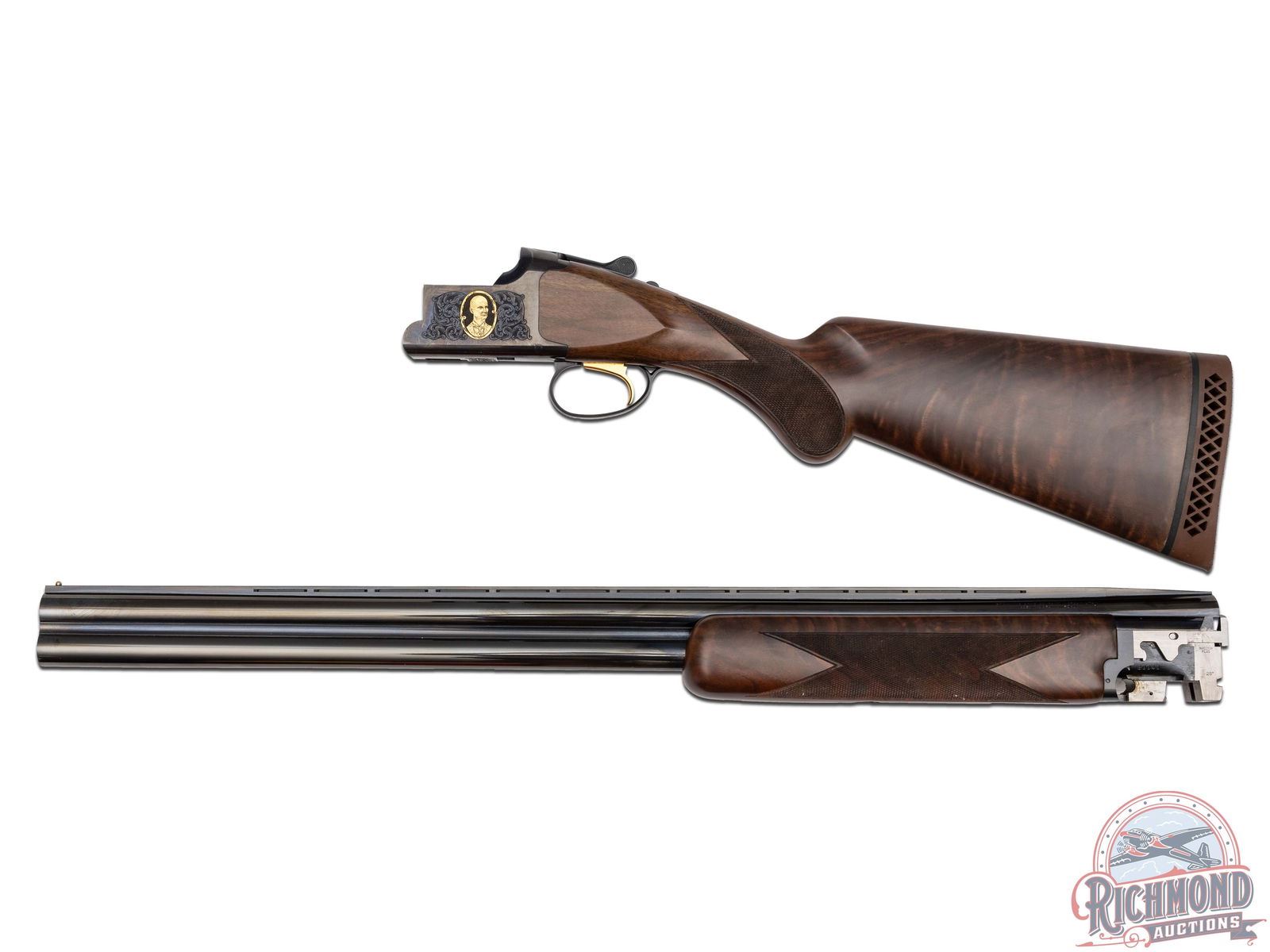 Manufactured in 2004 to commemorate the 150th year of Browning Arms. Features 28" blued barrels with ventilated rib, chambered for 2-3/4" and 3" shells with Invector Plus choke system and nickel bead front sight. Polished blued action with an oval gold portrait of John Browning on both sides surrounded with scroll floral engraving. Bottom of the receiver shows a facsimile signature of John M. Browning in gold with the years "1885 and 2005" superimposed above a gold "150 Years". Crossbolt safety and gold washed trigger with Browning Buck logo stamped on the bottom of the guard in gold. High grade walnut round knob, long tang stock with checkered pistol grip and matching forearm with checkering, all in a satin oil finish. Fitted with a factory brown ventilated recoil pad. Comes in the original Browning box with paperwork, choke wrench and lock. LOP: 14-1/8". DAC: 1-1/2". DAH: 2". CALIBER: 12 GA. S/N: 20043MV131. FFL STATUS: Modern.