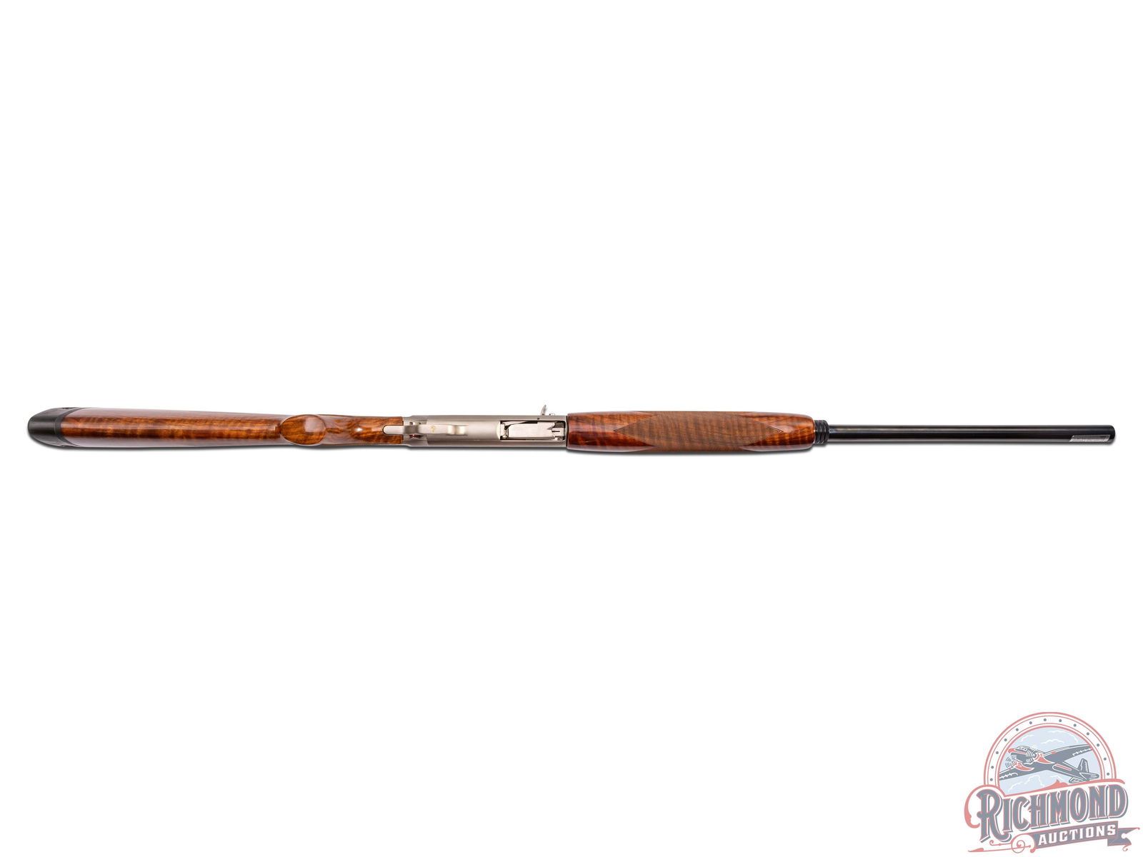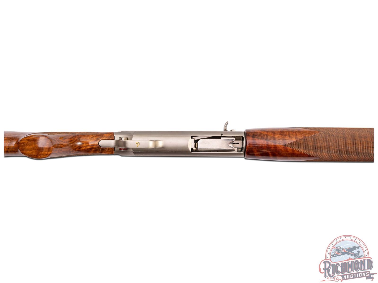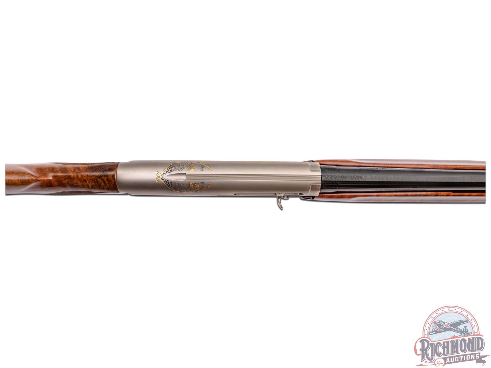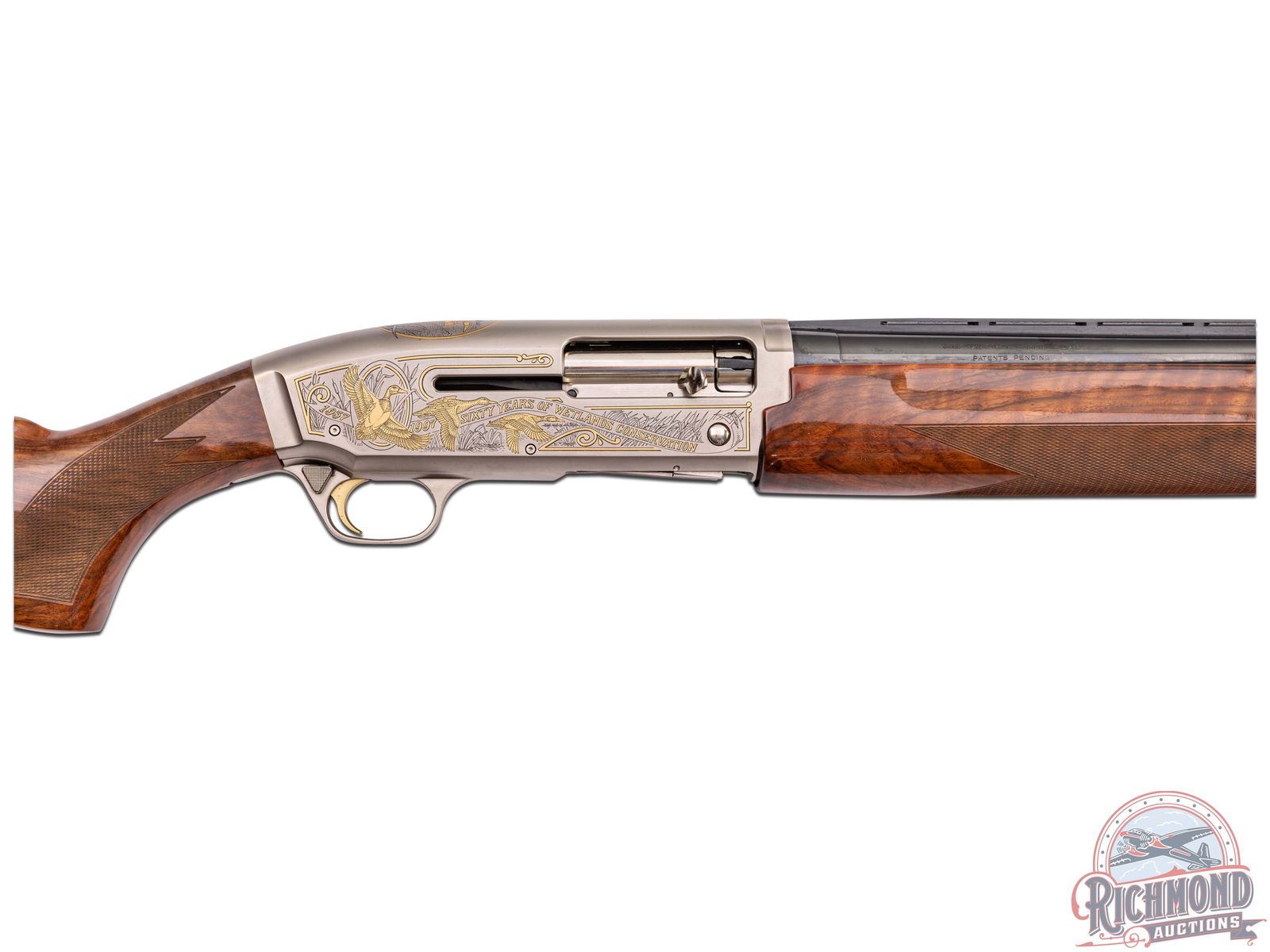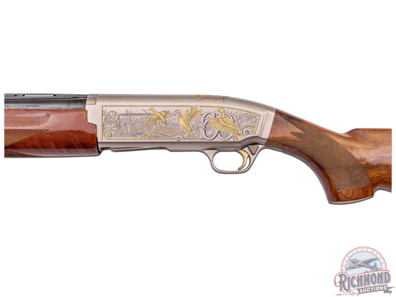 Made in Belgium and assembled in Portugal by Browning in 1997 for the 60th Anniversary of Ducks Unlimited. Fitted with removable blued 28" 12 gauge barrel with ventilated rib, bead front sight, Invector choke, and 3" chamber. Satin finished frame with gold trigger with gold washed duck scenes designed by artist Leon Burrows. Serial numbered in own range with gold washed Duck Head on trigger guard. Grade III walnut checkered pistol grip stock with Browning ventilated rubber recoil pad. Matching checkered walnut forearm with blued barrel fastening knob. Comes in brown plastic "Ducks Unlimited" marked case. LOP: 14-1/2". DAC: 1-1/2". DAH: 2". CALIBER: 12 GA. S/N: 060DU00557. FFL STATUS: Modern.