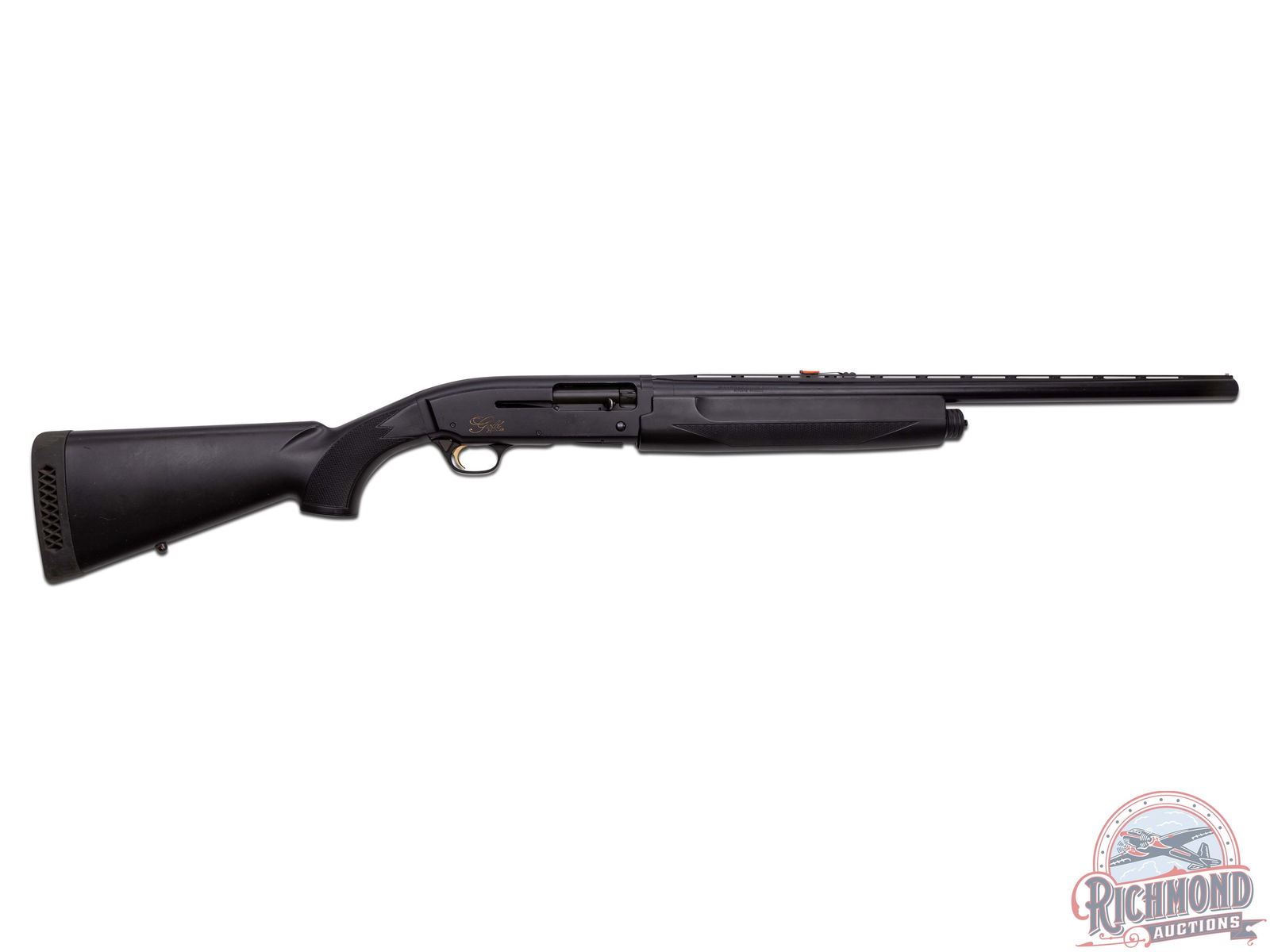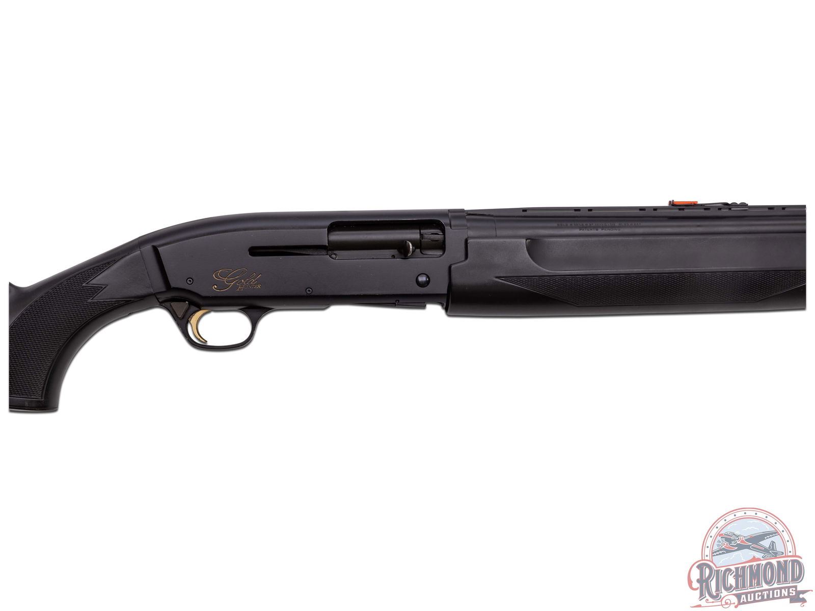 Manufactured in 1998. This great feather hunter features a 24" ventilated rib barrel in matte black chambered for 3" shells with modified choke. Rear adjustable red fiber optic and white bead front sight. Magazine tube holds up to 4 rounds of 2-3/4" shells. Gold washed trigger and crossbolt safety. Black synthetic stock and forearm with checkering. Factory ventilated rubber recoil pad. Comes in a factory Gold Hunter box, non-matching serial number. LOP: 14-1/4". DAC: 1-3/4". DAH: 2". CALIBER: 12 GA. S/N: F51NP47805. FFL STATUS: Modern.