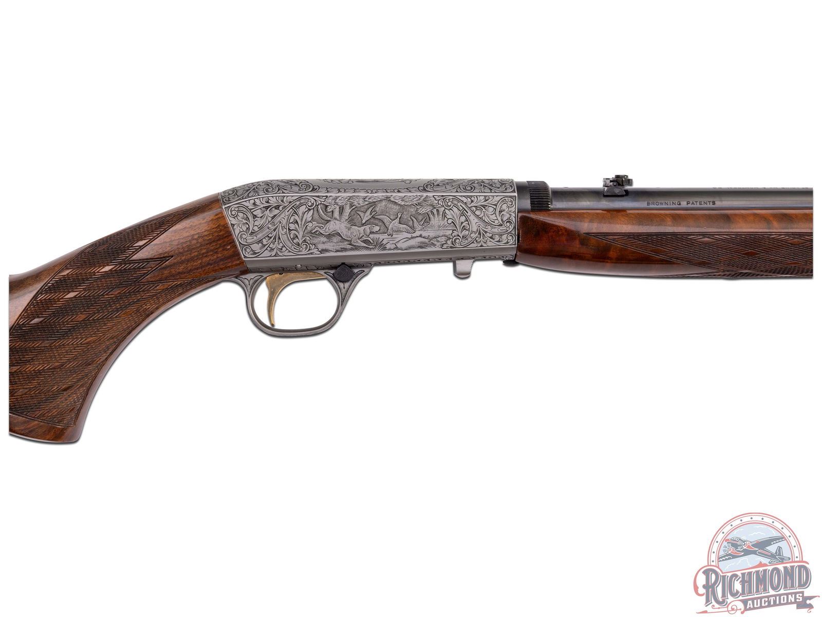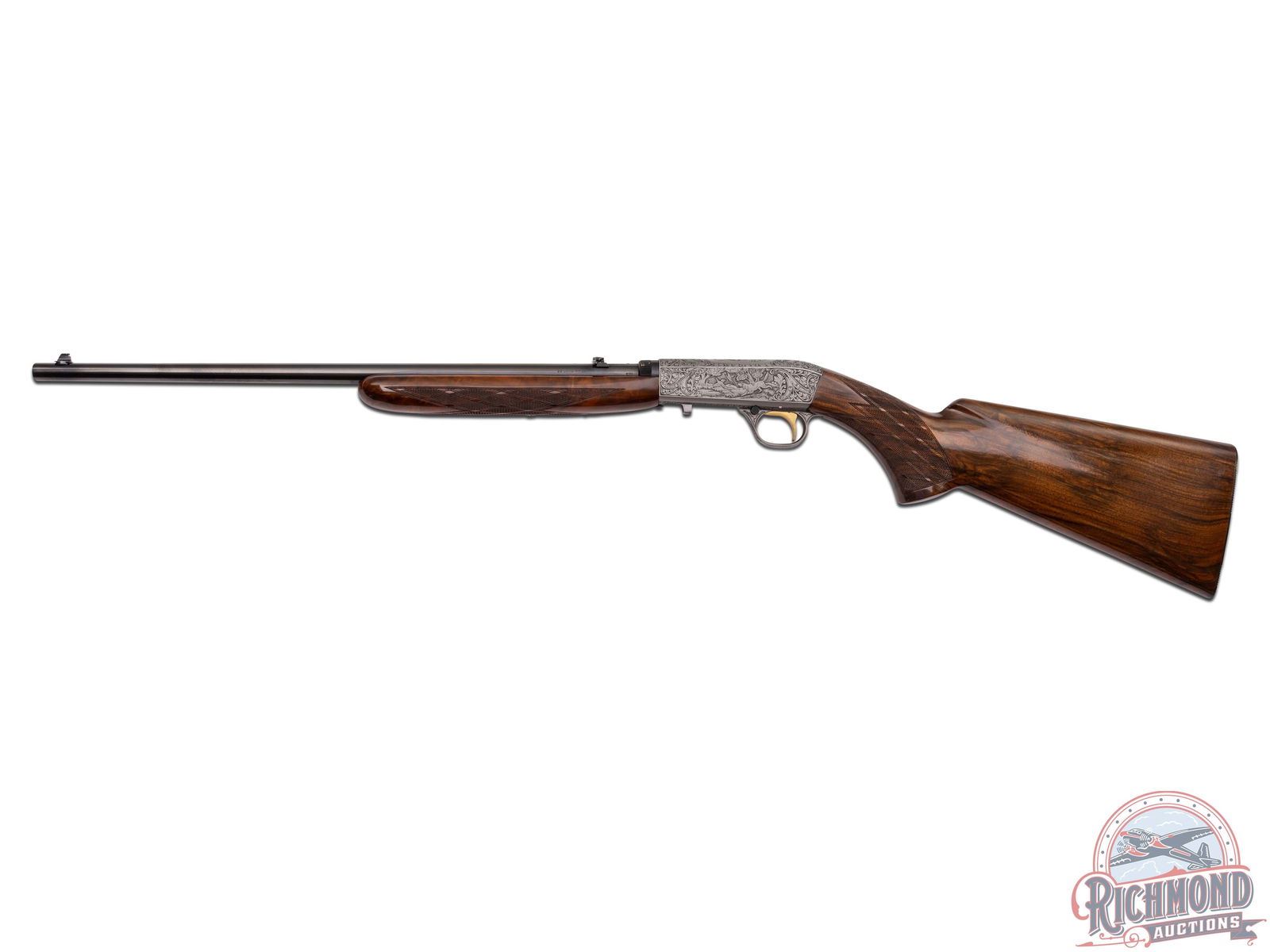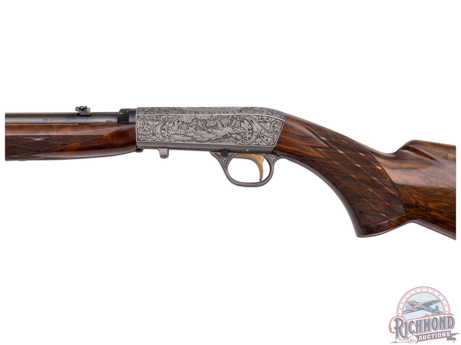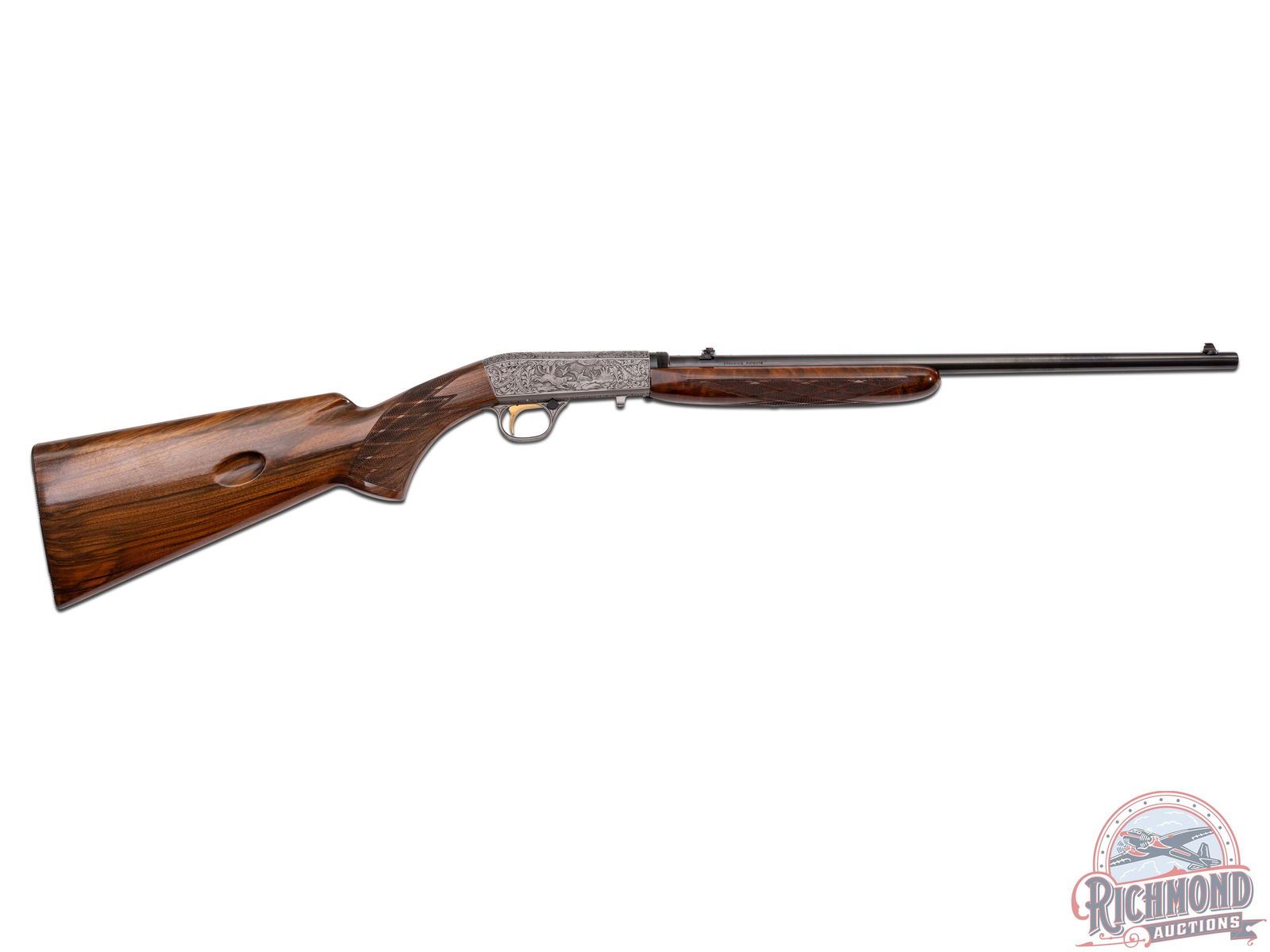 Made in Herstal, Belgium by Browning in 1969. 19-1/4" blued round fluid steel barrel with bead front sight and rear flip down notch sight with factory drilled scope holes and Browning Patent and St. Louis, Missouri and Montreal addresses marking in 22 Long Rifle. Satin finished takedown receiver with deep chisel Grade III setter and duck scene on right side and setter and pheasant scene on left with "L. Severin" engraver's signature with top having floral and dog and bird scene. Gold washed trigger with push button safety. High lustre finished walnut pistol grip stock with skip-line checkering and sideloading port with blued serrated steel butt plate and loading tube. Matching walnut skip-line checkered forearm with single screw attachment. LOP: 14". DAC: 1-3/8". DAH: 2-5/8". CALIBER: 22LR. S/N: 69T32629. FFL STATUS: Curio & Relic.