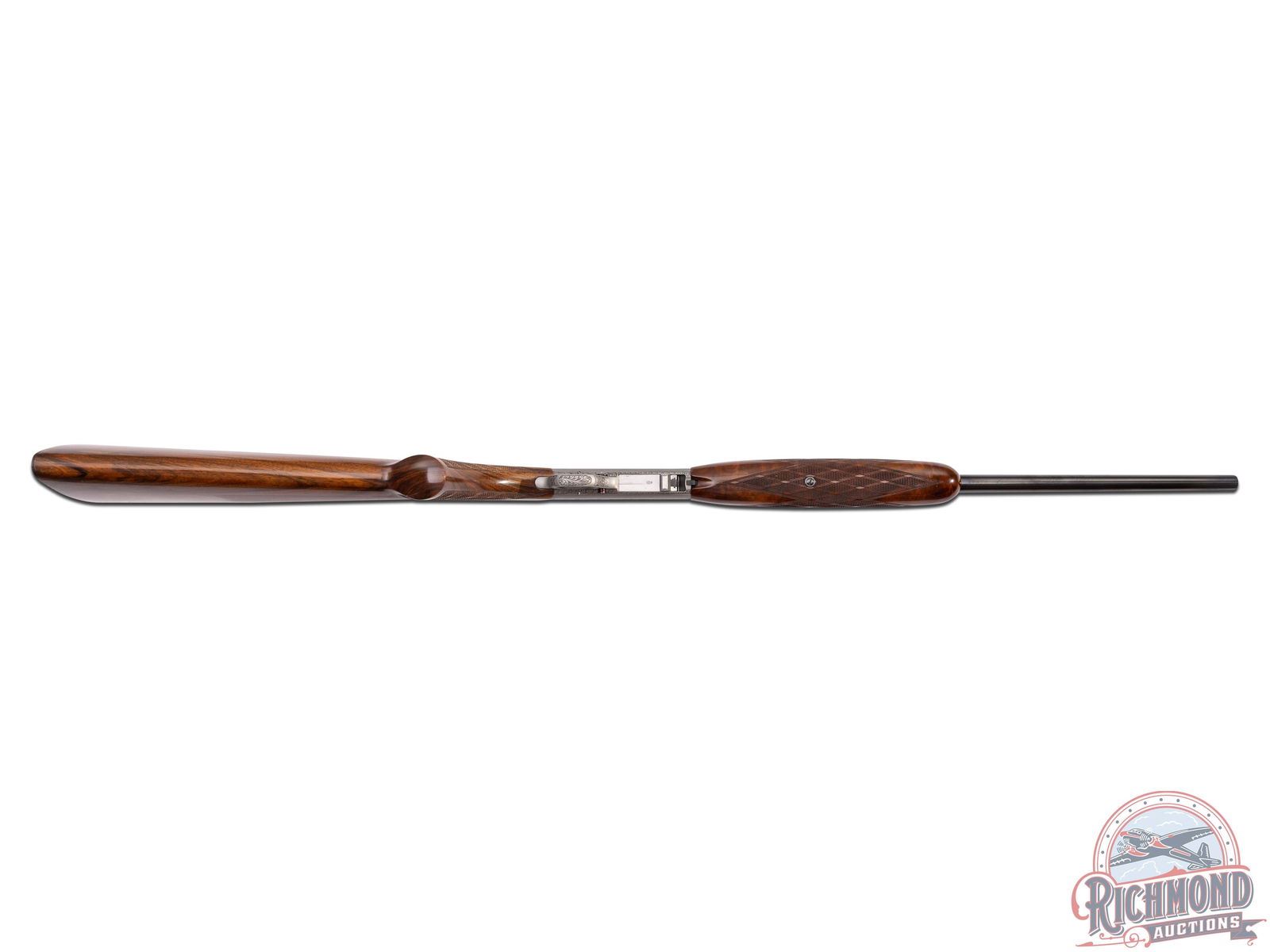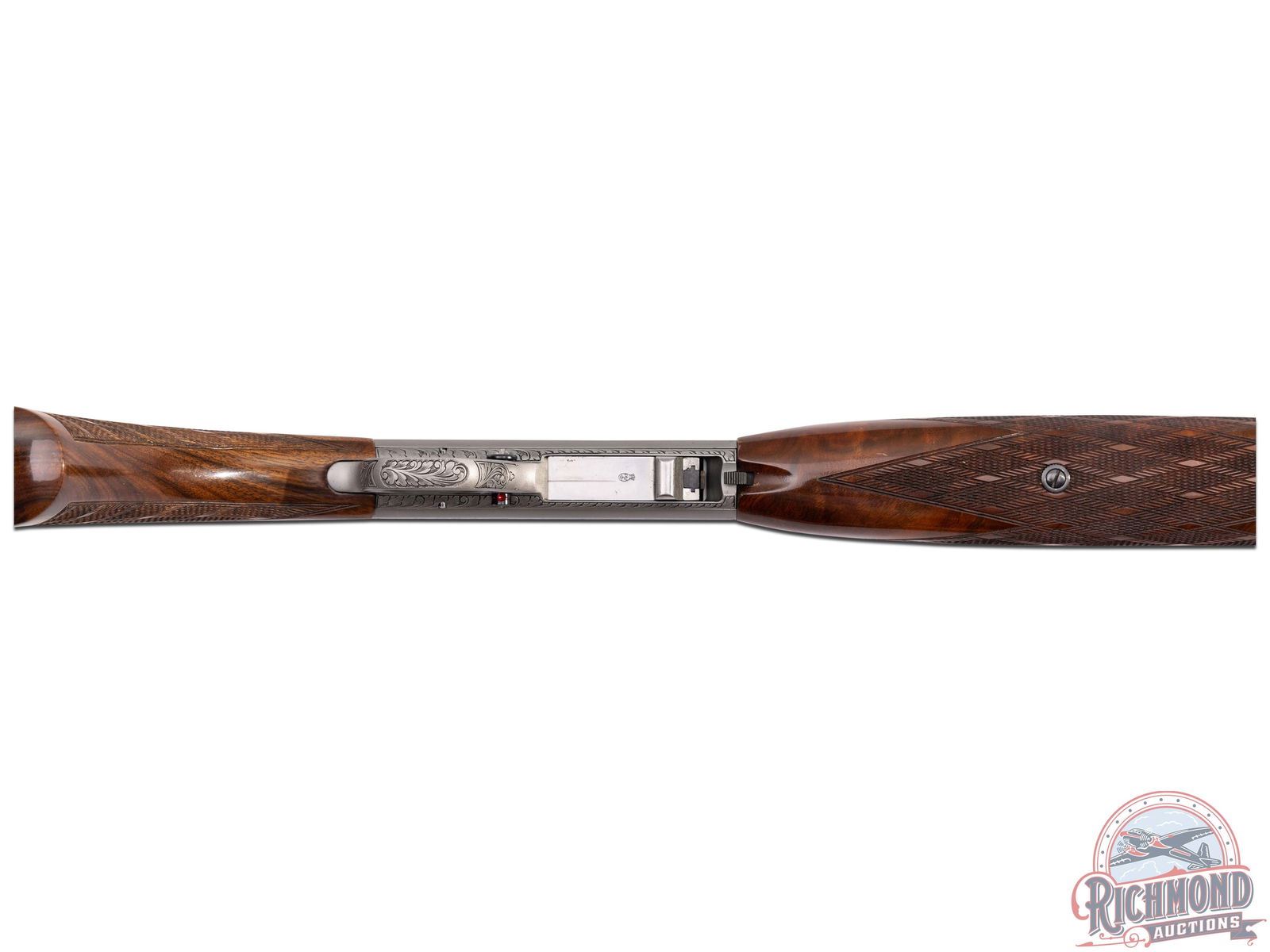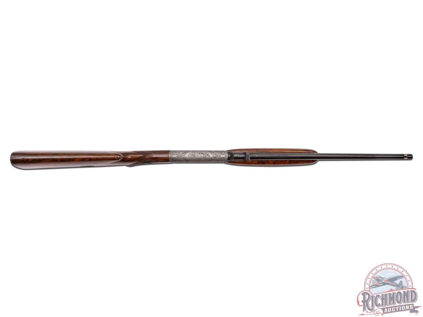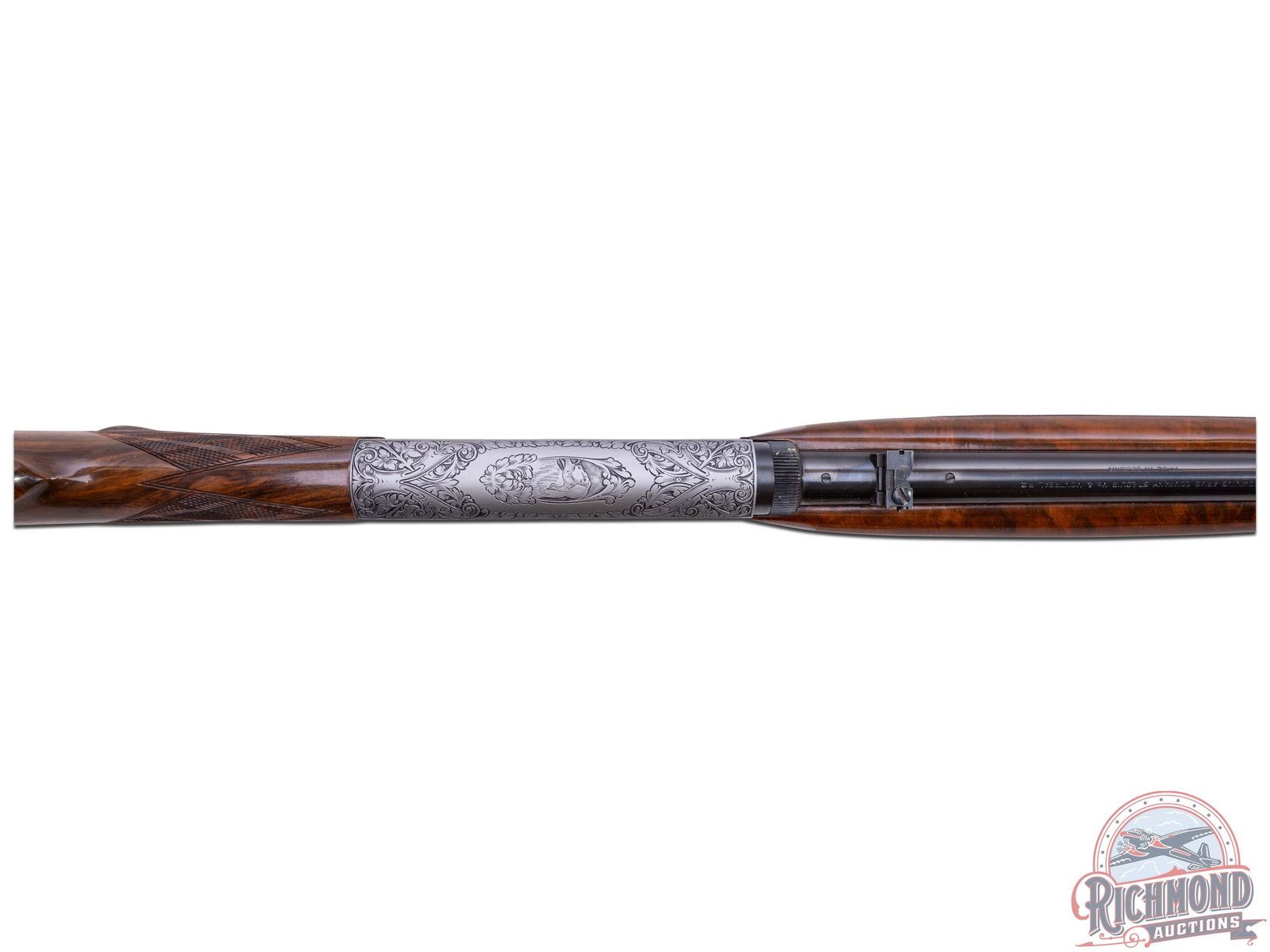 Made in Herstal, Belgium by Browning in 1969. 19-1/4" blued round fluid steel barrel with bead front sight and rear flip down notch sight with factory drilled scope holes and Browning Patent and St. Louis, Missouri and Montreal addresses marking in 22 Long Rifle. Satin finished takedown receiver with deep chisel Grade III setter and duck scene on right side and setter and pheasant scene on left with "L. Severin" engraver's signature with top having floral and dog and bird scene. Gold washed trigger with push button safety. High lustre finished walnut pistol grip stock with skip-line checkering and sideloading port with blued serrated steel butt plate and loading tube. Matching walnut skip-line checkered forearm with single screw attachment. LOP: 14". DAC: 1-3/8". DAH: 2-5/8". CALIBER: 22LR. S/N: 69T32629. FFL STATUS: Curio & Relic.