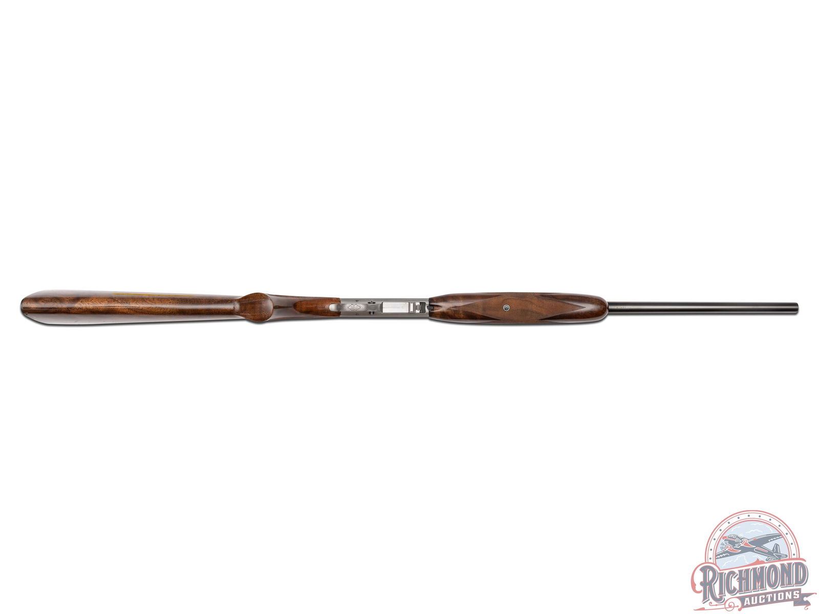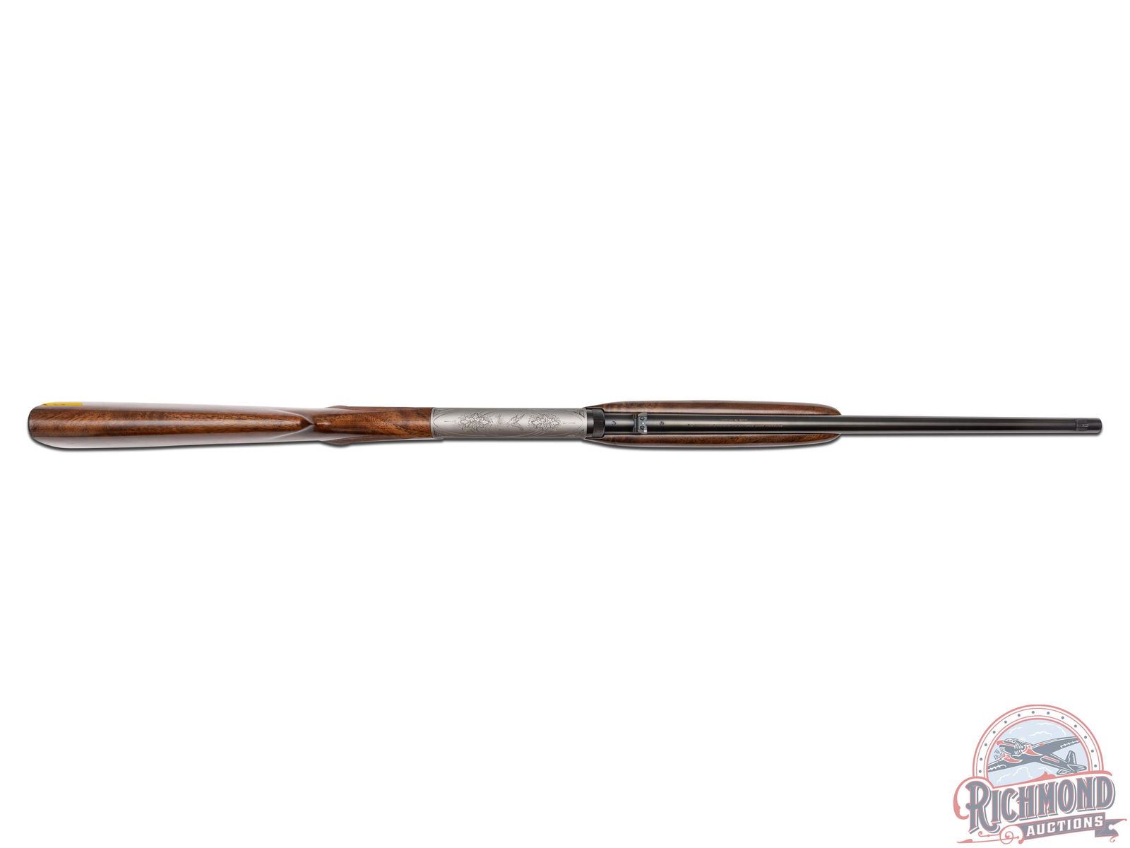 Manufactured in 1970 by FN in Belgium. Features a 19-1/4" blued round barrel stamped with single line Browning address highlighted in gold tone. Flip-up rear notch adjustable sight and blade with brass bead front sight. Coin finished receiver features Master Engraver Angelo Bee signed work. Left side features two groundhogs in a field in an oval border with grape leaf design and signed "A.BEE". Top of the receiver features a duck centered of a grape leaf design. Right side features two squirrels on a tree limb in an oval border with grape leaf design. Bottom of the trigger guard engraved with the same grape leaf design. Gold washed trigger and crossbolt safety. Grade II walnut high gloss stock and forearm with hand-checkered pistol grip and base of forearm. Comes in the original factory take-down case. CALIBER: 22 LR. S/N: 70T46470. FFL STATUS: Curio & Relic.