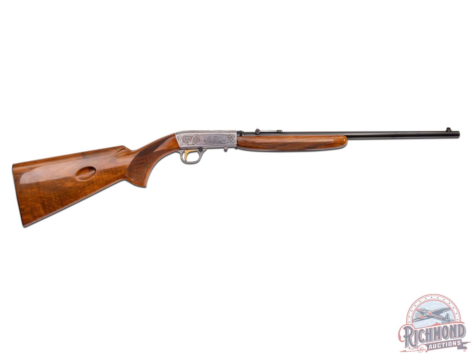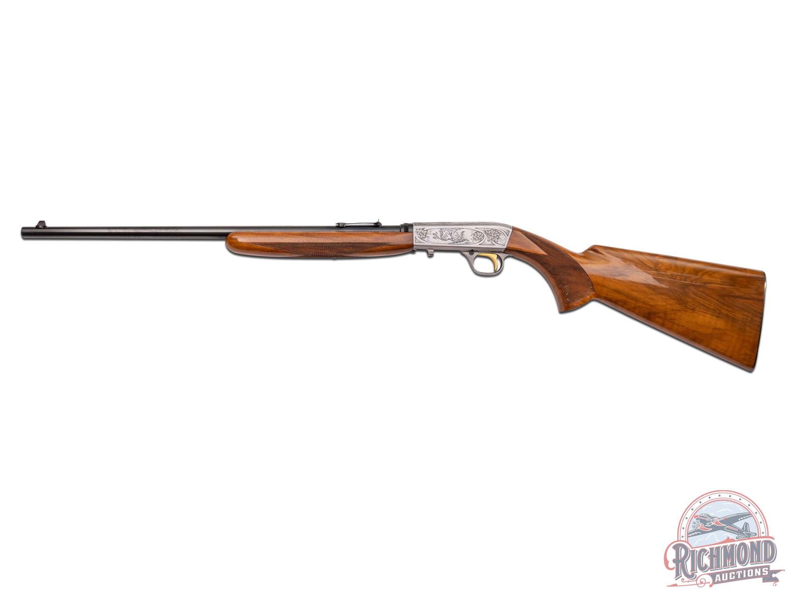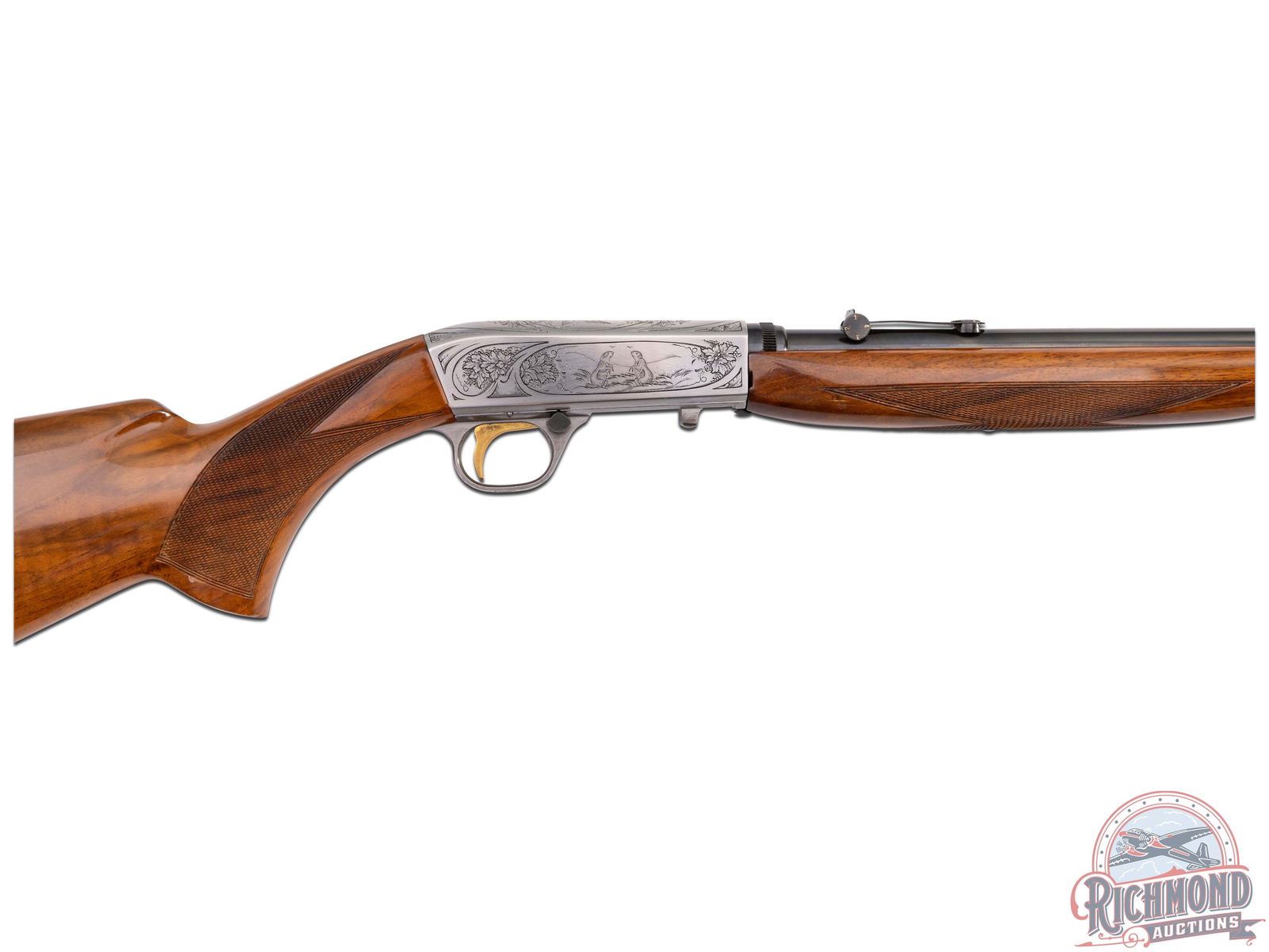 Made in Herstal, Belgium by Browning in 1958. Early Browning SA engraved by Master Engraver Angelo Bee. Rifle to be pictured in up and coming Angelo Bee Engraving Book. 19-1/4" blued round barrel with bead pedestal front sight and "Wheel" rear sight with early Fabrique National address in 22 Long Rifle smokeless caliber. Satin finished takedown action with Grade II squirrels and prairie dog engraving and signed on left action panel "A.Bee". Gold washed trigger with blued push button safety. Light tone walnut checkered pistol grip stock with side loading port and blued serrated steel butt plate with tube magazine. Matching walnut checkered swelled forearm with single attachment screw. LOP: 13-3/4". DAC: 1-3/16". DAH: 2-5/8". CALIBER: 22LR. S/N: 35689. FFL STATUS: Curio & Relic.