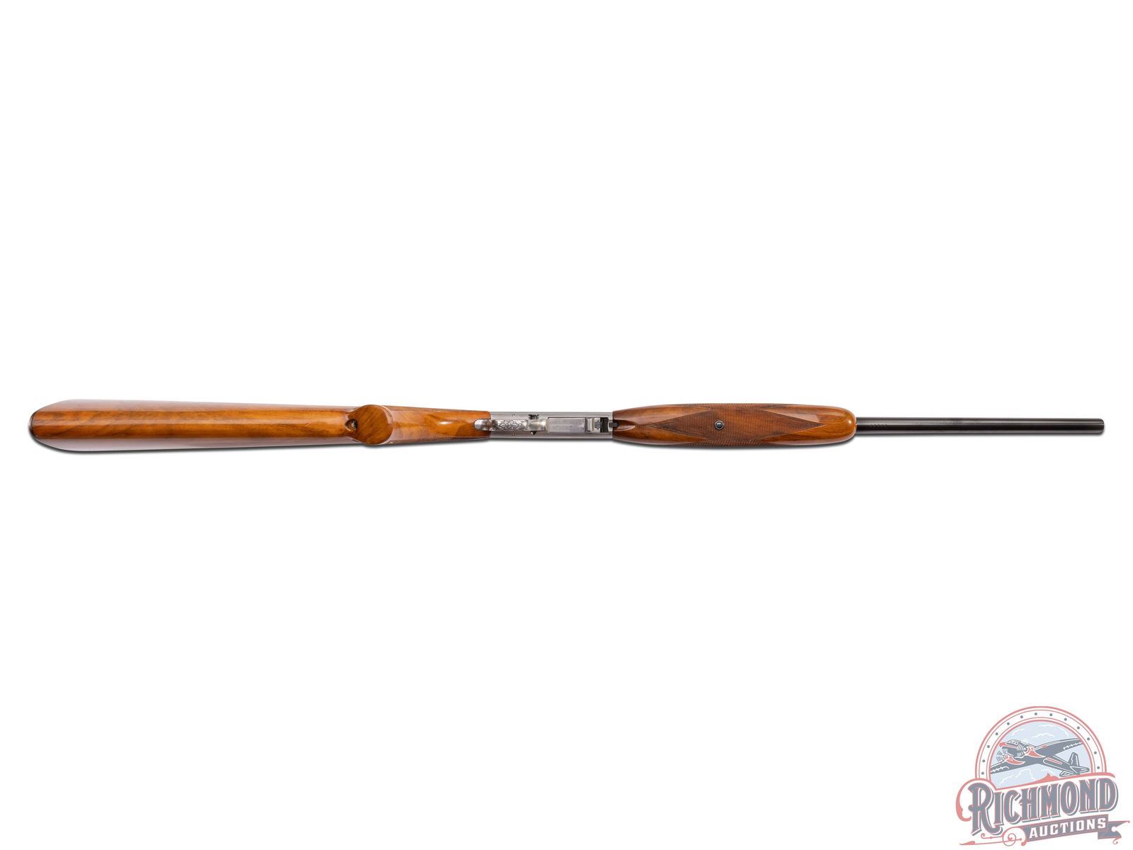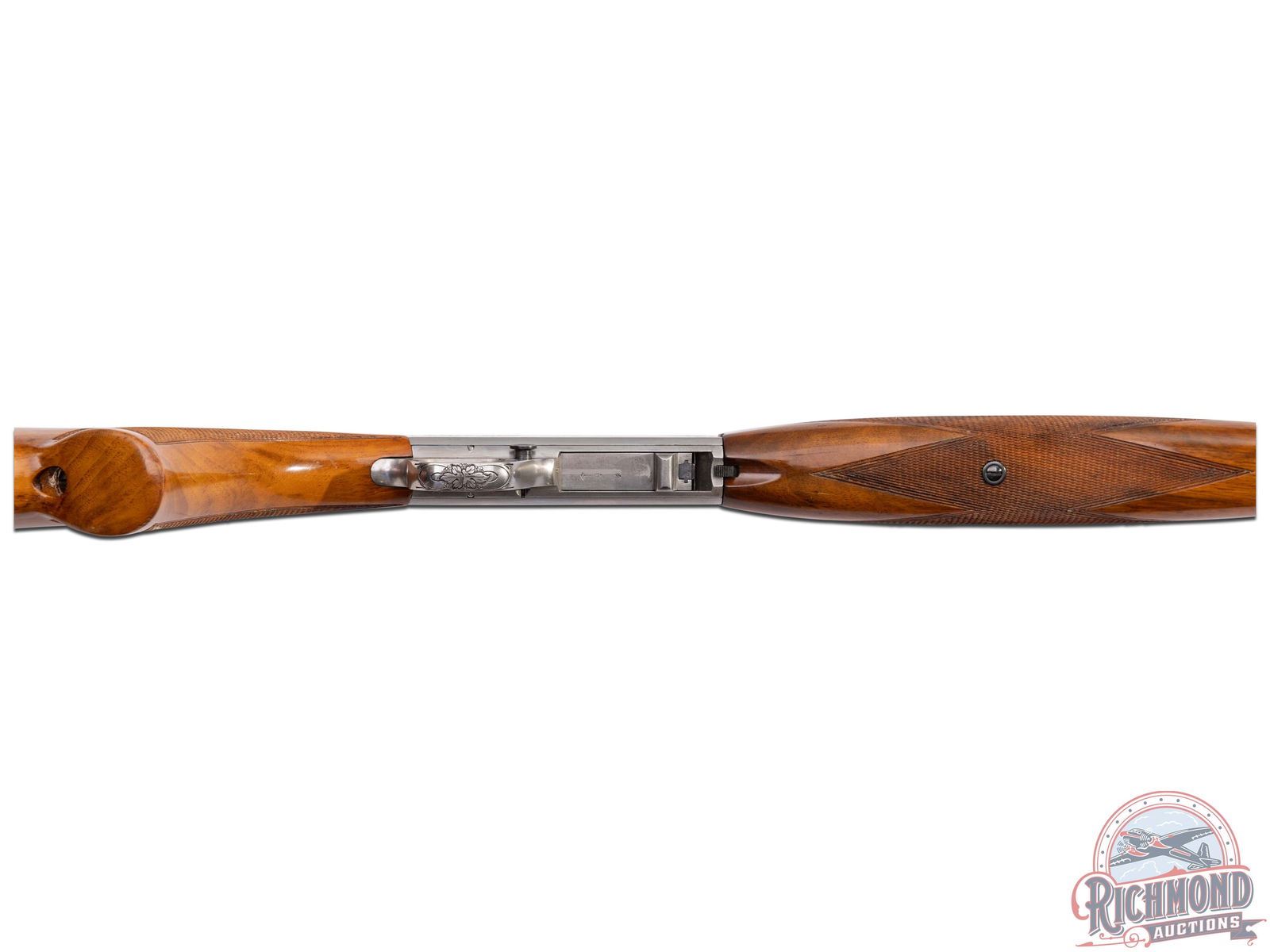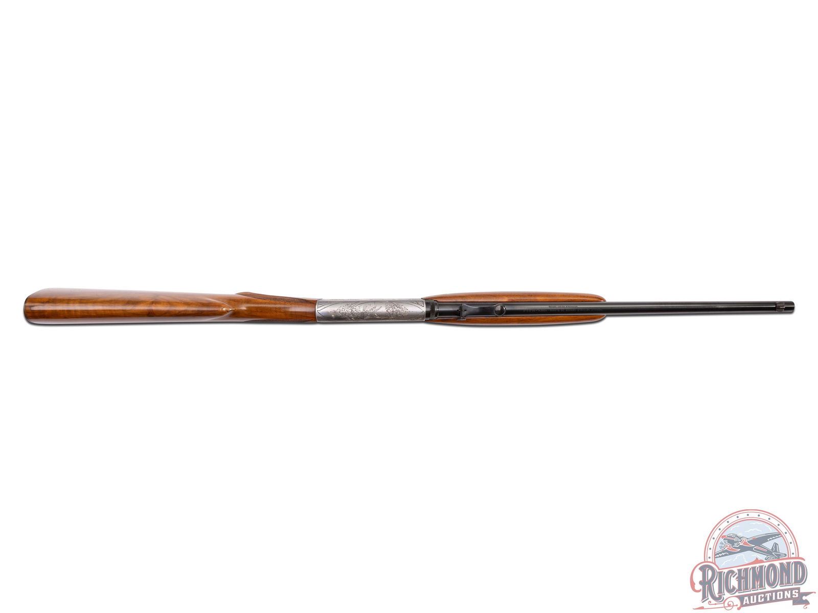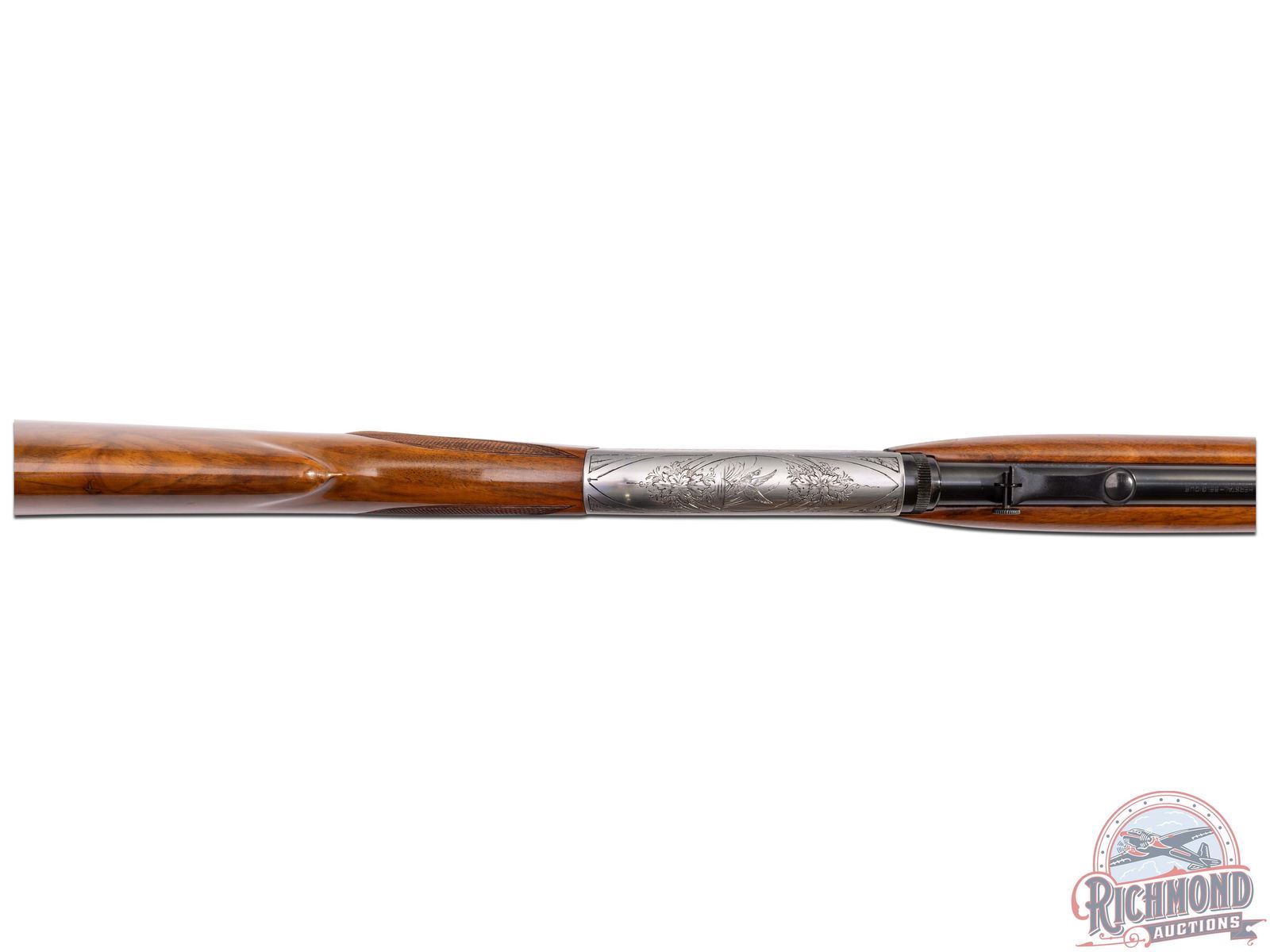 Made in Herstal, Belgium by Browning in 1958. Early Browning SA engraved by Master Engraver Angelo Bee. Rifle to be pictured in up and coming Angelo Bee Engraving Book. 19-1/4" blued round barrel with bead pedestal front sight and "Wheel" rear sight with early Fabrique National address in 22 Long Rifle smokeless caliber. Satin finished takedown action with Grade II squirrels and prairie dog engraving and signed on left action panel "A.Bee". Gold washed trigger with blued push button safety. Light tone walnut checkered pistol grip stock with side loading port and blued serrated steel butt plate with tube magazine. Matching walnut checkered swelled forearm with single attachment screw. LOP: 13-3/4". DAC: 1-3/16". DAH: 2-5/8". CALIBER: 22LR. S/N: 35689. FFL STATUS: Curio & Relic.